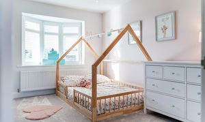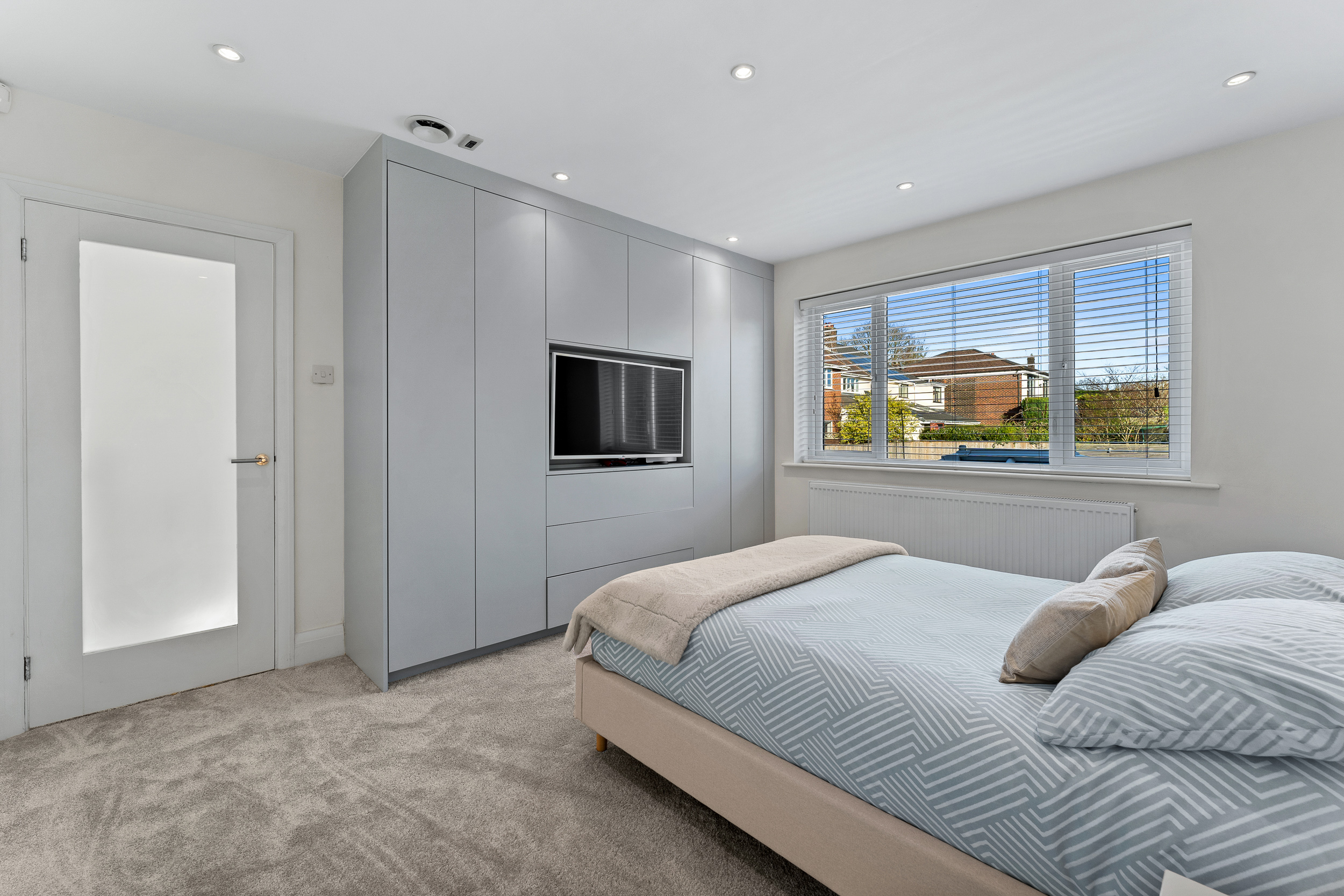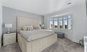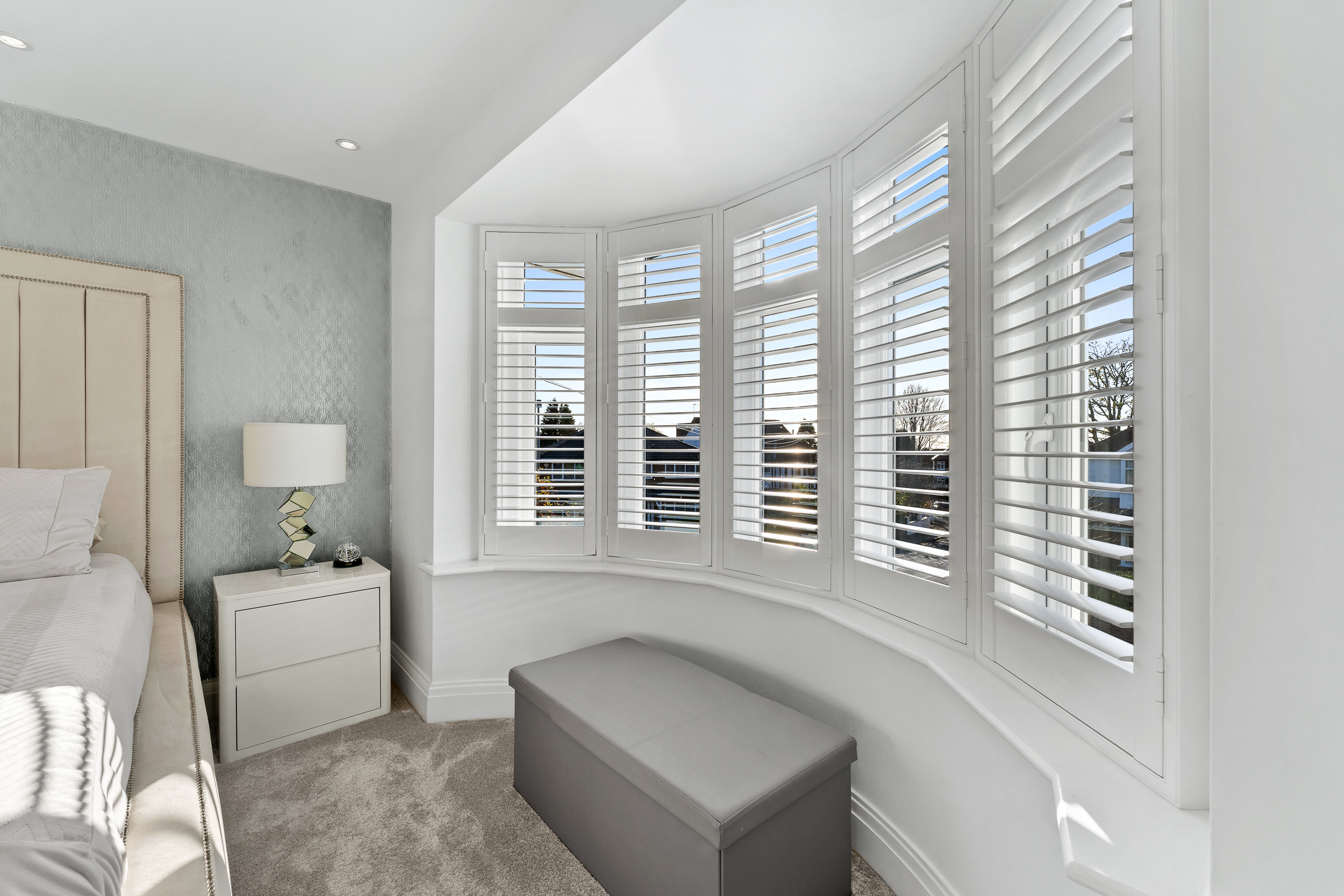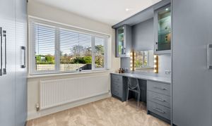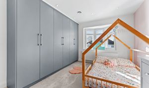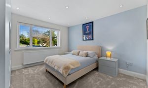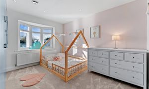 The principal bedroom sits to the front and enjoys a serene atmosphere enhanced by the plantation-shuttered bay window. There is ample room for a super king-size bed, and the neutral décor creates a calm, elegant space to unwind. A modern and spacious en suite adjoins the room, finished to a high standard with a large waterfall shower for a touch of everyday luxury. Peaceful, inviting, and beautifully presented, it’s a true retreat at the end of the day.