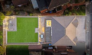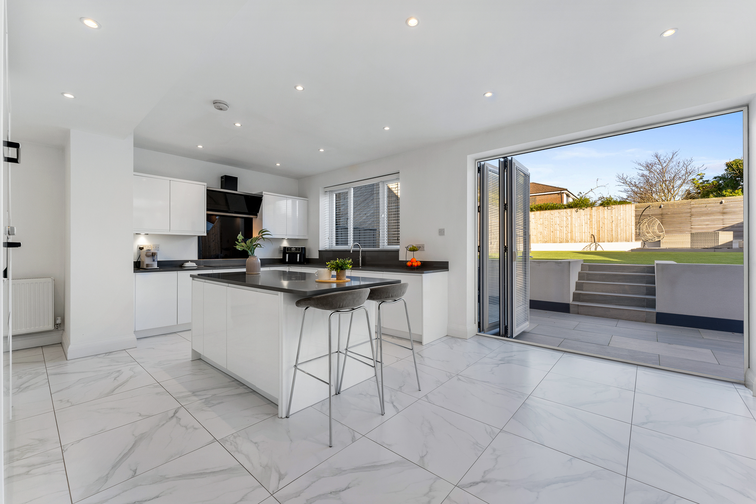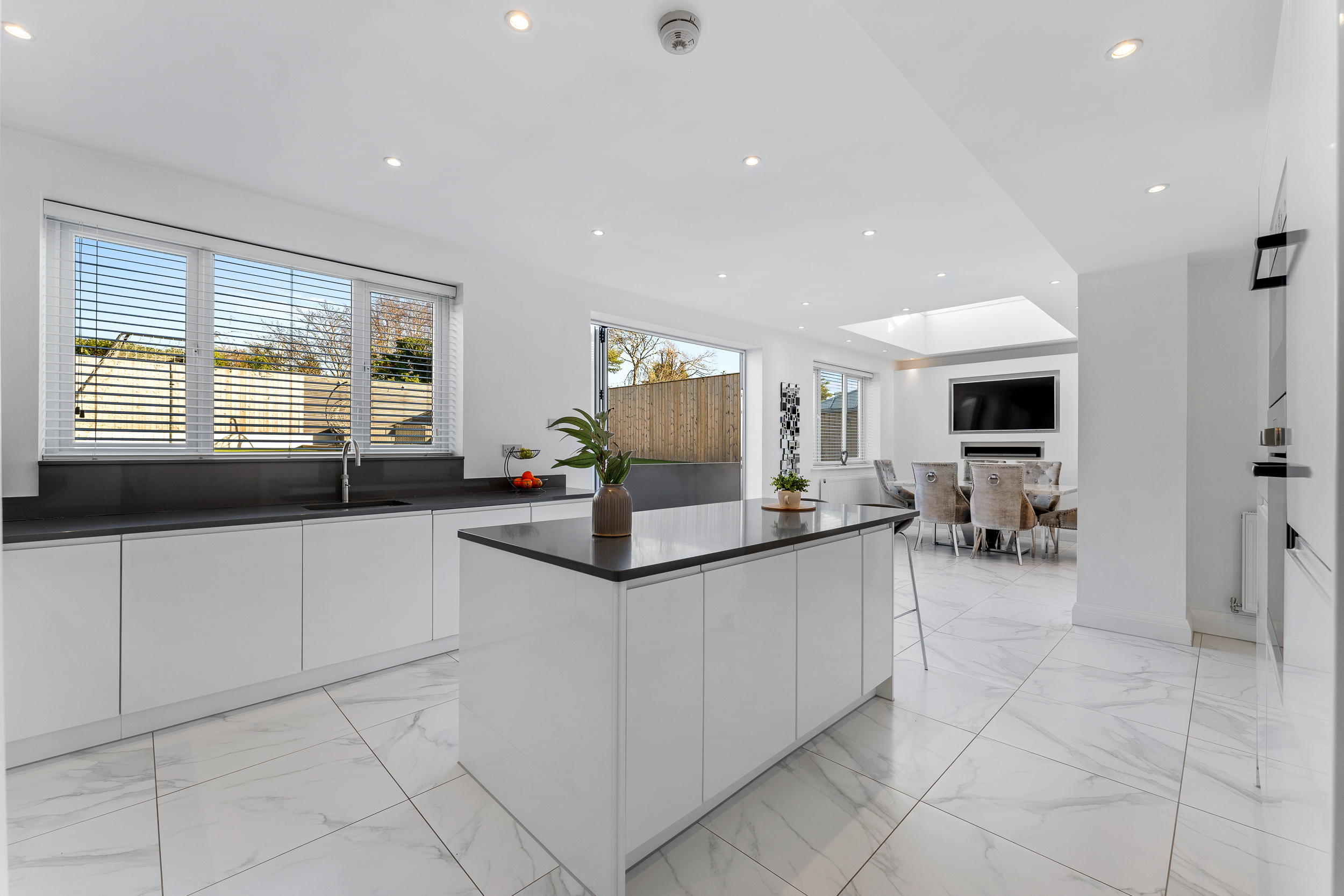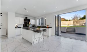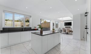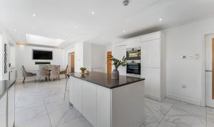 - Full-width open-plan kitchen and dining extension with lantern skylight and bi-fold doors
