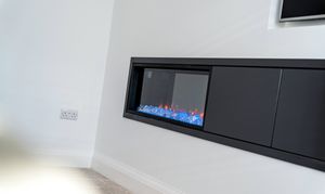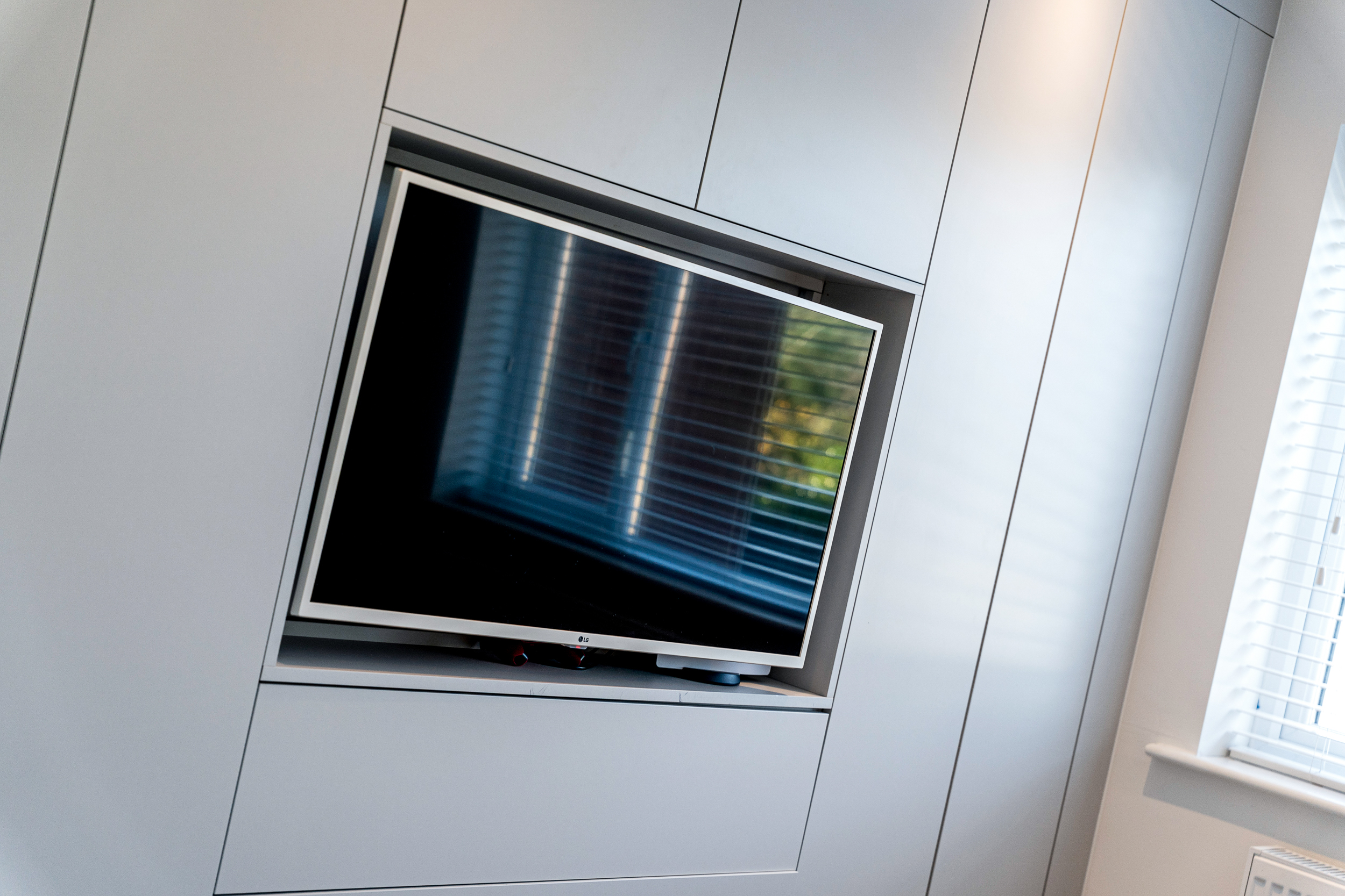 To the front of the home, the main lounge offers a sophisticated but inviting retreat. A broad bay window finished with plantation shutters fills the room with soft, natural light, while a bespoke media wall creates a striking focal point. With integrated storage, stylish shelving, and an inset electric fire, it’s a perfect space for cosy evenings or relaxed family downtime.
