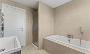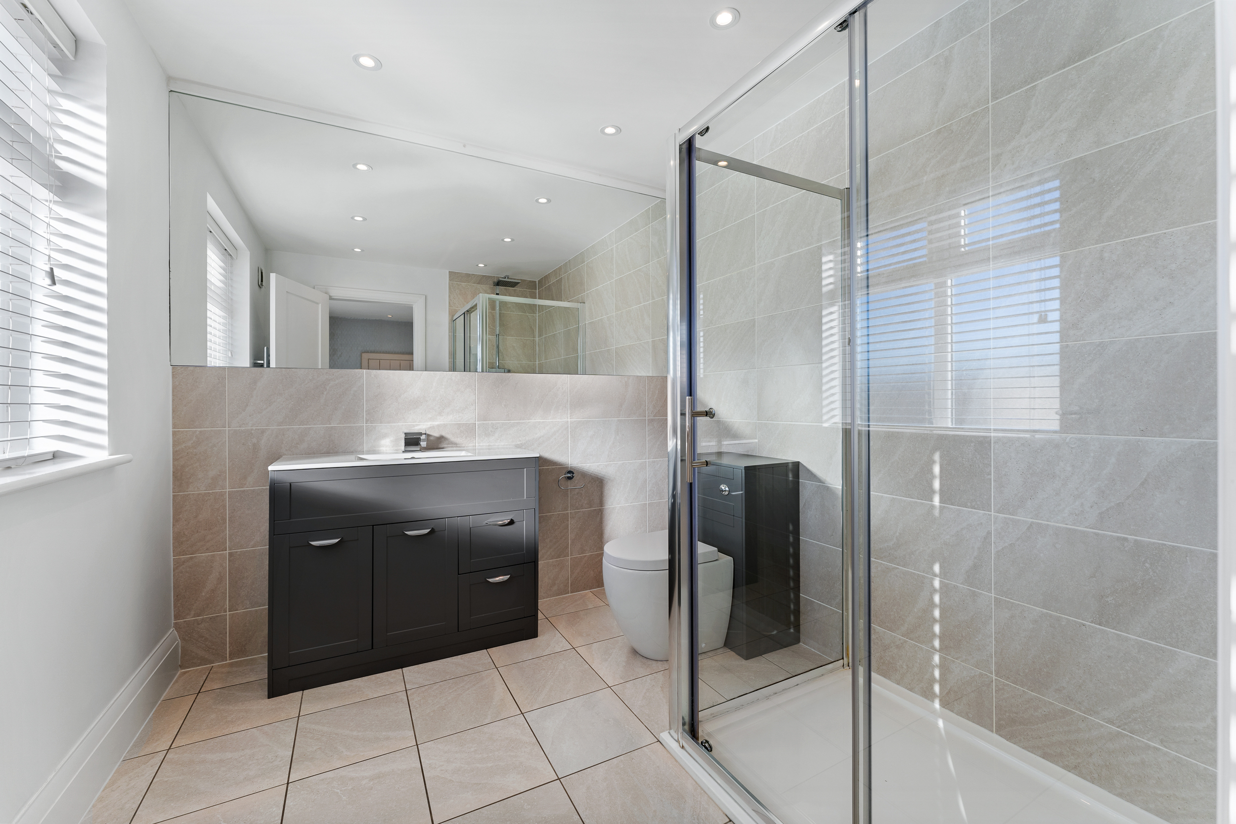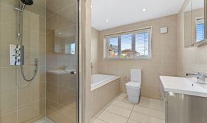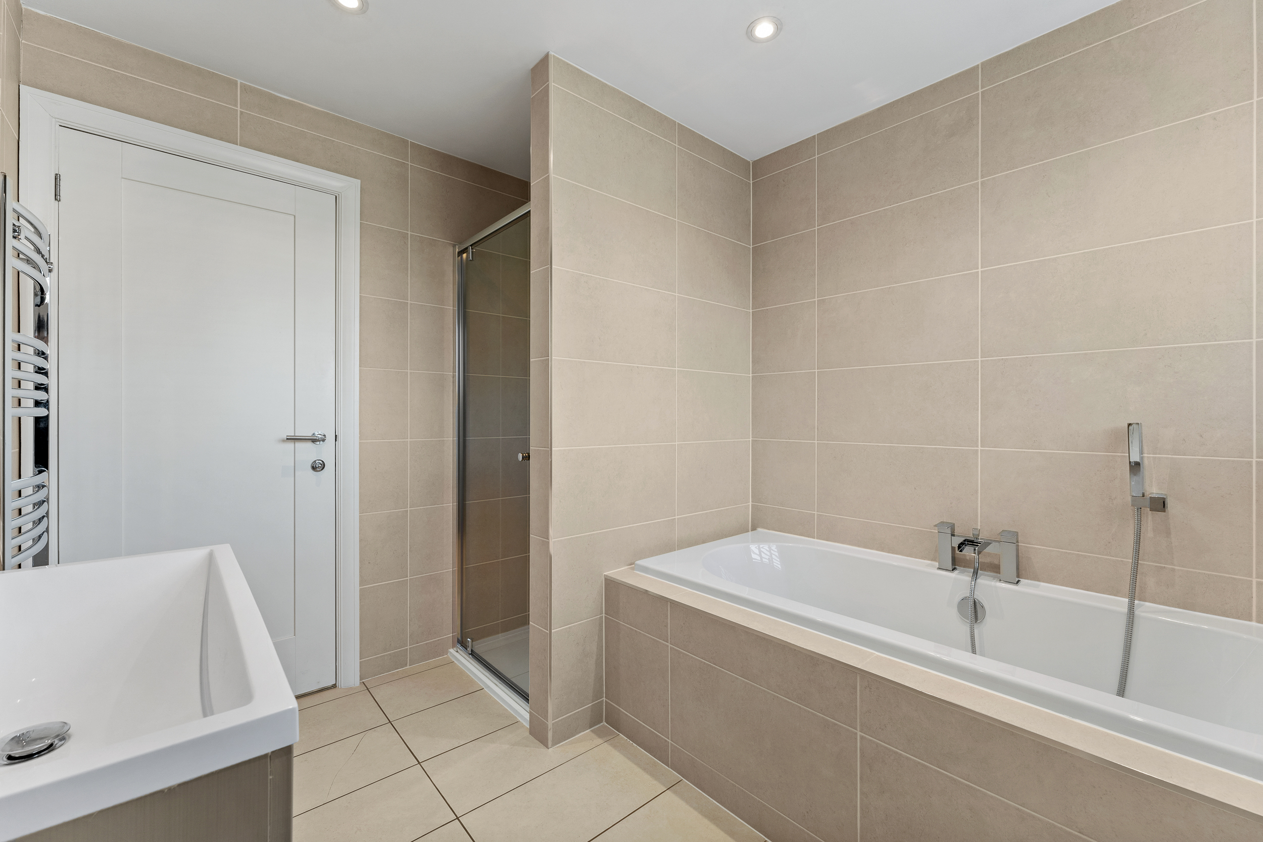 The family bathroom is modern, spacious, and neatly finished, offering both a practical walk-in shower and a separate bathtub - ideal for busy mornings or relaxed evenings. Fully tiled in warm neutral tones, it feels bright and contemporary, with clean lines, modern sanitaryware, and thoughtful lighting completing the space.
