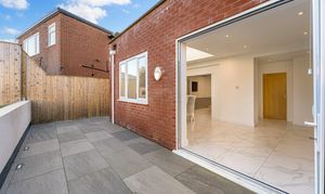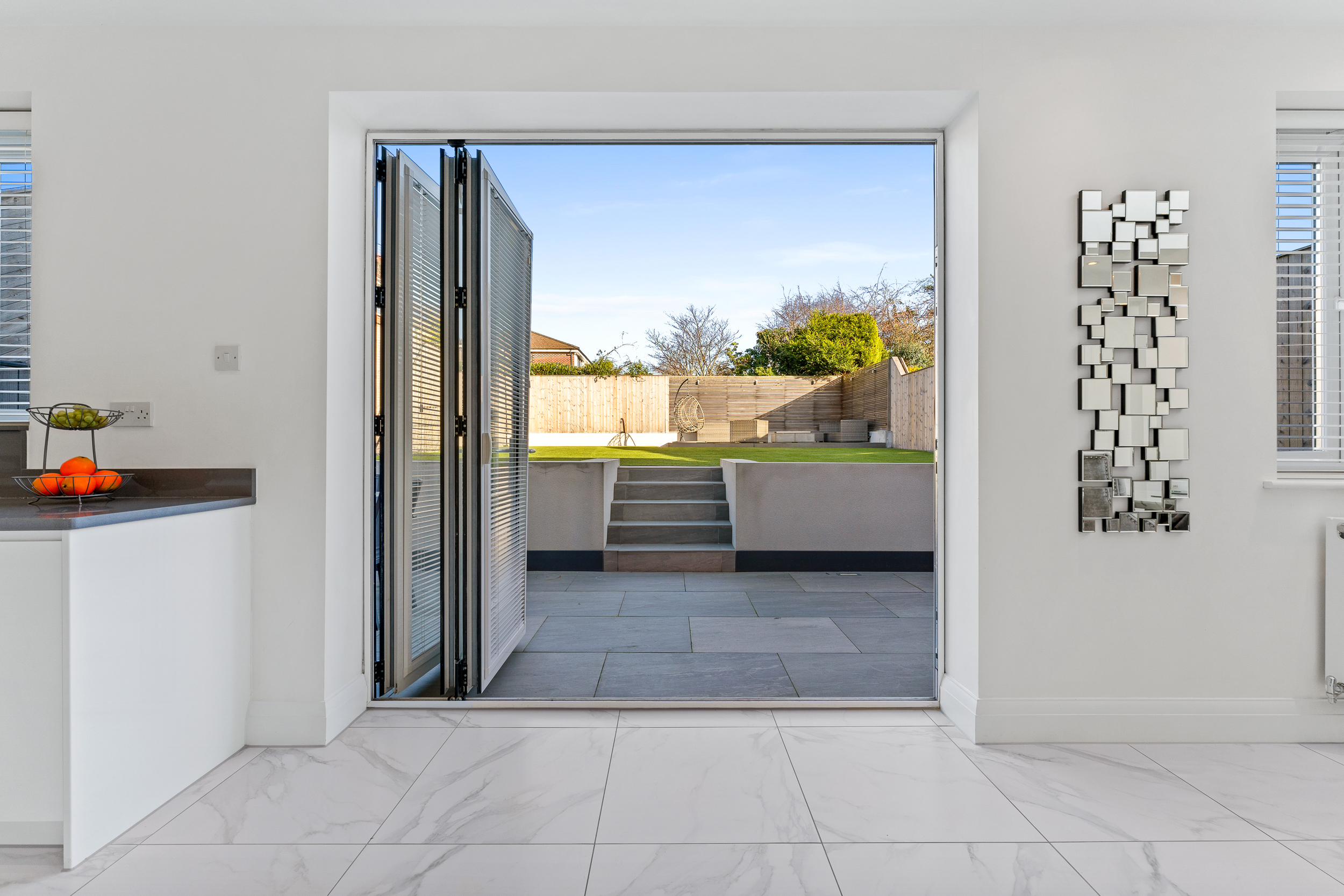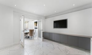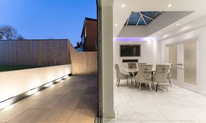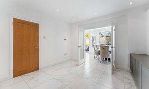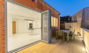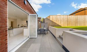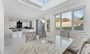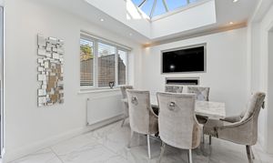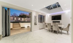 At the far end of the room, beneath a striking lantern skylight, the dedicated dining area becomes a natural focal point. Flooded with daylight throughout the day, it offers the perfect setting for family meals, larger gatherings, or relaxed entertaining. Wide bi-fold doors stretch across the rear elevation, opening directly onto the landscaped garden and creating a seamless indoor–outdoor flow - ideal for spring and summer living. Clean lines, bright décor, and underfloor heating across the entire space ensure comfort and style in equal measure.