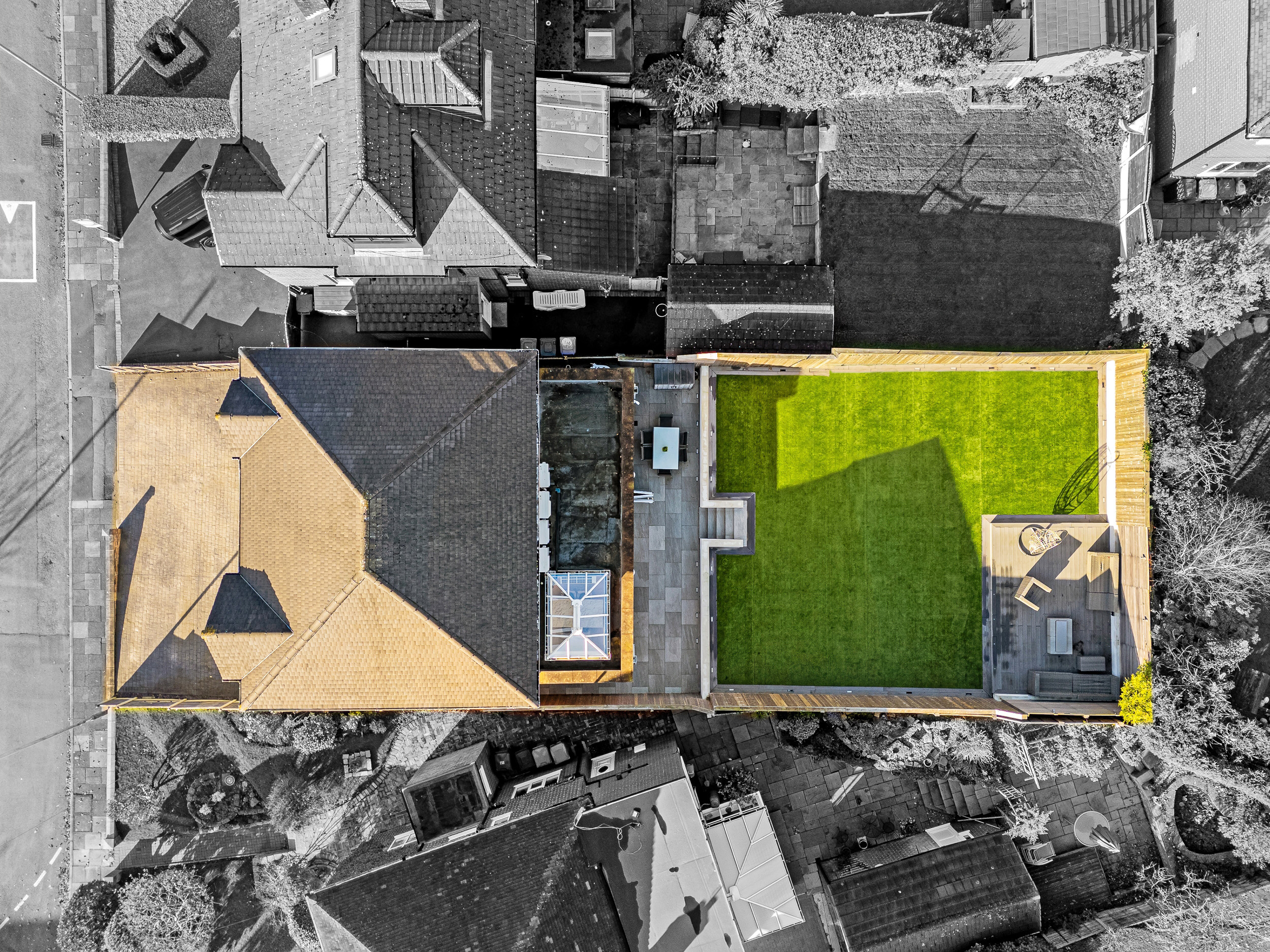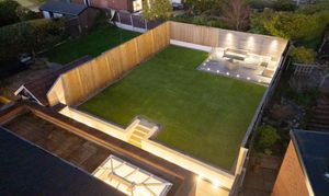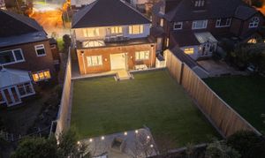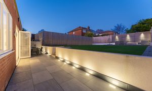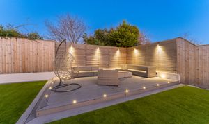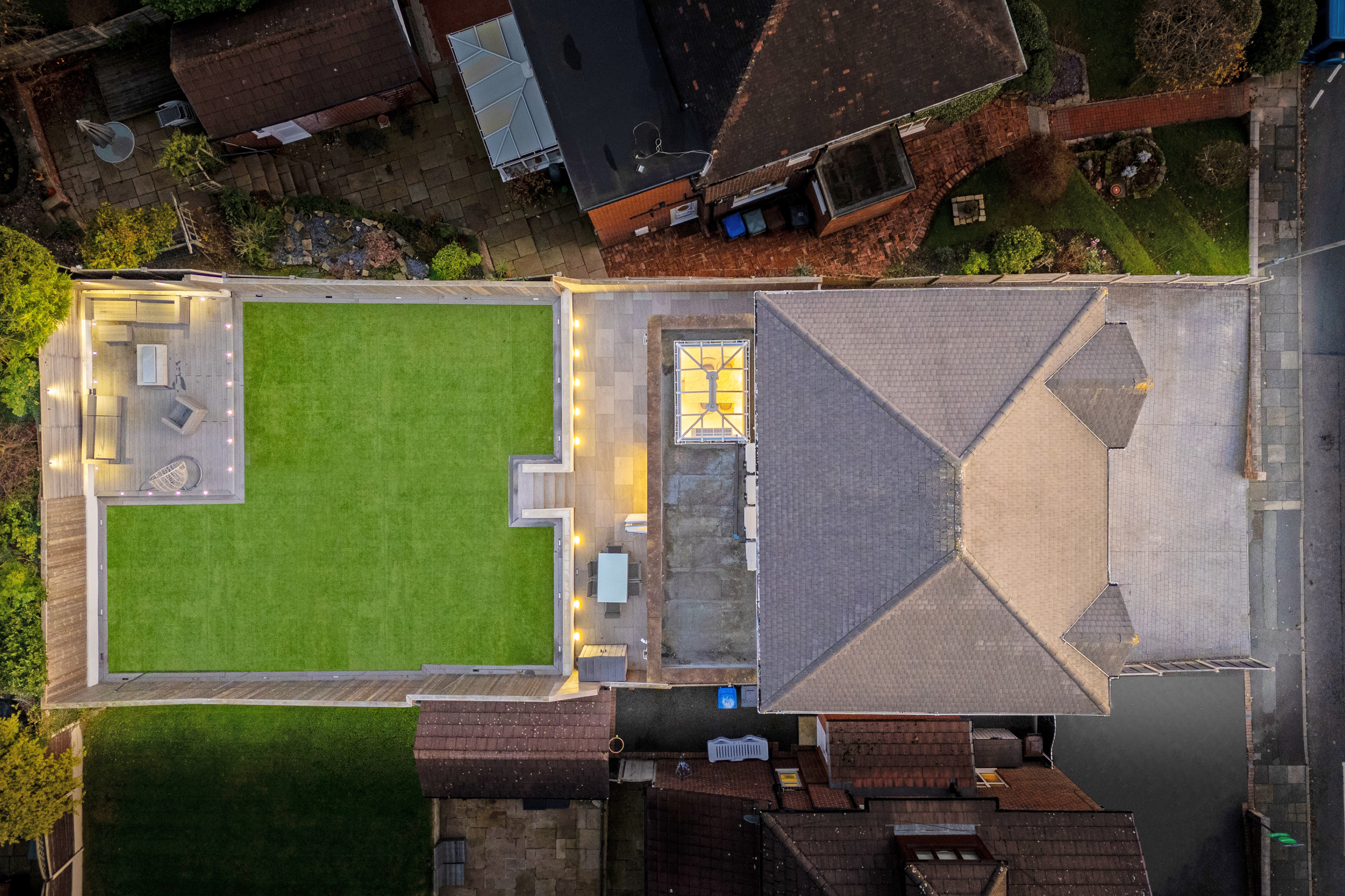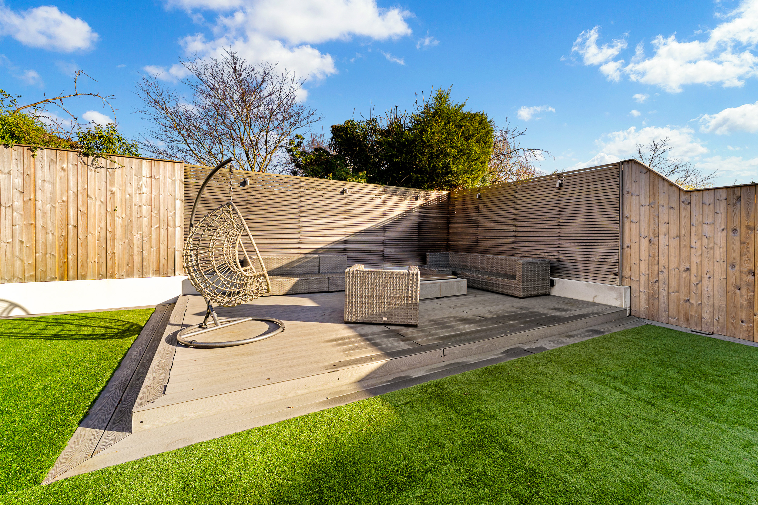 A two-tier design separates the large patio terrace from the Astro Turf lawn, creating defined yet flowing outdoor zones. Composite decking provides another stylish seating area, ideal for outdoor dining, morning coffee, or evening relaxation. High-quality fencing, integrated lighting, and mature borders shape a safe, private, and low-maintenance environment with year-round appeal.