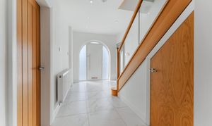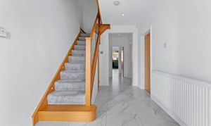 Step through into a bright, spacious hallway where the home begins to reveal its quality. Underfloor heating warms the tiled flooring beneath your feet, while the impressive glass-balustrade staircase rises ahead, catching the light and drawing the eye upward. Storage space for coats and daily essentials is neatly integrated, keeping the entrance feeling open and clutter-free.