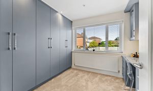 Just beyond the kitchen, a spacious utility room offers additional storage, a sink, and space for laundry appliances - ideal for keeping the main kitchen pristine. From here, a door leads directly into the generous garage, allowing for secure storage, hobbies, or even the potential for future conversion.