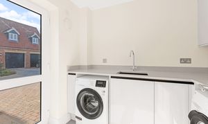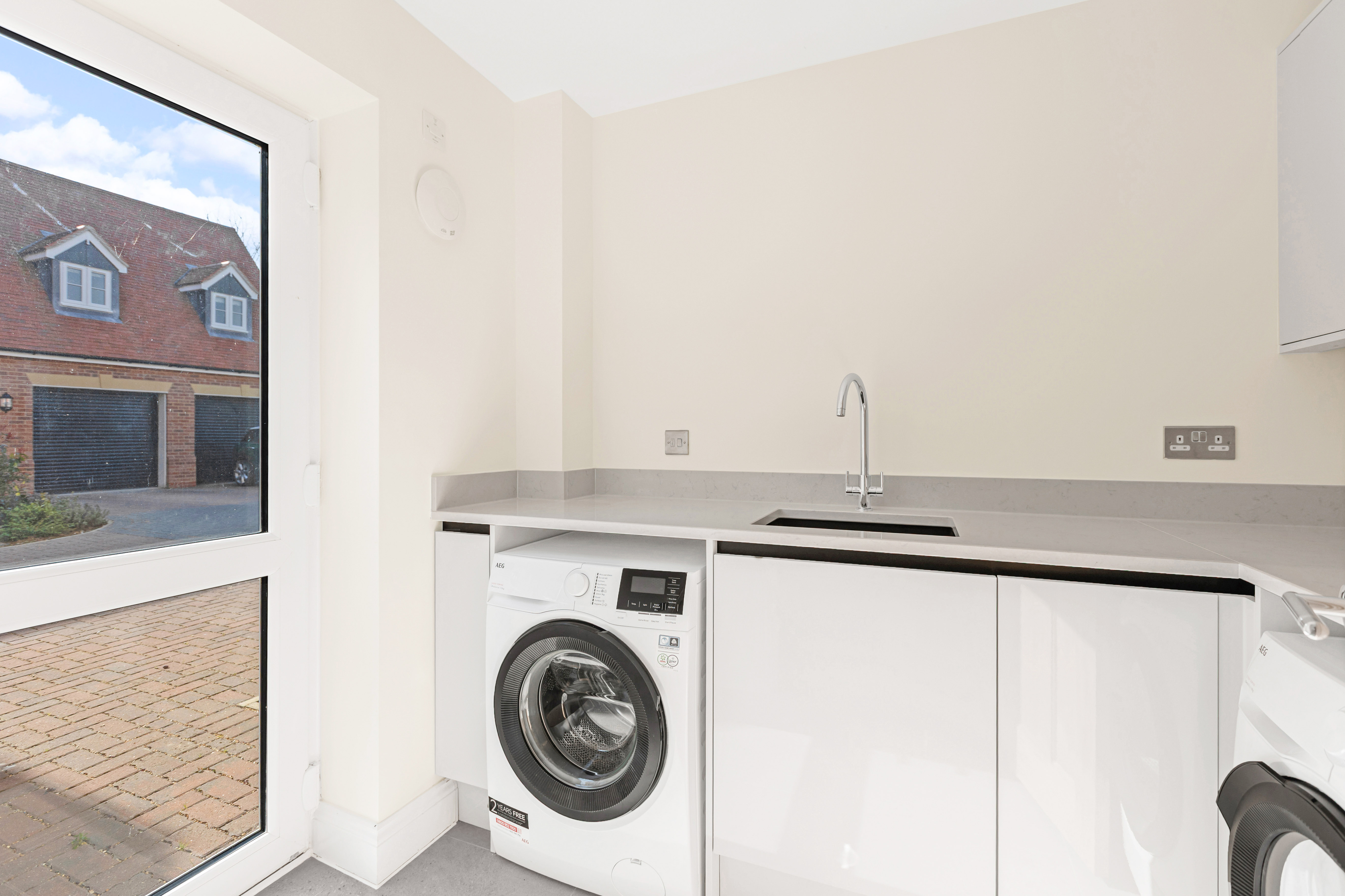 The kitchen/breakfast/dining room is wonderfully open-plan with bi-fold doors out onto a beautiful garden terrace, making it an excellent entertaining space. It enjoys a wide range of modern base and wall units, composite worktops, a large island/breakfast bar, tiled flooring, inset and under-cabinet lighting, an integrated double oven, induction hob, extractor hood, wine cooler, dishwasher and fridge/freezer, and space for other small kitchen appliances. The utility room provides further storage, space for large laundry appliances, and access to the side.