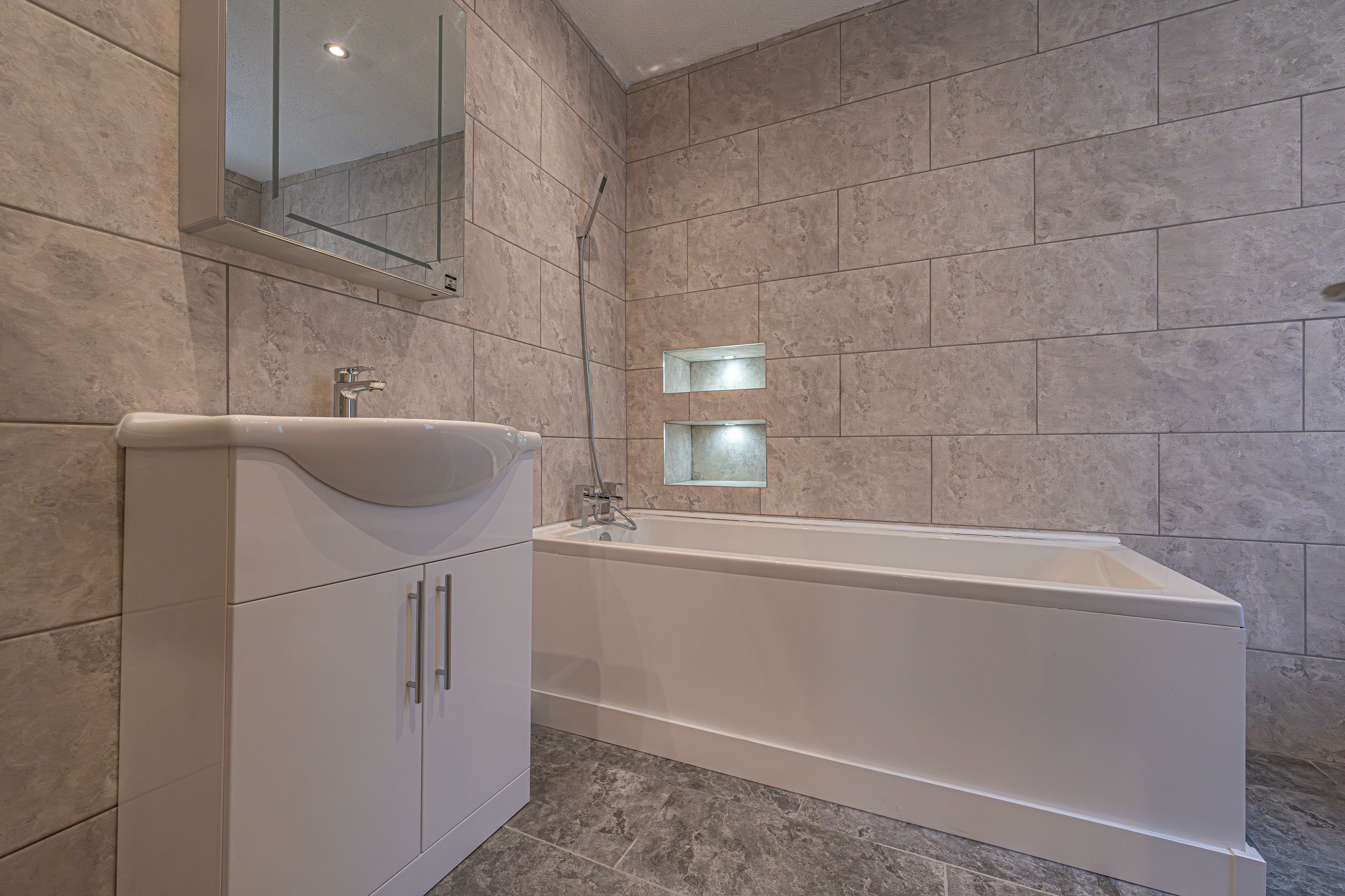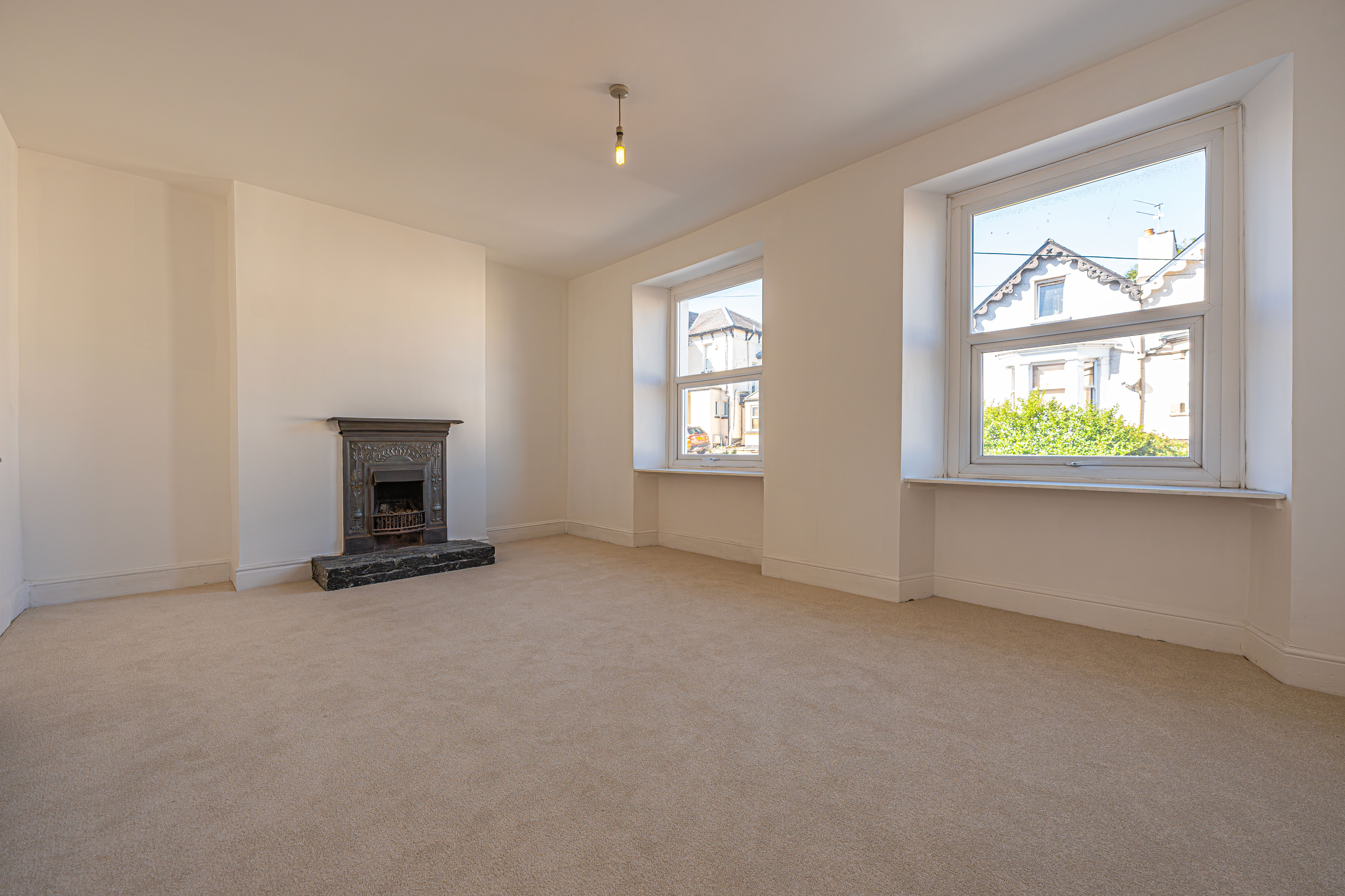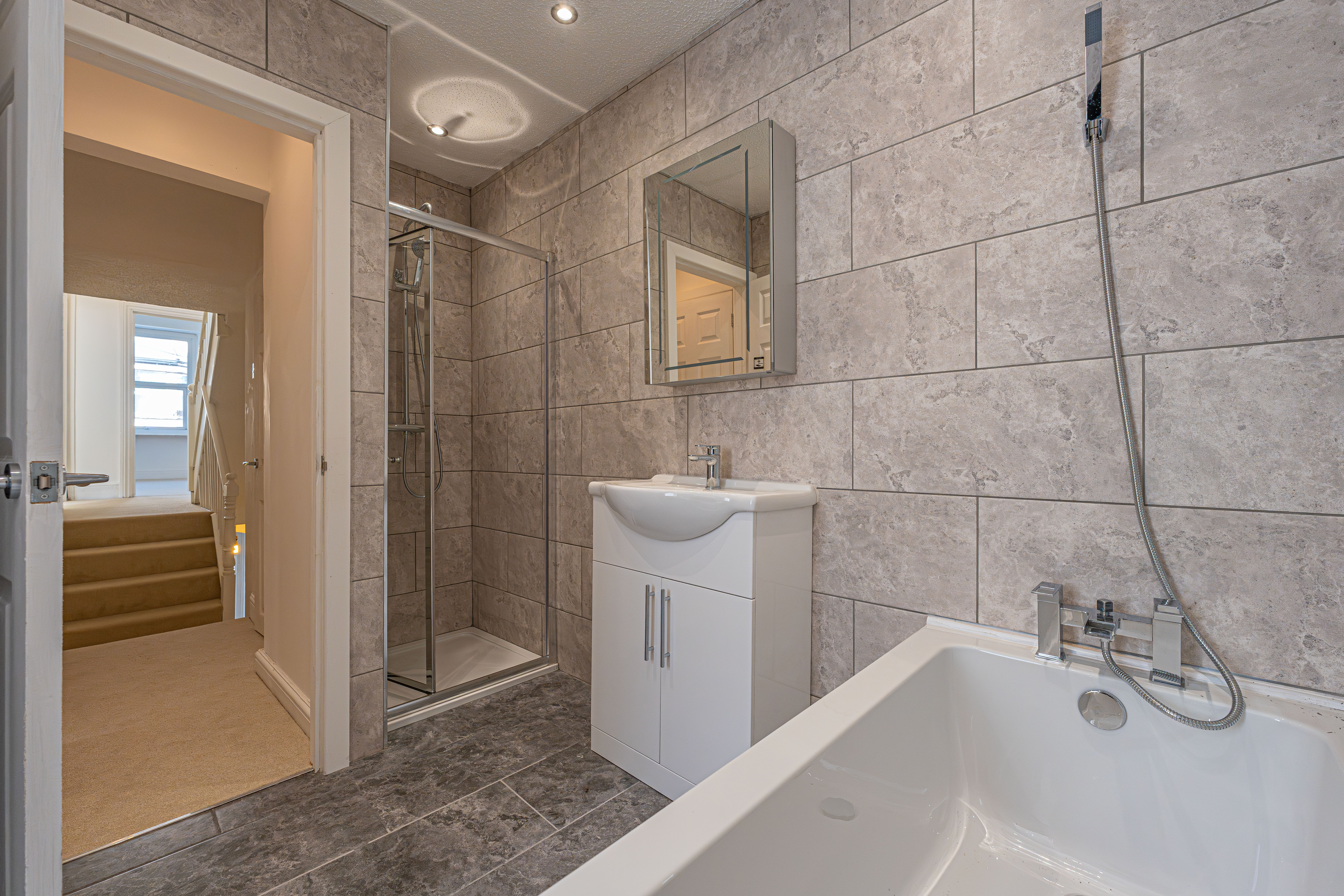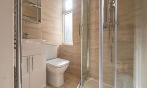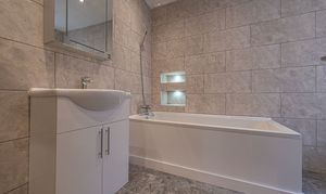 To the first floor we can find two well sized bedrooms, with the primary bedroom positioned to the front of the house, enjoying another marvellous fireplace and double windows to allow natural light to flood throughout this principal suite. The second bedroom on this floor benefits from having built-in storage. From the split landing we can also access multiple fitted cupboards and the two family bathrooms neighbouring each other. Both bathrooms are finished to a high standard, with contemporary tiling and a beautiful design, with multiple shower suites for residents to make use of.