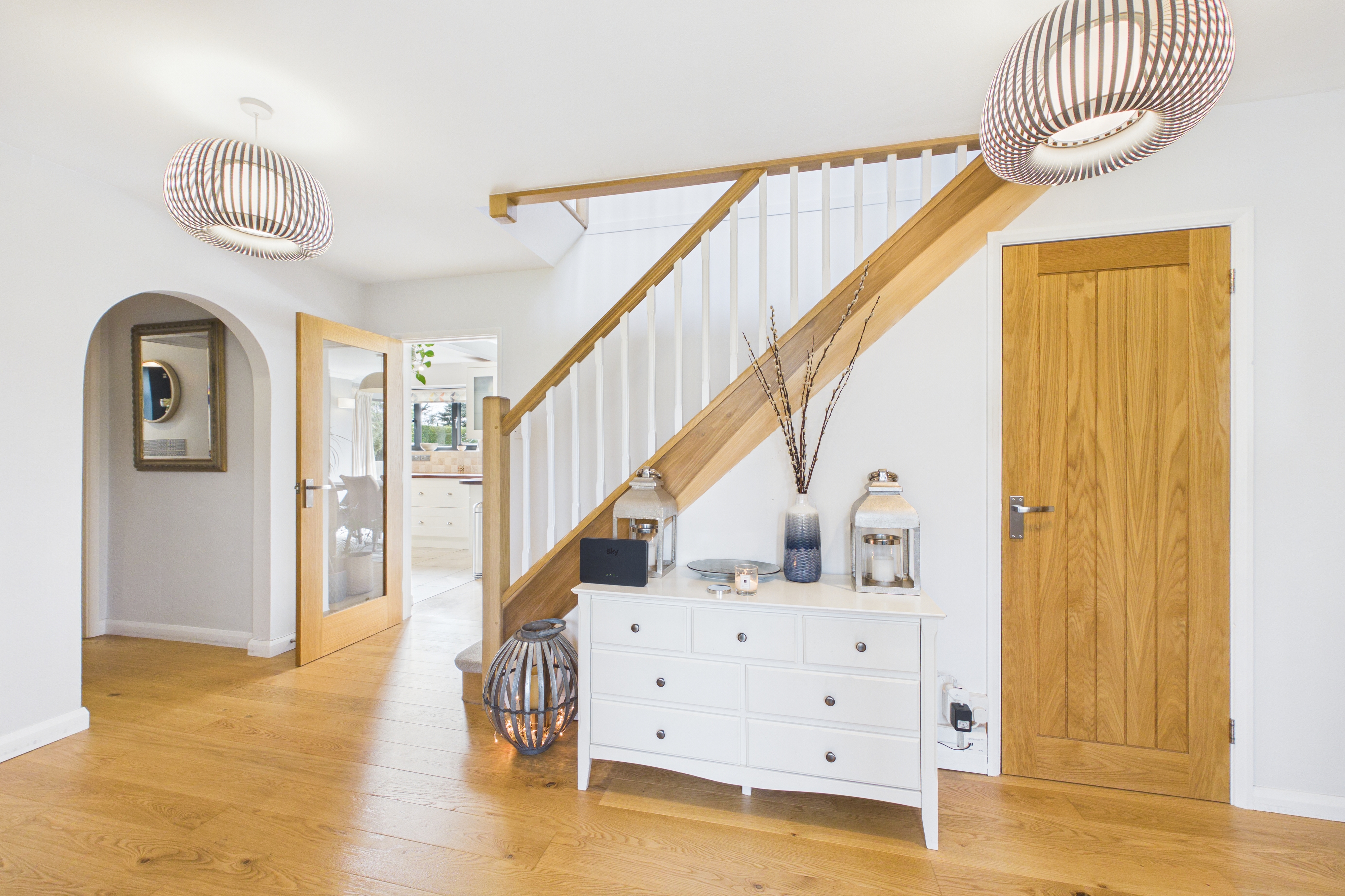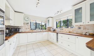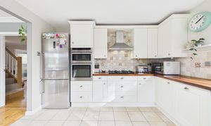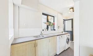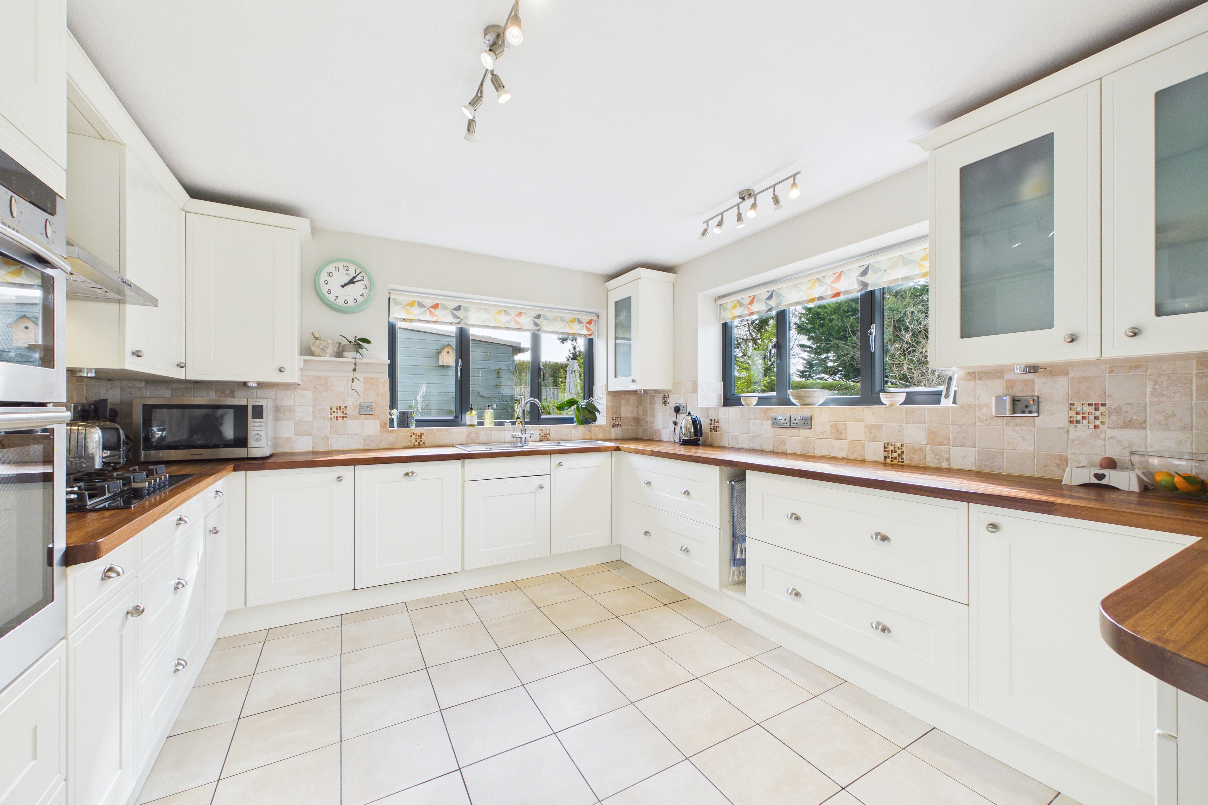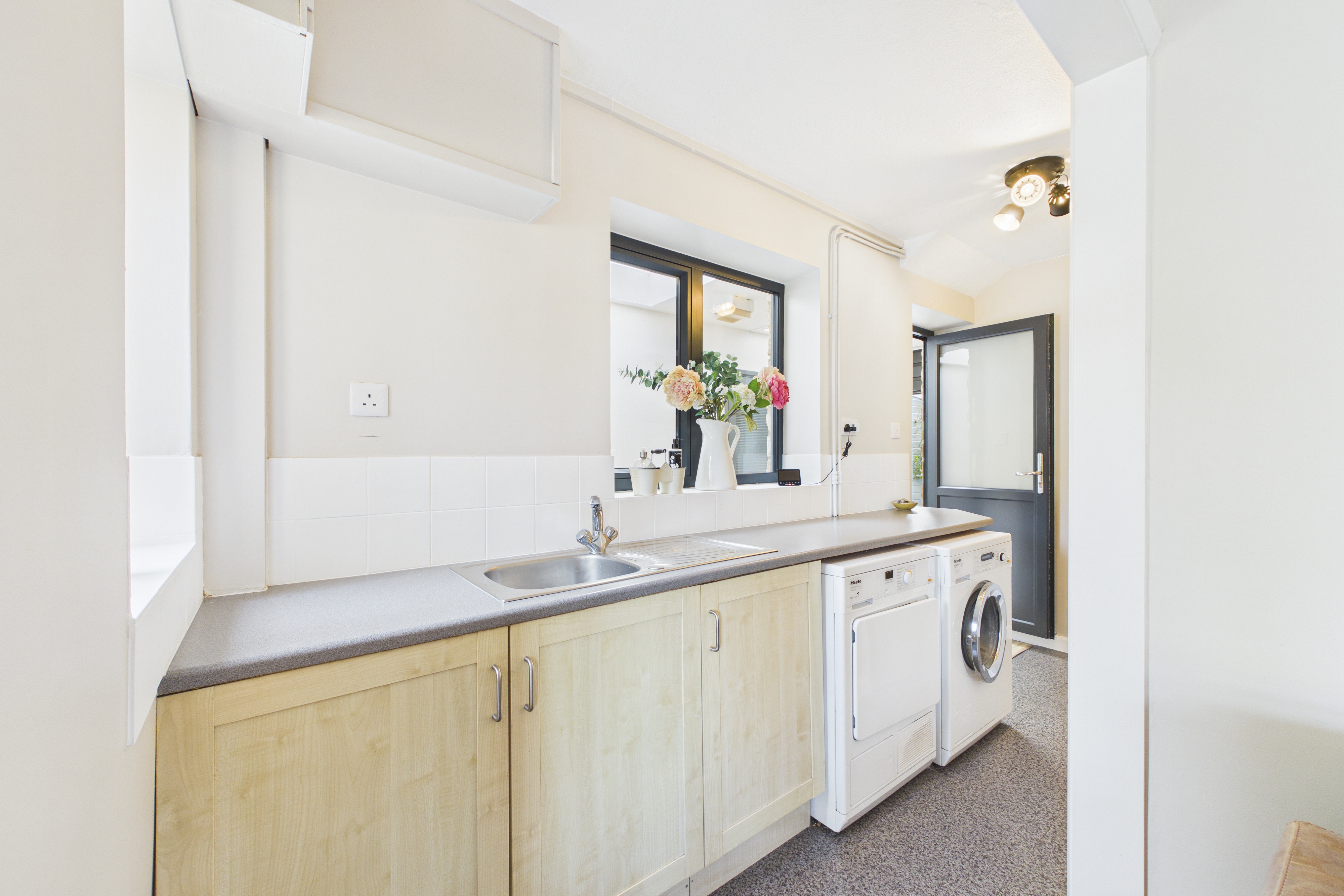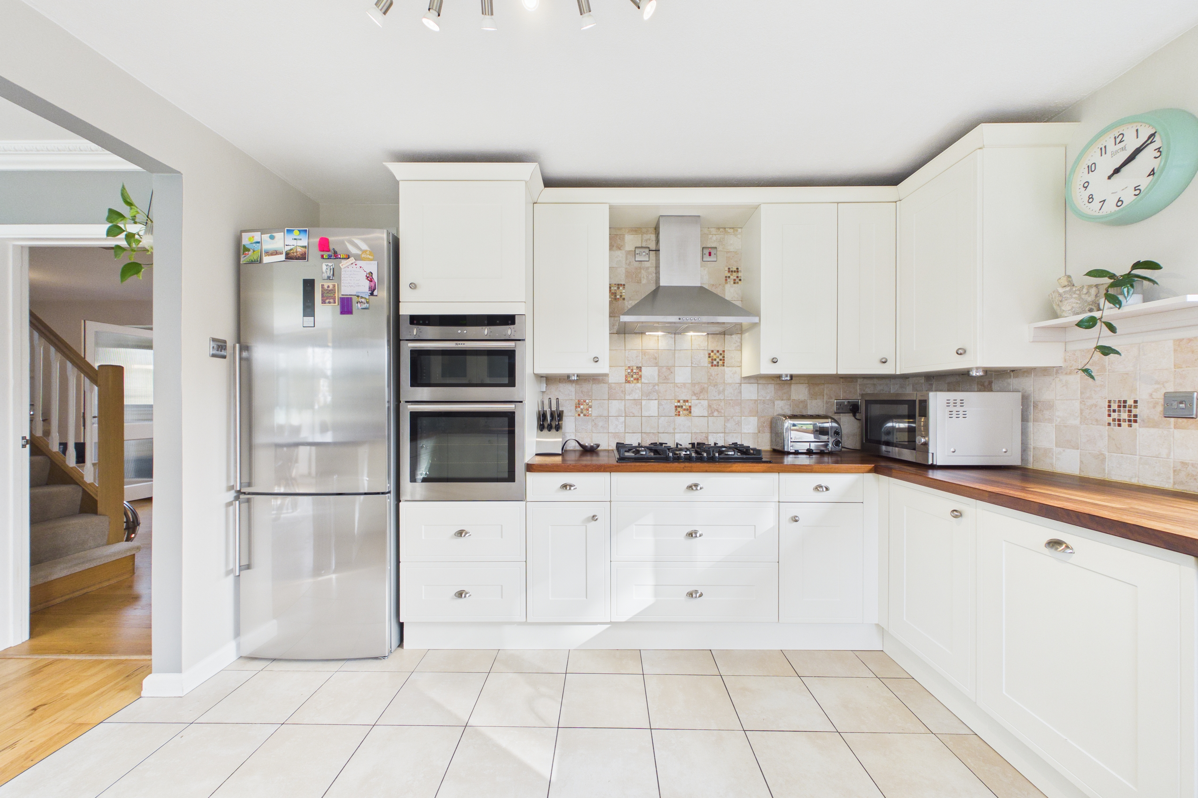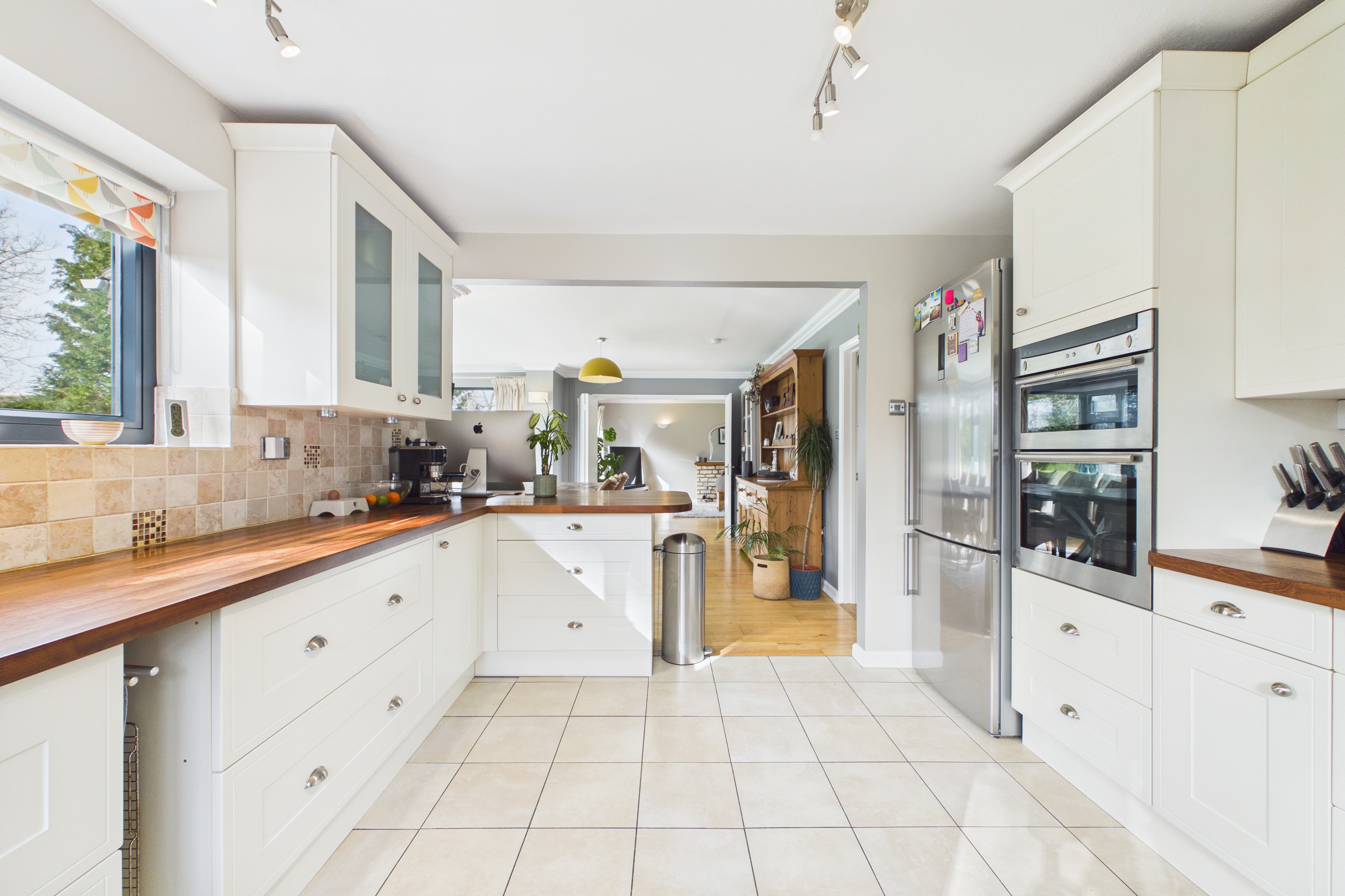 The kitchen has been stylishly updated and fitted with an abundance of storage alongside tiled flooring and tiled splashbacks. Integrated appliances include a raised oven, hob and extractor fan, creating a practical yet attractive space for everyday cooking and family life. There is a separate utility room.