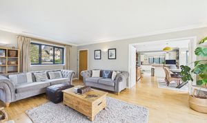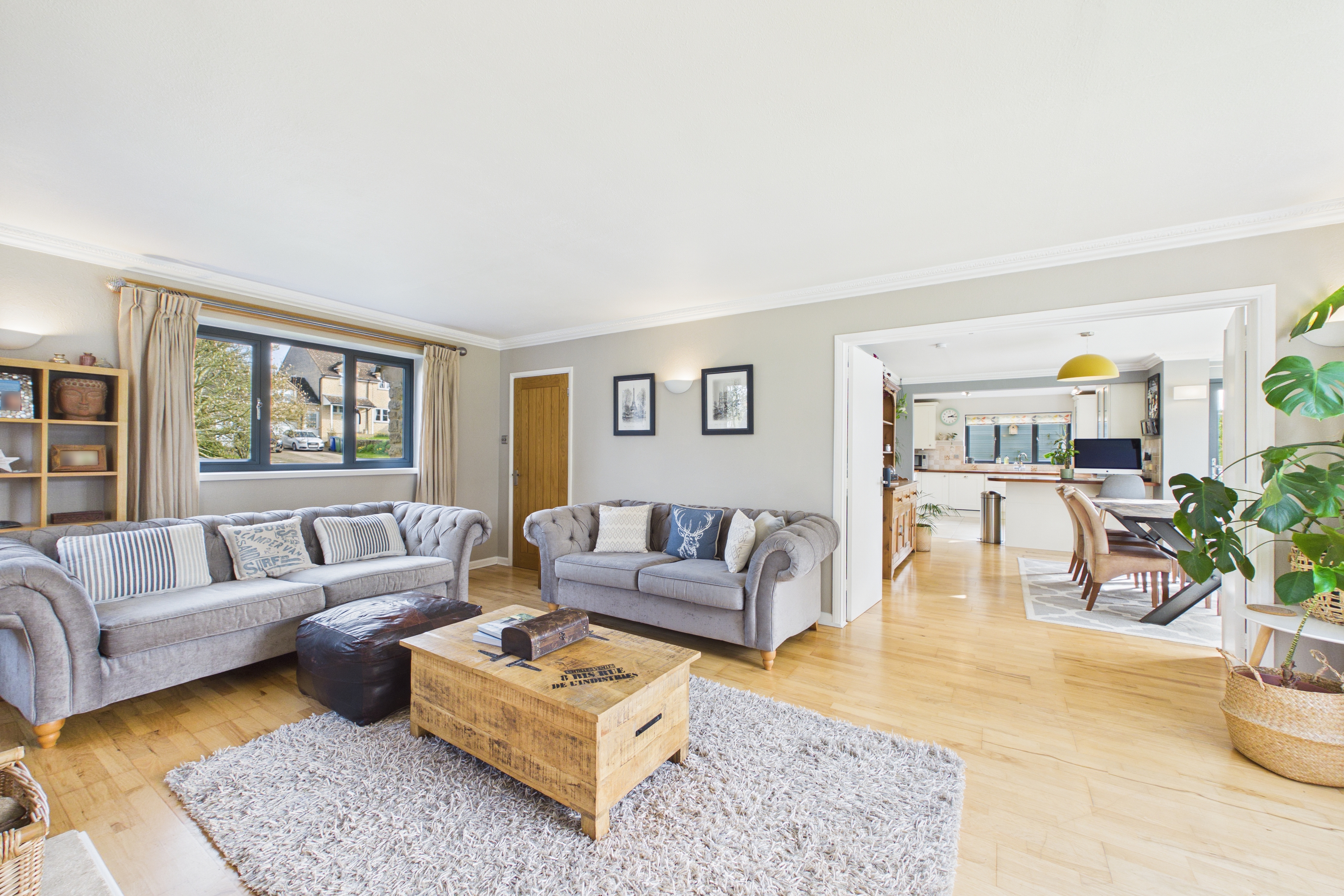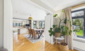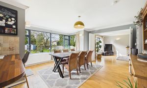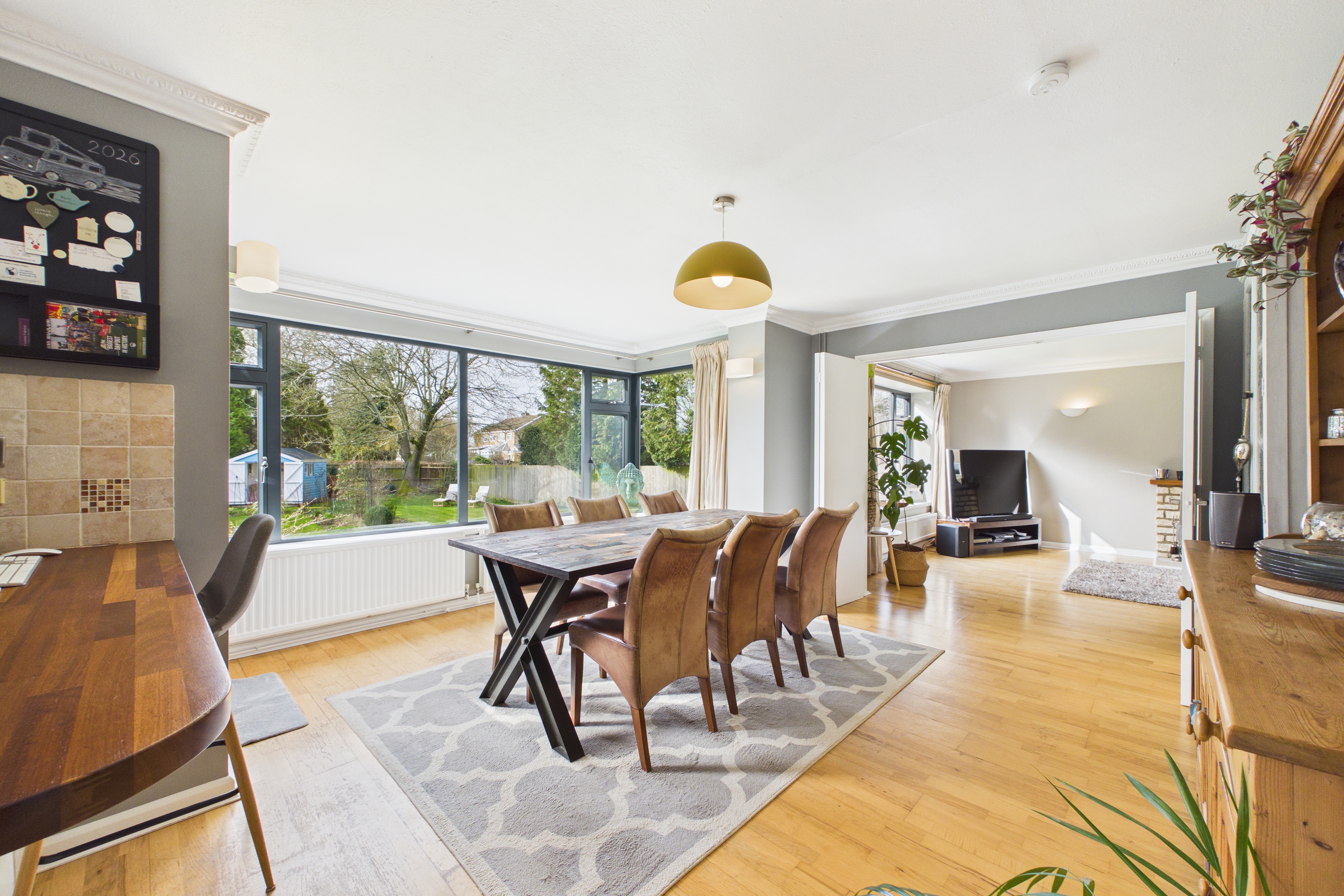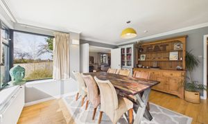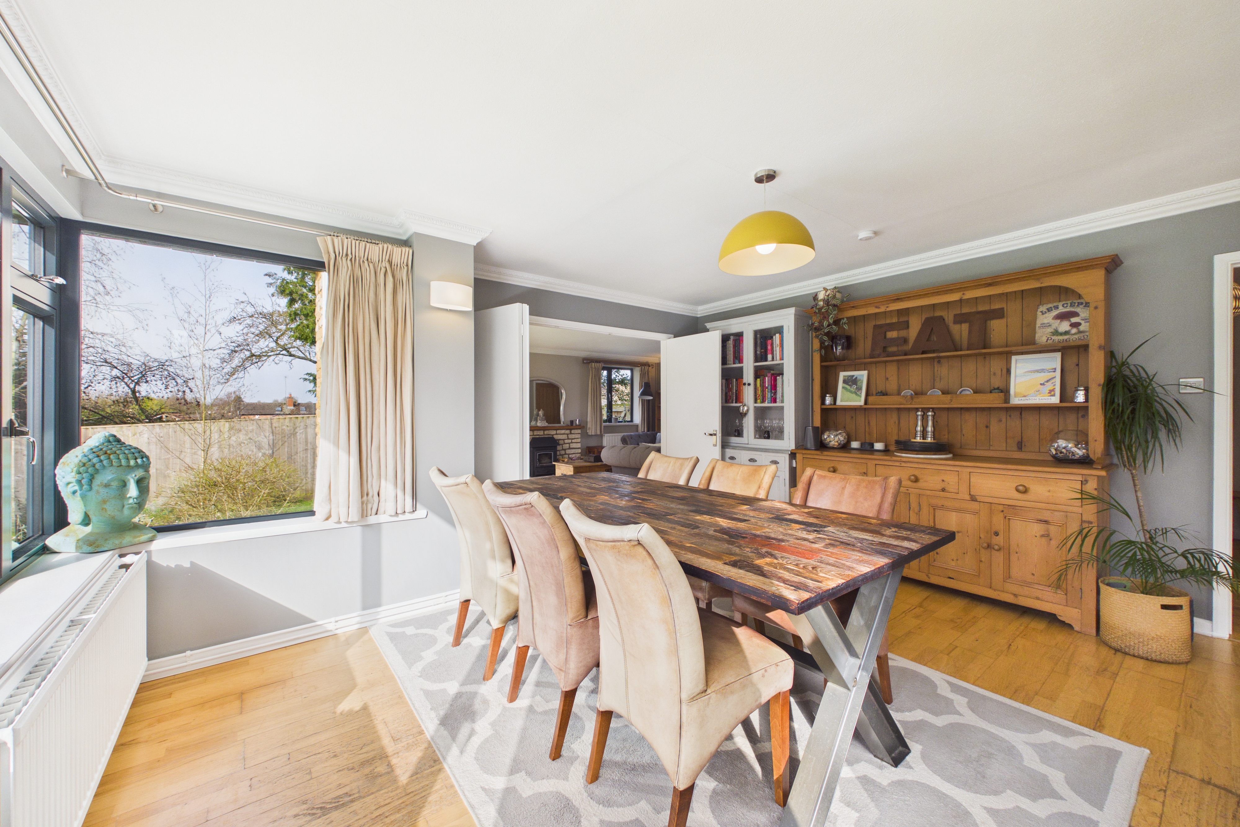 Flowing naturally from the living space is a beautiful dining and family area, arranged to create an easy connection between the reception rooms. With a walk-in bay window overlooking the garden and doors opening out to the patio, this space feels bright and sociable, offering an open-plan feel when desired while still allowing each area its own sense of character.