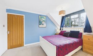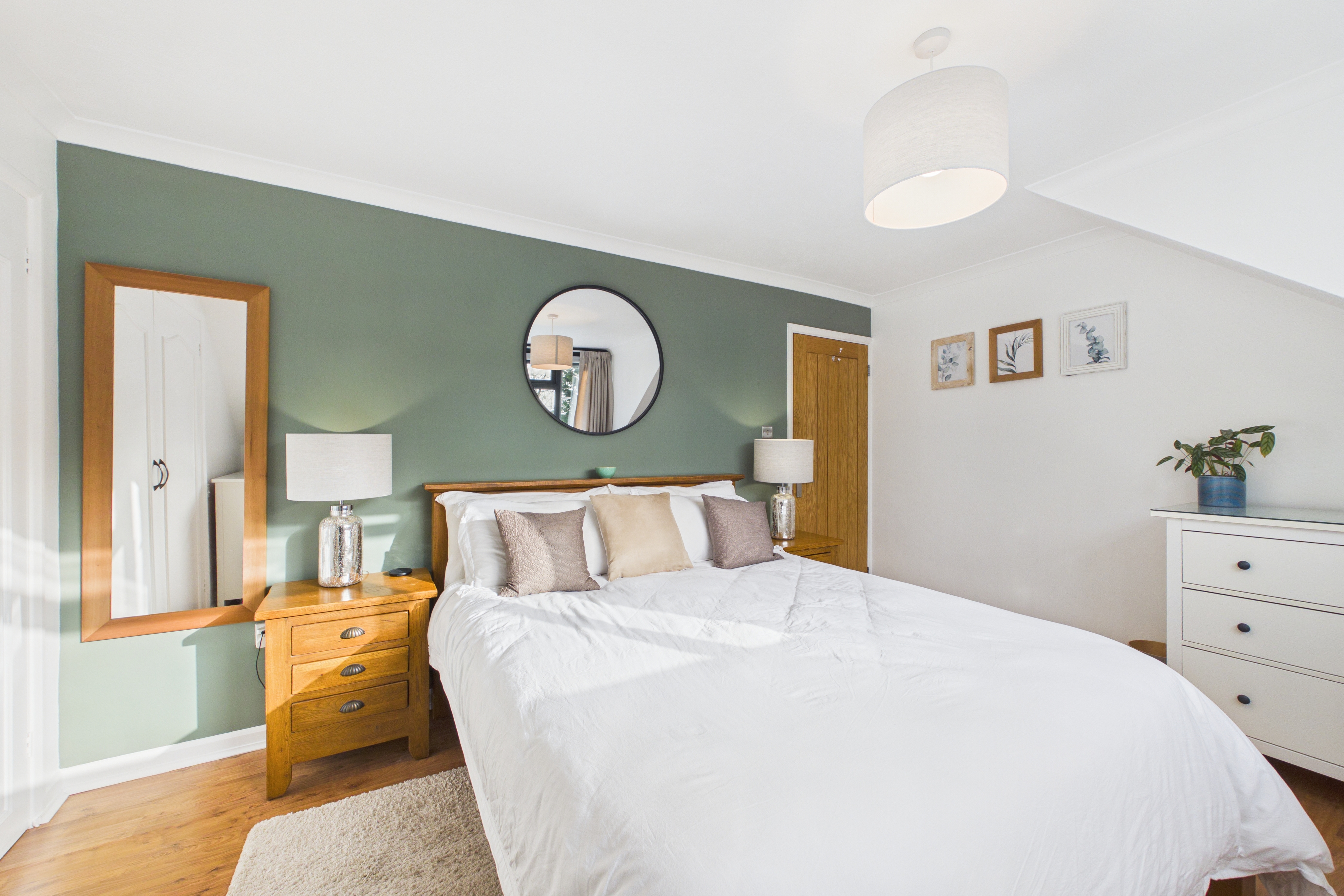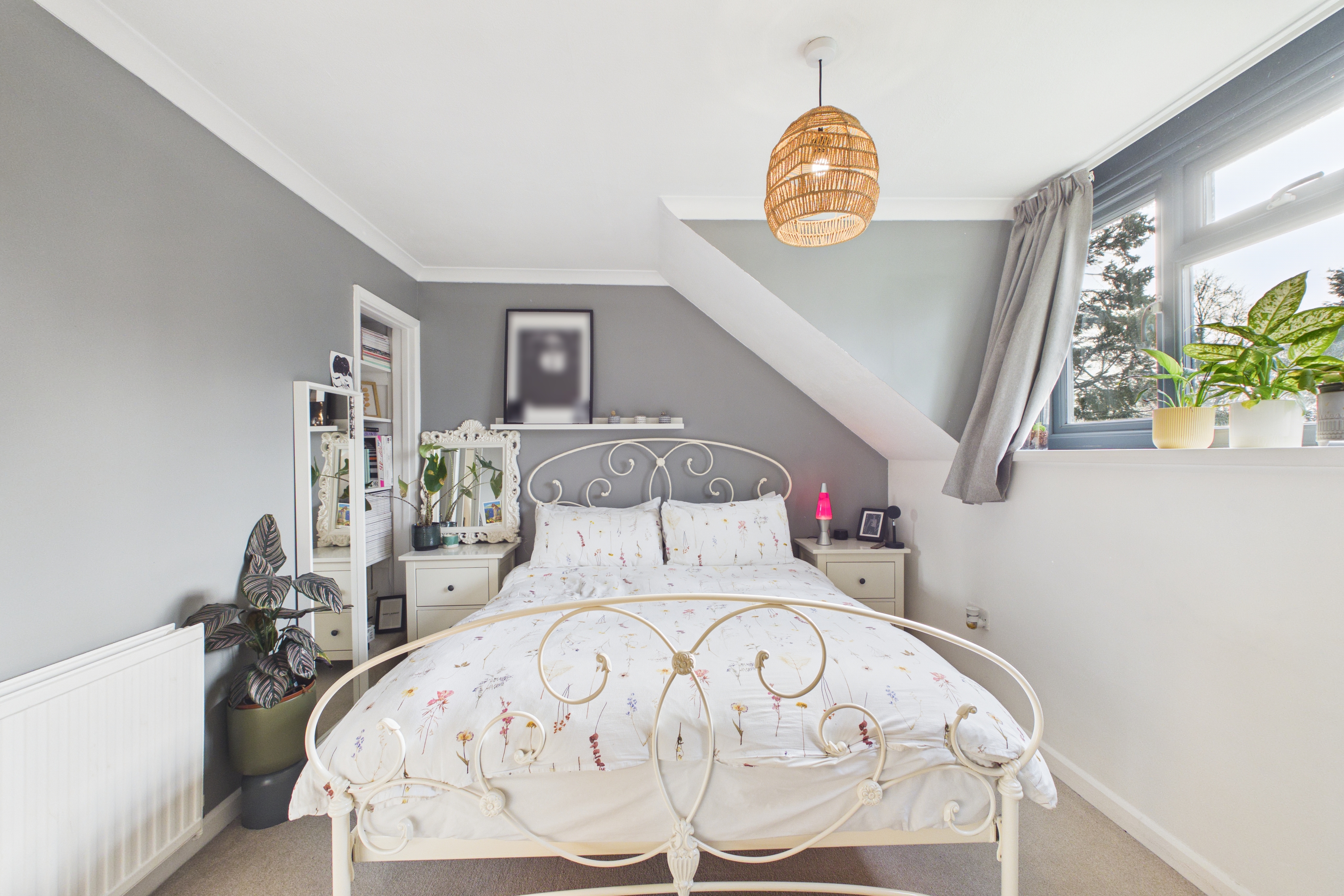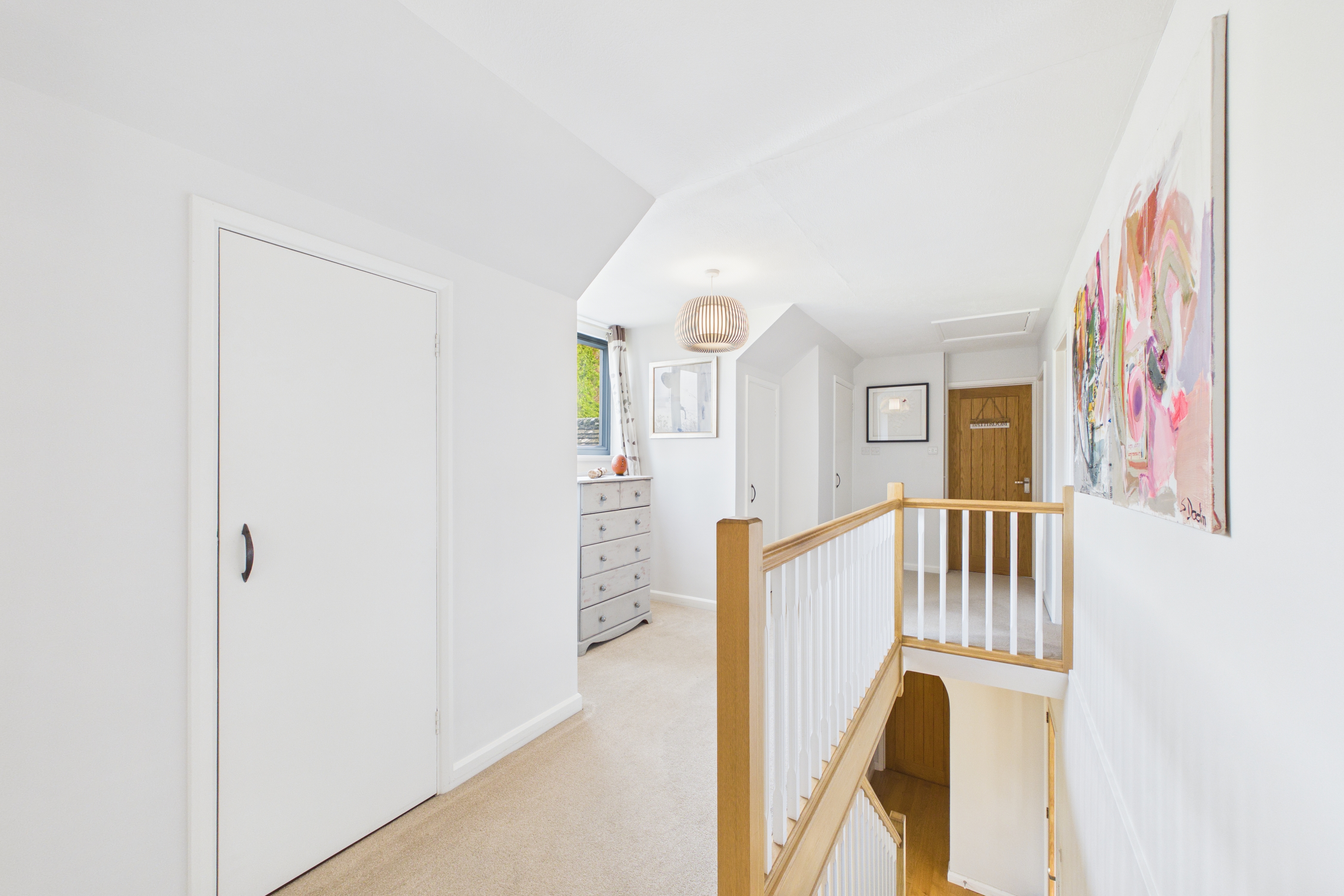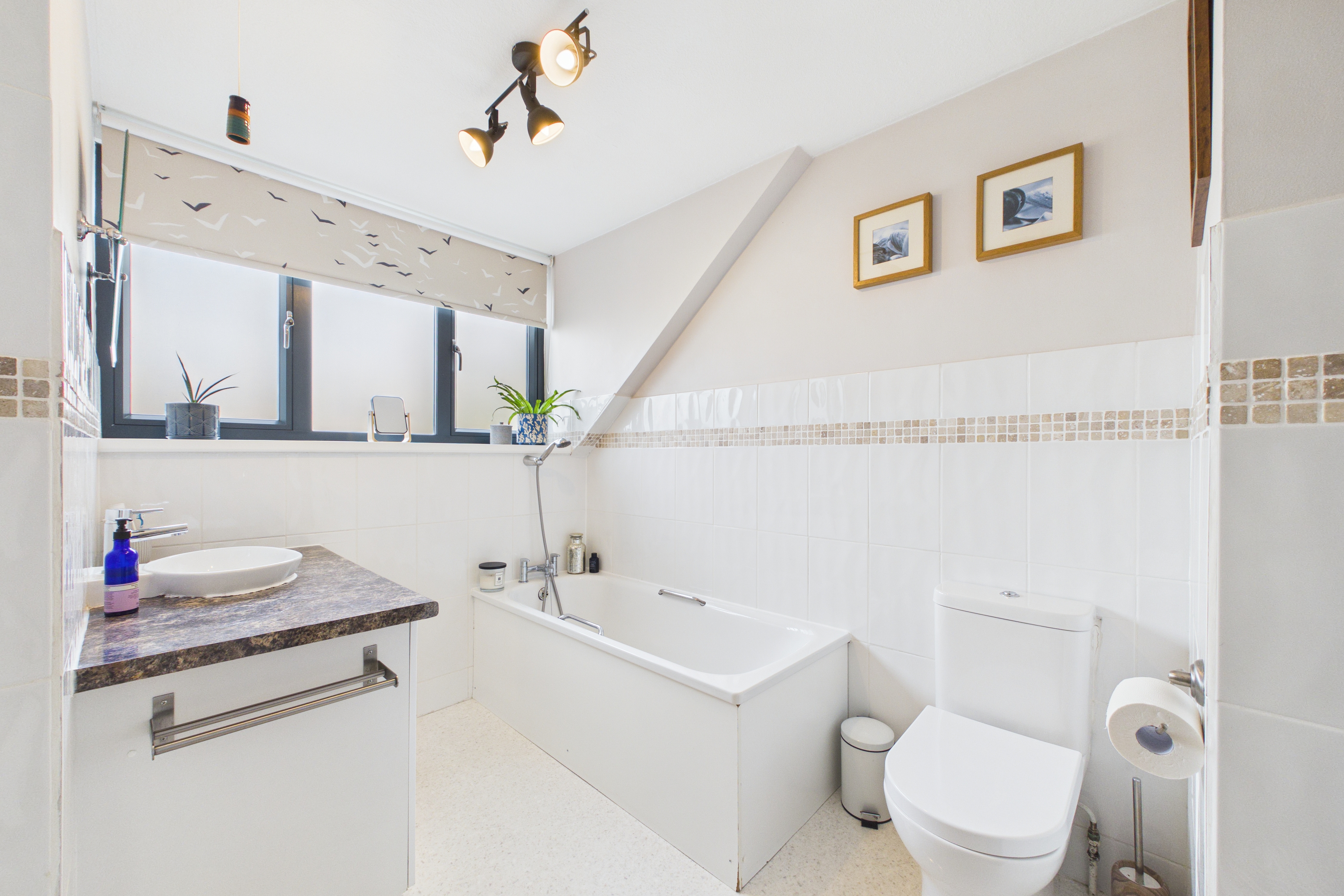 Upstairs, the first floor provides four well-proportioned bedrooms, three of which are generous doubles. Each of the bedrooms feels light and welcoming, with the principal rooms enjoying views across the rear garden and built-in storage. The family bathroom is fitted with a modern suite including a bathtub and a separate shower cubicle.