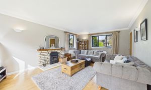 An entrance porch leads into a central reception hall, creating an inviting first impression and providing access to the main living spaces. The living room is a particularly appealing area, enjoying natural light from three aspects and centred around a characterful wood-burning stove set within a stone fireplace, creating a cosy focal point.