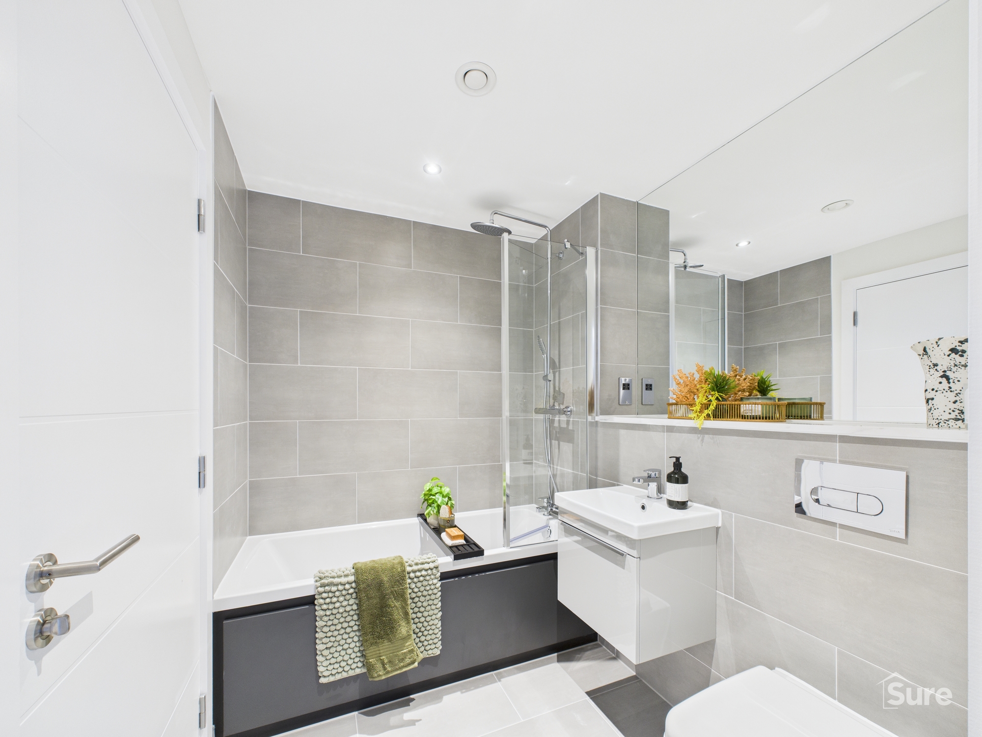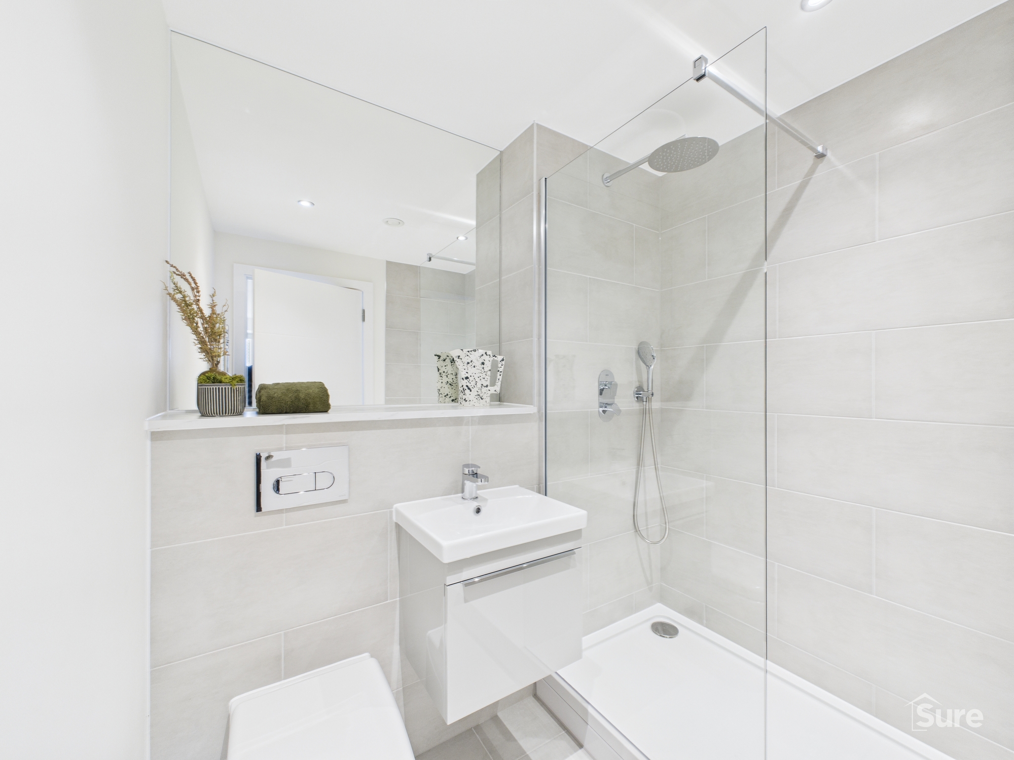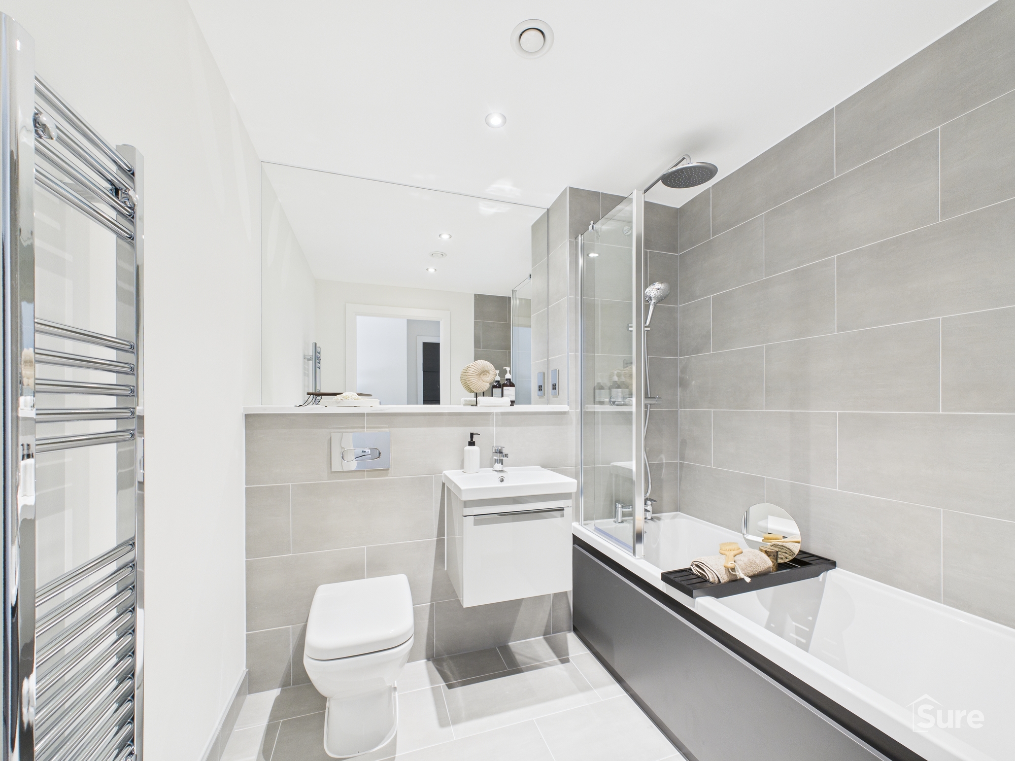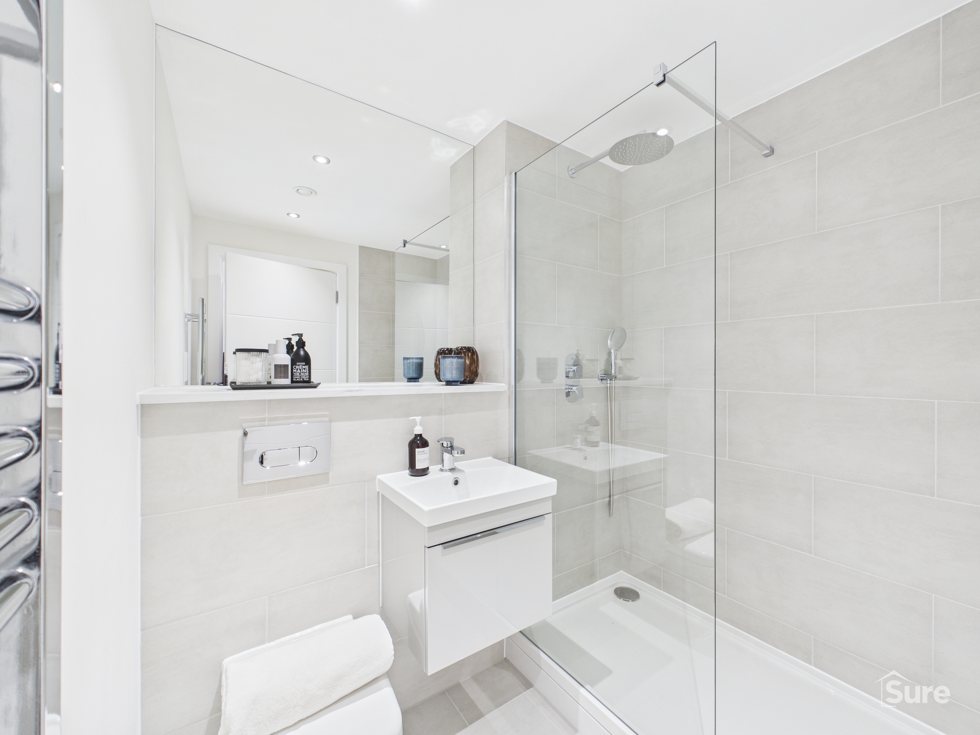 Access from living space and bedroom two. Having bath with shower over with both rainwater and hand held showerheads. Wash hand basin with cupboard under. Low flush WC. Mirror to wall with display lighting. Chrome heated towel rail. Floor coverings.