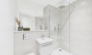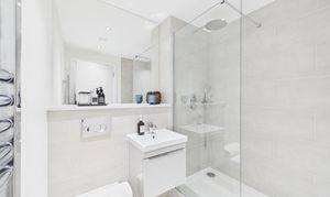 Walk in shower with rainwater and handheld showerheads and glass screen. Wash hand basin with cupboard under. Low flush WC. Mirror to wall with display lighting. Chrome heated towel rail. Floor covering.