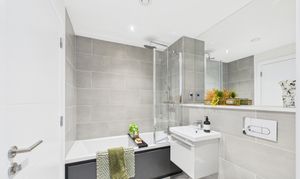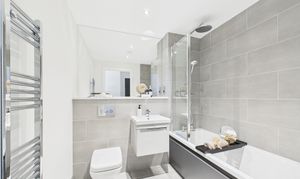 Bath with shower over with rainwater and hand held showerheads and glass screen. Wash hand basin with cupboards underneath, low flush WC. Mirror to wall with display lighting. Chrome heated towel rail. Floor Covering.