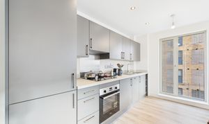 Four full length windows filling the room with natural light. Wall heaters. Fitted kitchens with contrasting working surfaces and inset sink and drainer. Built in electric oven, hob and extractor hood. Integrated appliances including fridge freezer and slimline dishwasher. Floor coverings.