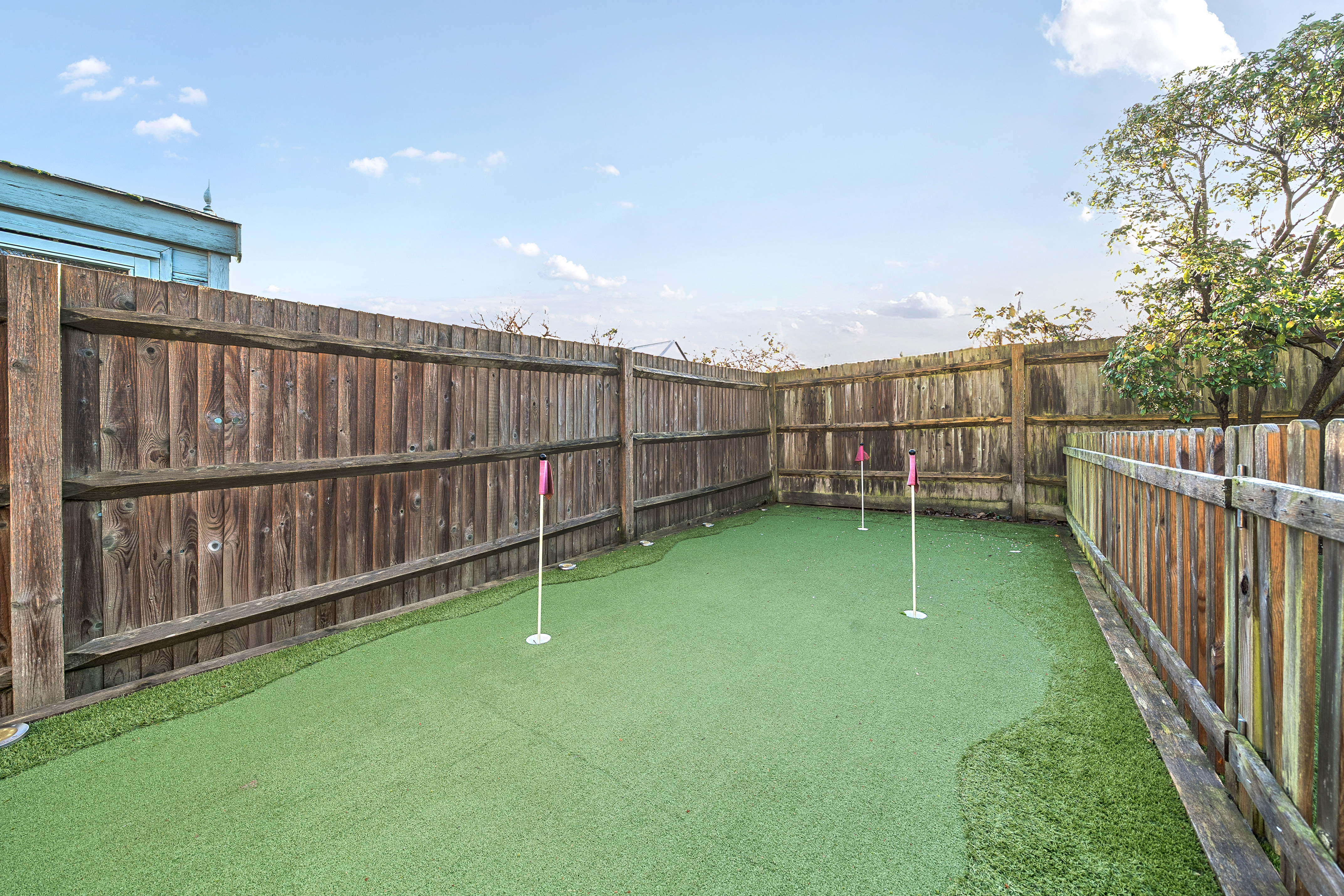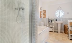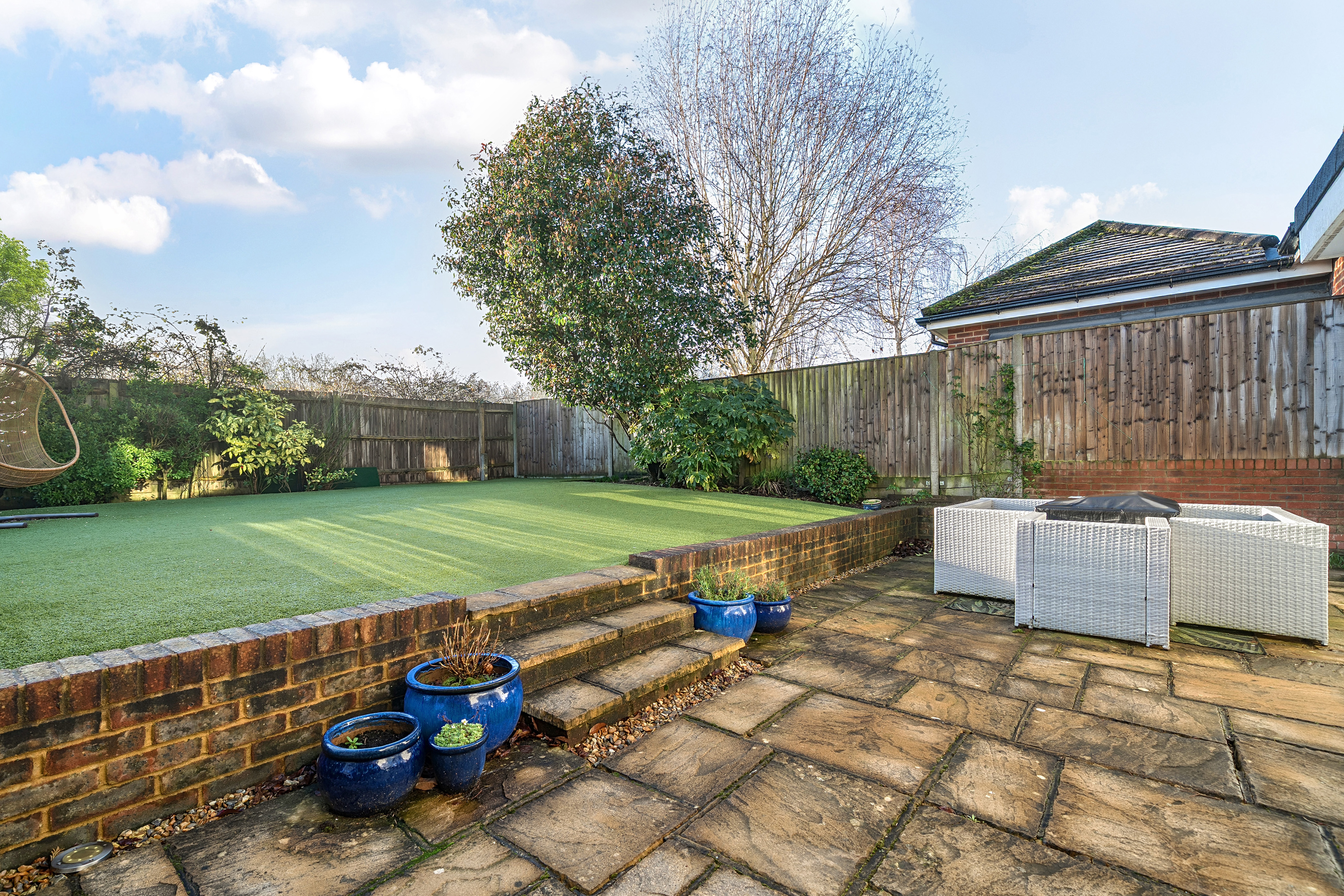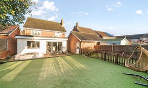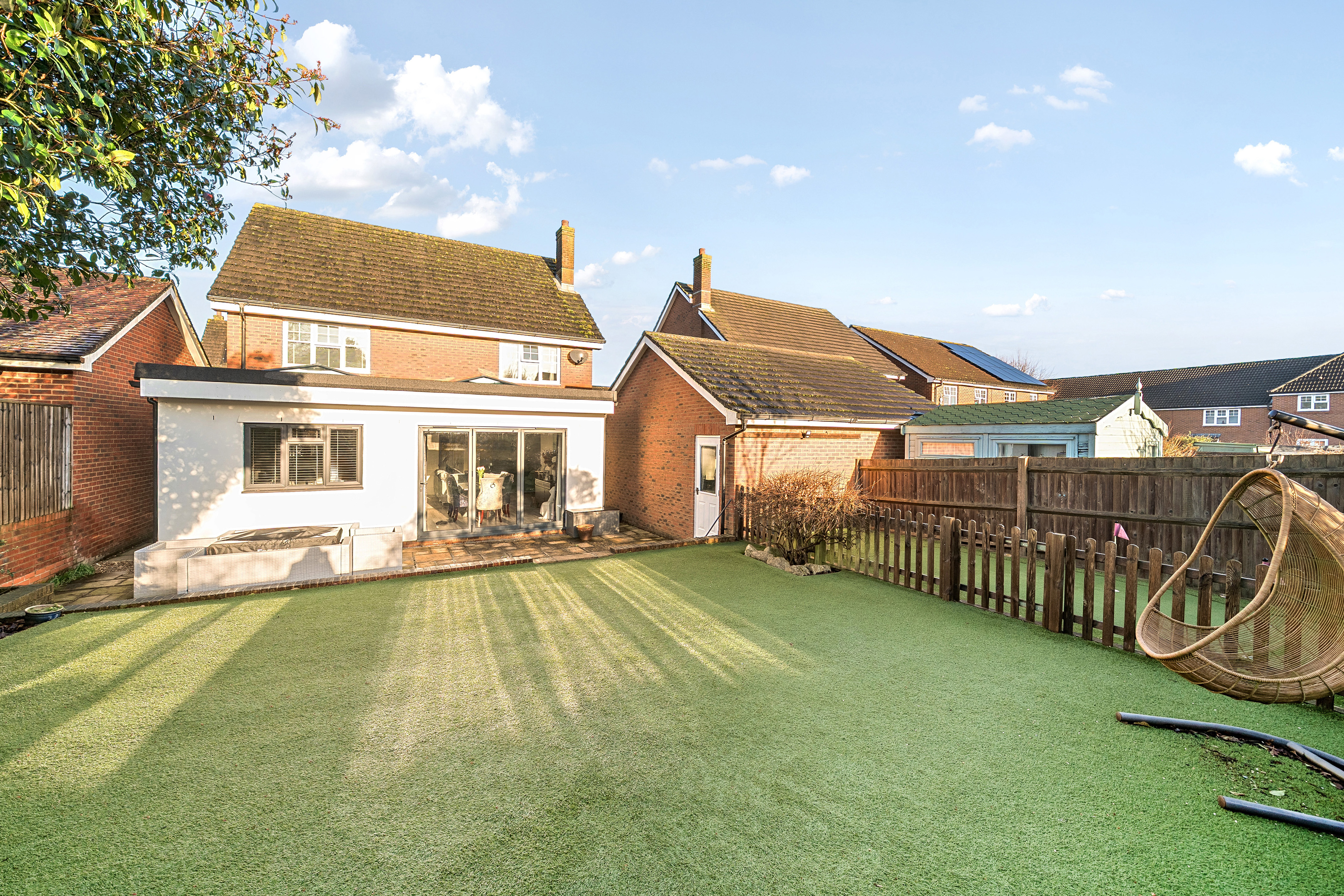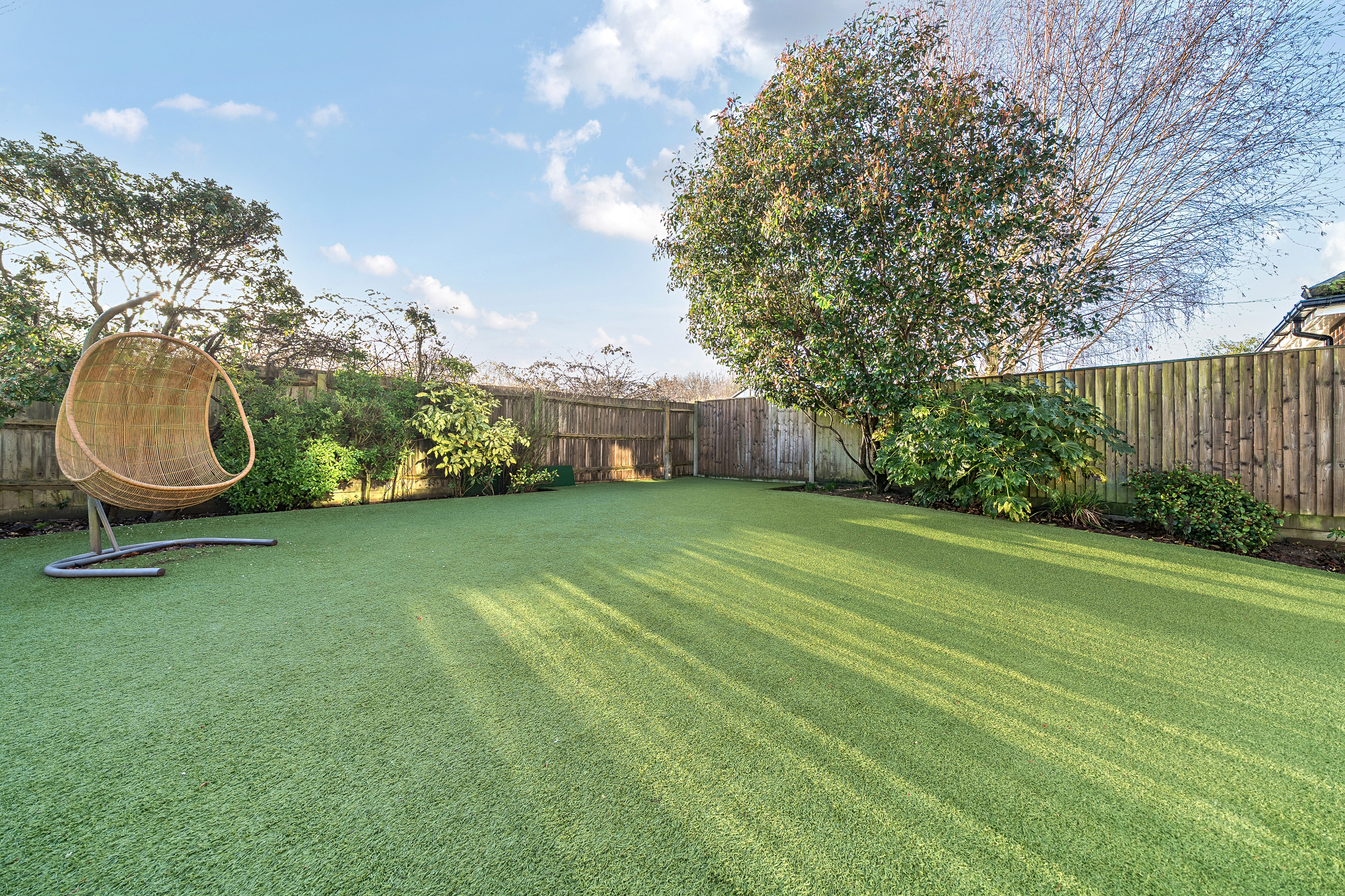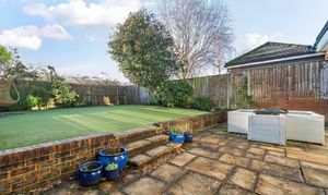 Outside, the enclosed rear garden is designed for low maintenance and enjoyment, with astro-turf, planted borders and a sunny paved patio ideal for entertaining. A fun pitch-and-putt area has been created to one side, and there is direct access from the garden into the garage.
