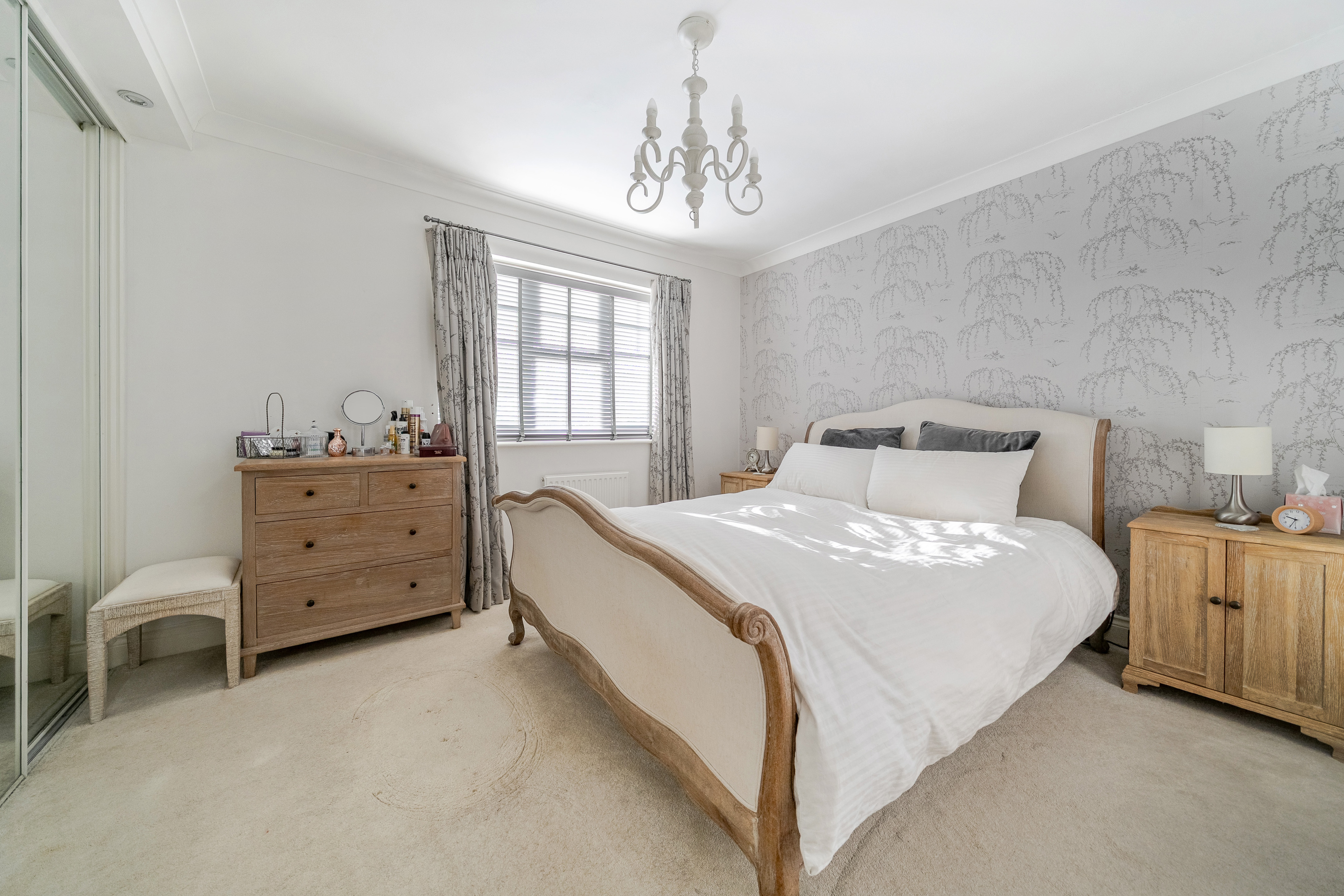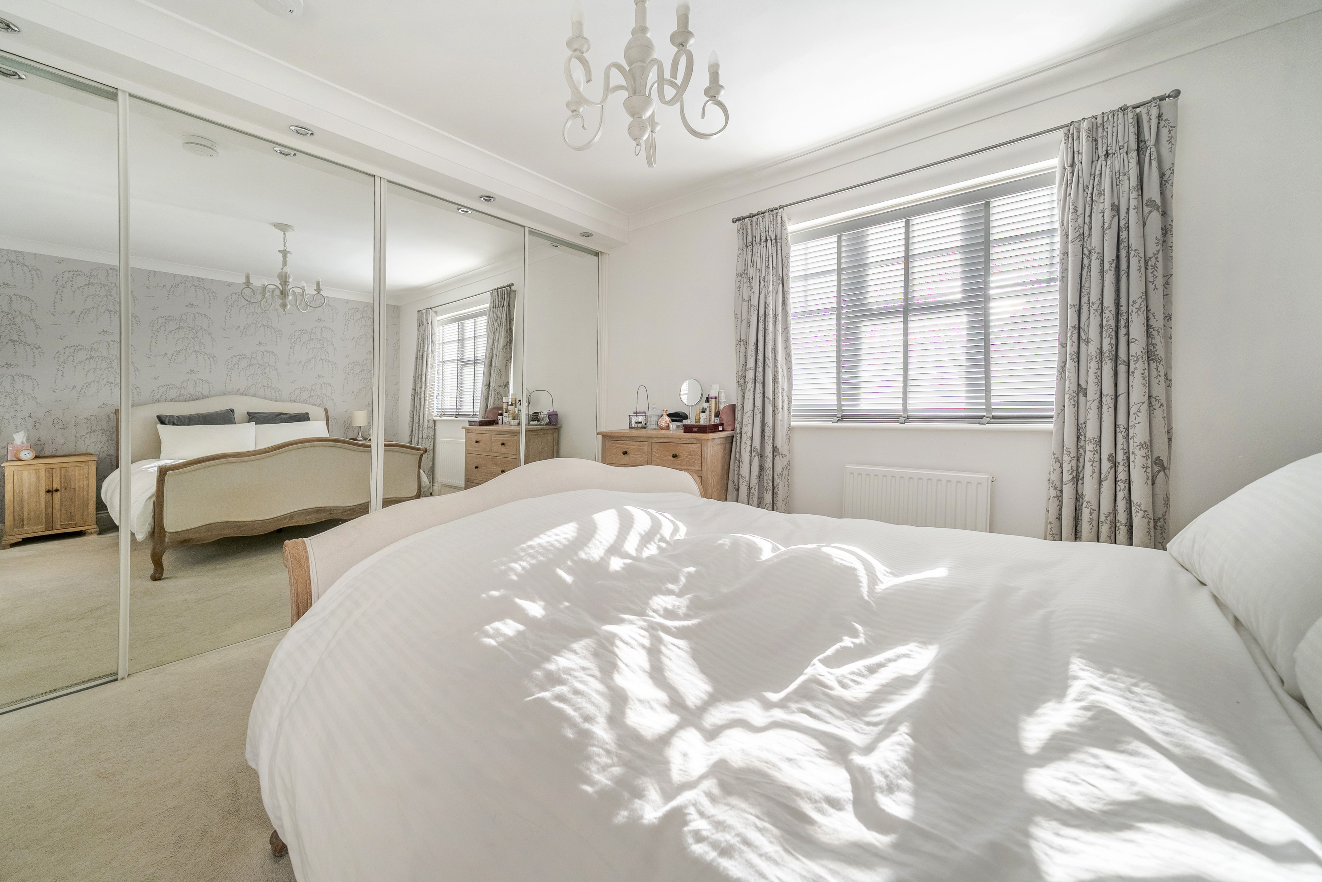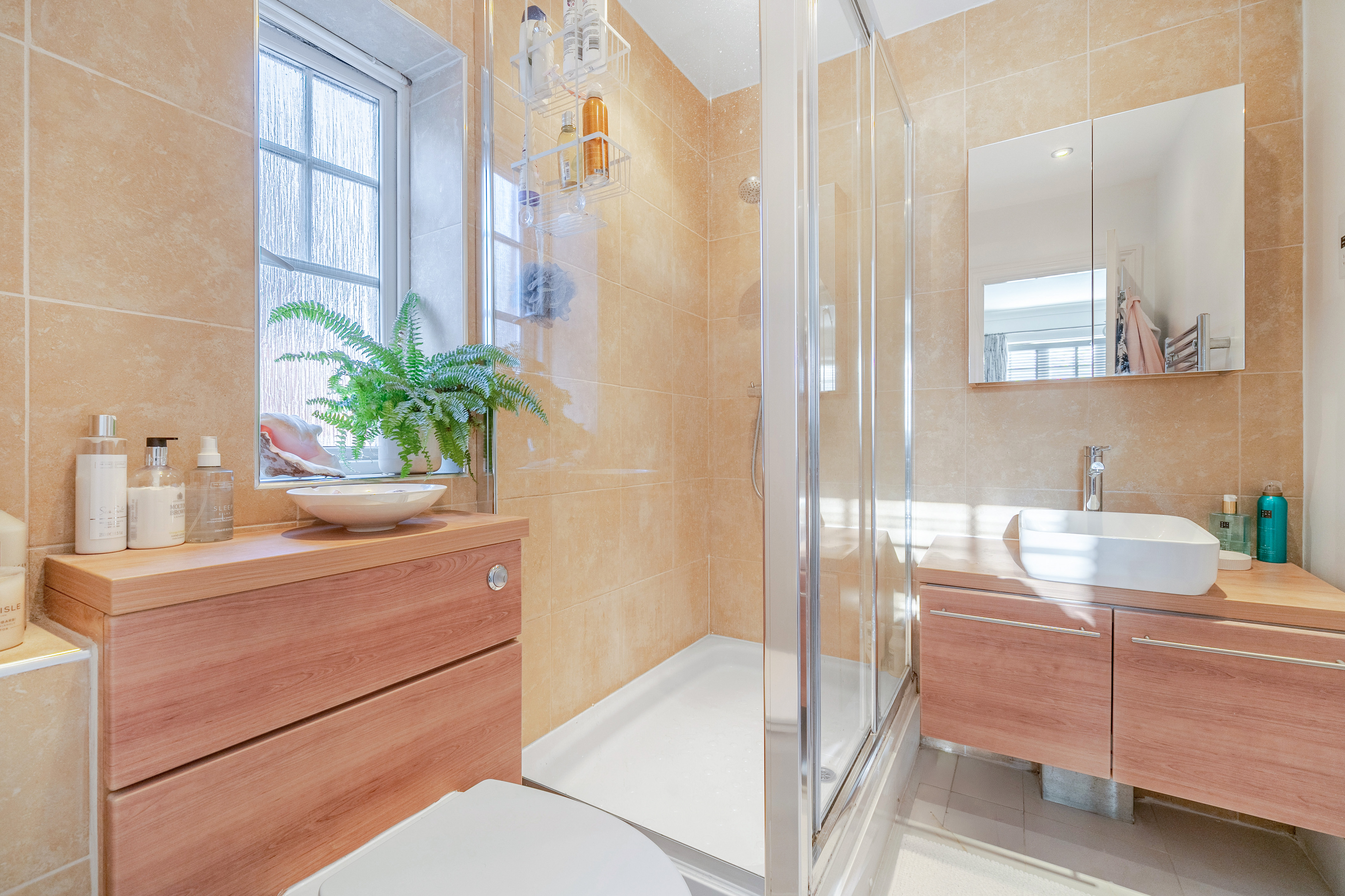 Upstairs, the first floor offers four well-proportioned bedrooms and a modern family bathroom with a separate shower. The principal bedroom features built-in mirrored wardrobes and a stylish en-suite shower room.