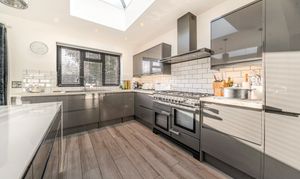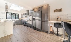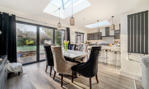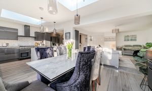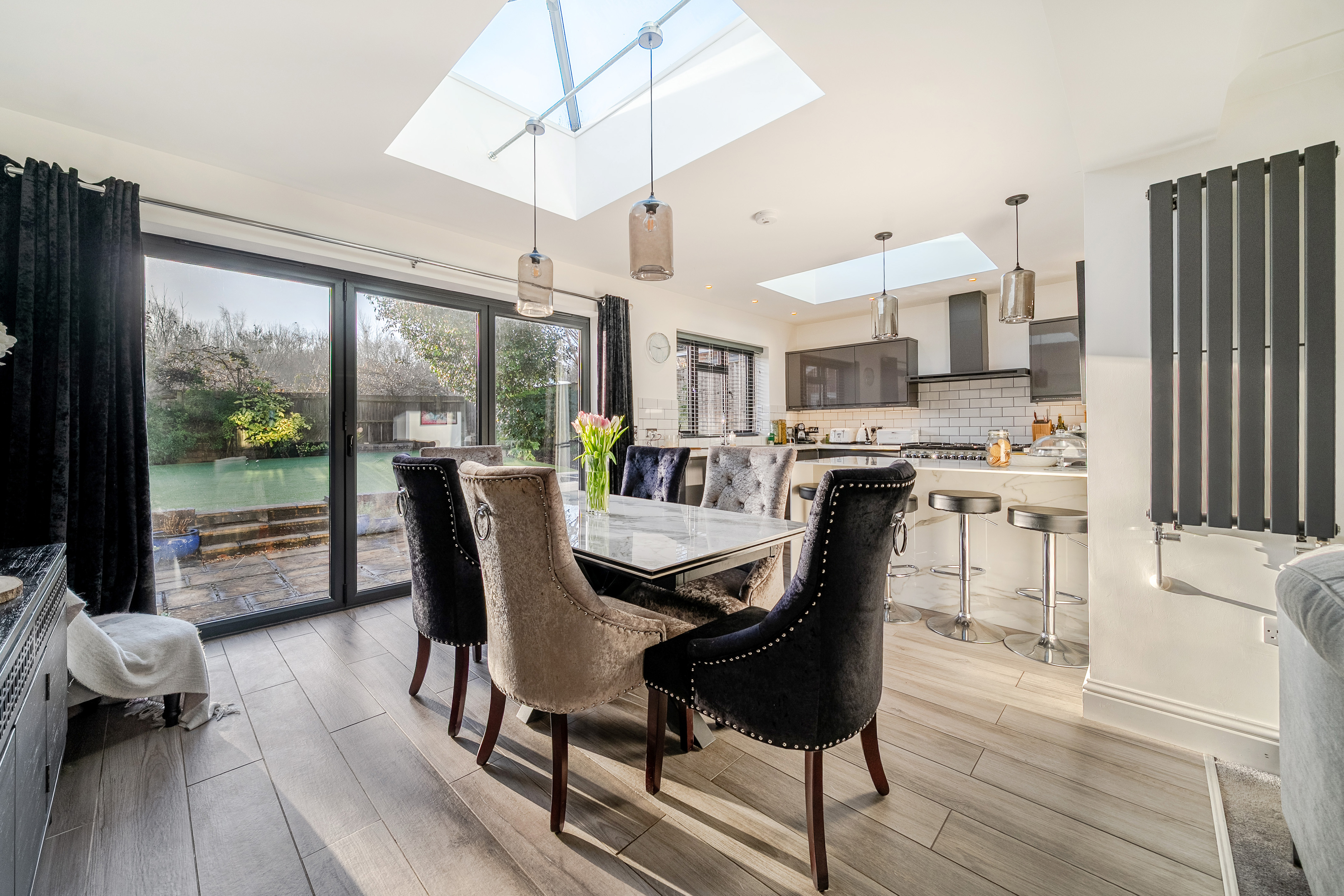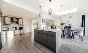 The heart of the property is the impressive bespoke open-plan kitchen, dining and living space, featuring bi-fold doors opening onto the rear garden with views beyond. The contemporary kitchen is well designed with integrated appliances, a central island and breakfast bar, and benefits from underfloor heating that continues through to the dining area.