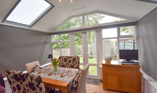 The lounge with laminate flooring, shutter blinds, understairs storage and ample space for lounge furniture. The lounge leads round to the kitchen with wall and base with heat resistant work surfaces, hob with overhead extractor, double oven and space for fridge/freezer and washing machine. The lounge also gives access to the brick built conservatory with solid roof and currently utilised as dining room with ample space for dining room furniture which was only recently built. There are UPVC double patio doors which lead out to the garden with lawned area.