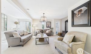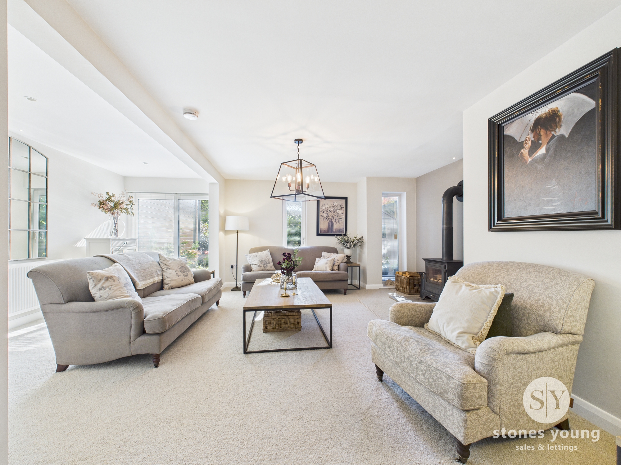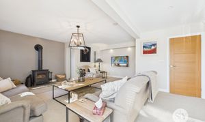 Situated on a generous plot with gardens to the front, side and rear, this immaculately presented property boasts a striking open-plan kitchen, dining and snug area with sliding doors leading out the private patio area, creating the perfect space for entertaining and everyday family life. An elegant, neutrally decorated lounge offering a calm and welcoming atmosphere, enhanced by plush carpeting underfoot for ultimate comfort. At the heart of the room sits a charming wood-burning stove, adding both character and warmth — perfect for cosy evenings in. With tasteful, neutral tones and soft textures throughout, this is a space designed for relaxation and refined living. While a utility room, ground floor WC, and internal access to the double garage add to the home's practical appeal.