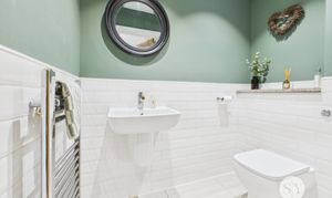 Tiled flooring, two piece in white comprising of wc, and basin, tiled splash backs, ceiling spot lights, towel radiator.