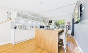 LVT flooring, fitted wall and base units with contrasting Quartz work surfaces, tiled splash backs, electric hob, Bosch electric oven, grill and combination microwave, plate warmer, central island with extractor fan, solid wood work surface , space for dining table, integrated fridge, freezer and dishwasher, ceiling spot lights, x2 sets of sliding double glazed uPVC doors, double glazed uPVC windows, x3 columns radiators.