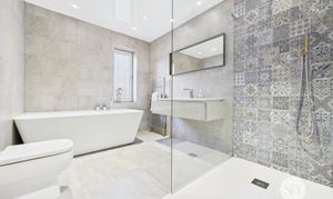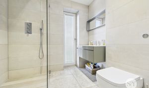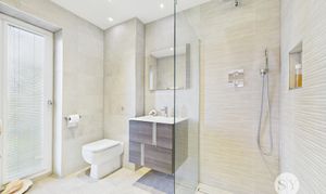 Tiled flooring with under floor heating, three piece in white comprising Porcelanosa tiles, shower, vanity unit with basin, wc and mirror, ceiling spot lights, double glazed uPVC window, towel radiator.