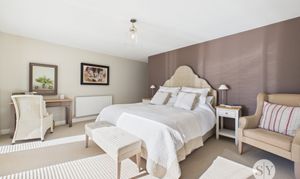 Double bedroom with carpet flooring, x3 double glazed uPVC windows, panel radiator.