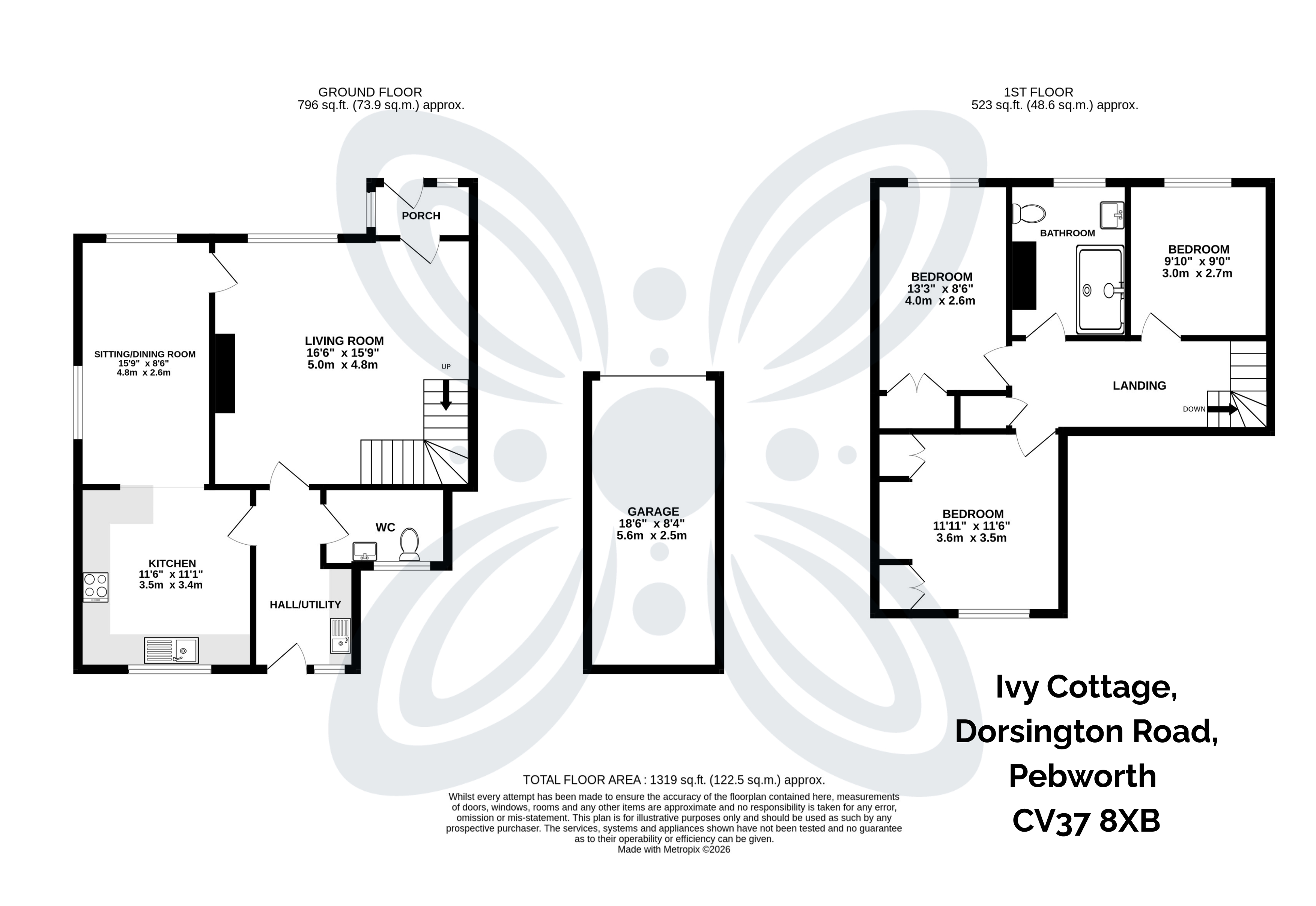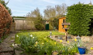 Outside, the cottage sits above an attractive front garden with mature planting. A side path leads to the rear garden, arranged with established borders, a raised lawn and a private seating area. To the rear is a single garage with power and light, plus driveway parking for two vehicles.