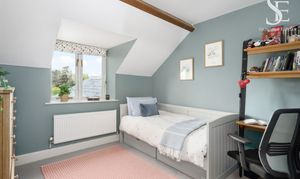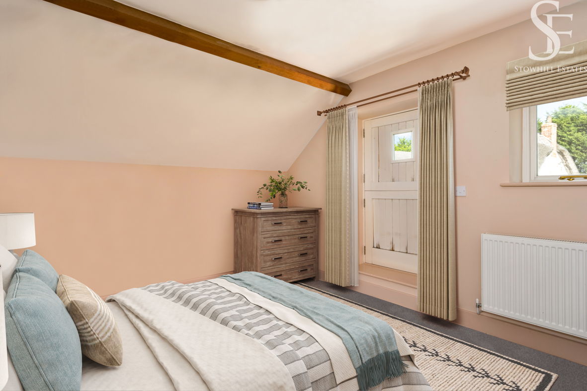 To the right, a light-filled bedroom sits beneath the sloping ceiling with front-facing views.