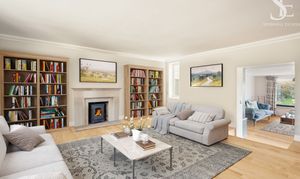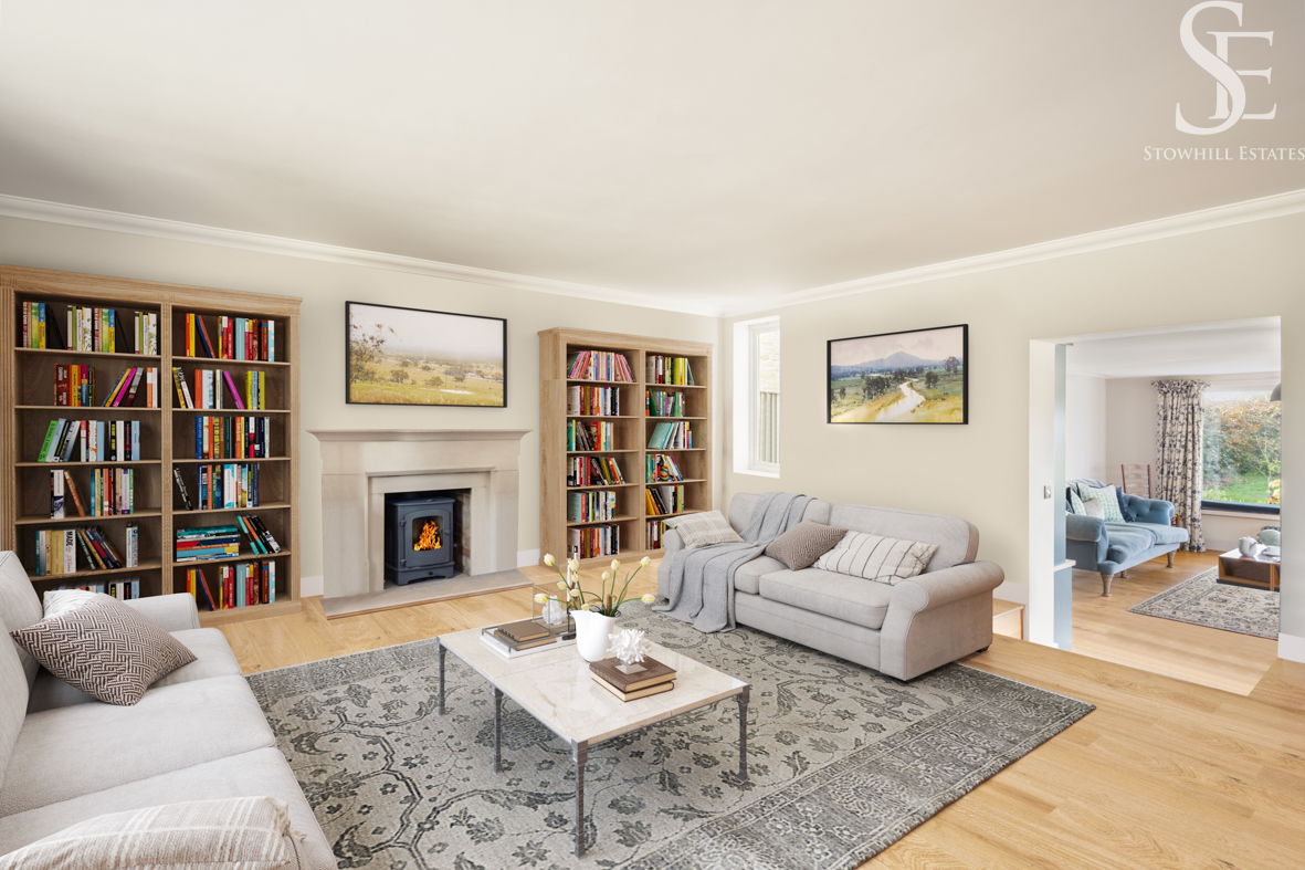 Step down into the formal sitting room, where built-in shelving and French doors create a light and welcoming space overlooking the garden and open fields.