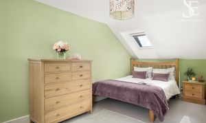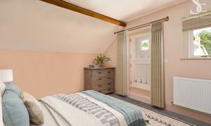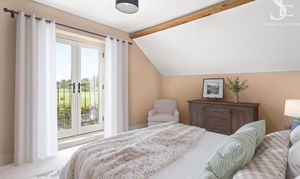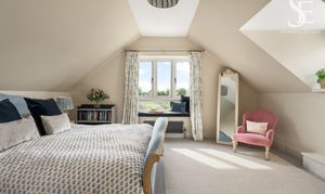 The principal suite features twin walk-in wardrobes and an en suite shower room with rainfall shower, basin and WC. The bedroom enjoys far-reaching views across the garden and fields.