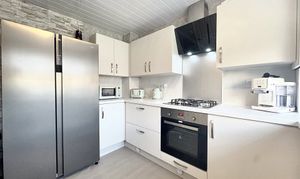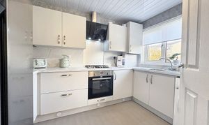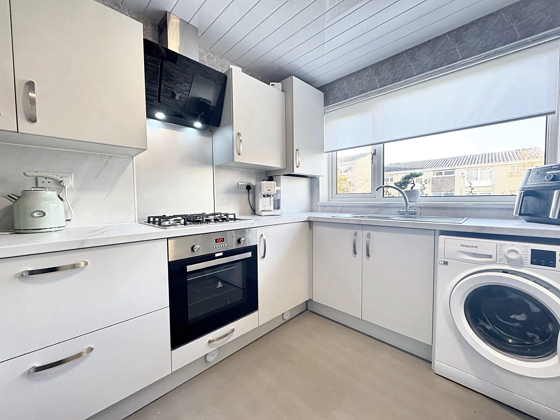 Internally, the property impresses with its bright and generous layout. The welcoming lounge provides a comfortable space to relax and entertain, seamlessly leading through to a modern refitted kitchen. The kitchen features a range of wall and floor-mounted units with complementary worktops and matching splashback, a 4-ring gas hob with stainless steel splashback and extractor hood, an oven/grill, space for a fridge-freezer, and plumbing for a washing machine.