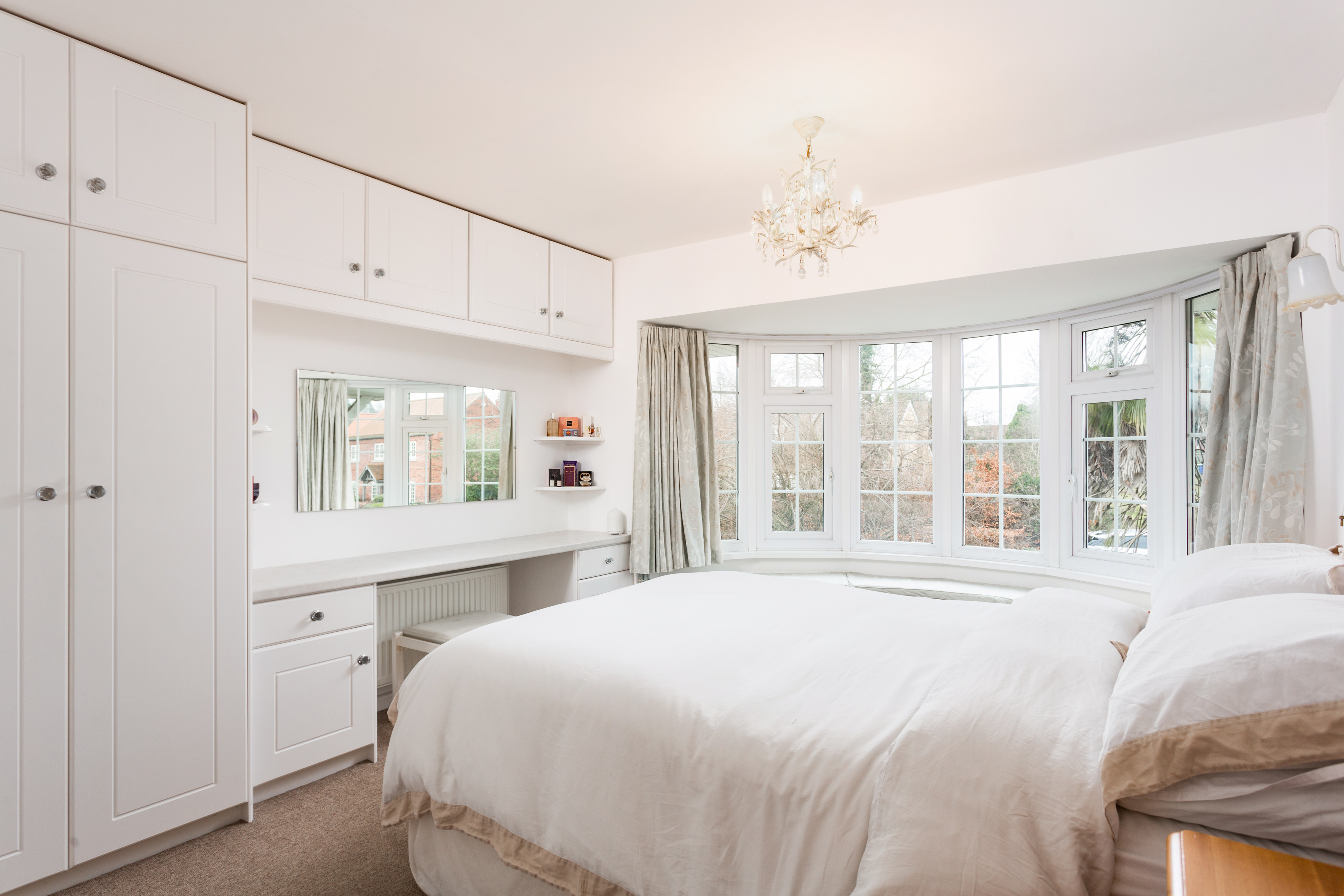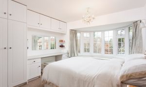The principal bedroom, positioned to the front of the property, is a generous double and features a range of bespoke fitted furniture, including wardrobes, a dressing table and a charming window seat, creating both a practical and comfortable retreat.