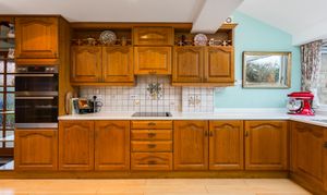 Positioned to take full advantage of the setting, the kitchen is fitted with a range of timber wall and base units and includes integrated appliances such as a washing machine, oven and double eye level hob. A large window above the sink frames the truly spectacular open views, a feature that elevates this space beyond the practical. The room is well-sized, offering space for a dining table and additional furniture such as the built-in dresser, making it ideal for everyday use.