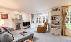 To the front of the property, a generously proportioned sitting room enjoys a lovely sense of privacy thanks to the mature hedge screening the frontage. A large bay window is complemented by an arched secondary window, allowing light to flood in while maintaining a peaceful outlook. The room centres around an open fireplace with limestone surround and hearth, creating a warm focal point, and there is useful storage beneath the stairs. This is a comfortable, well-balanced room with ample space for family living and entertaining.