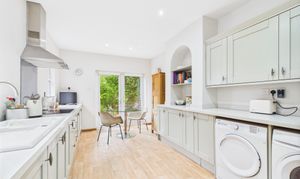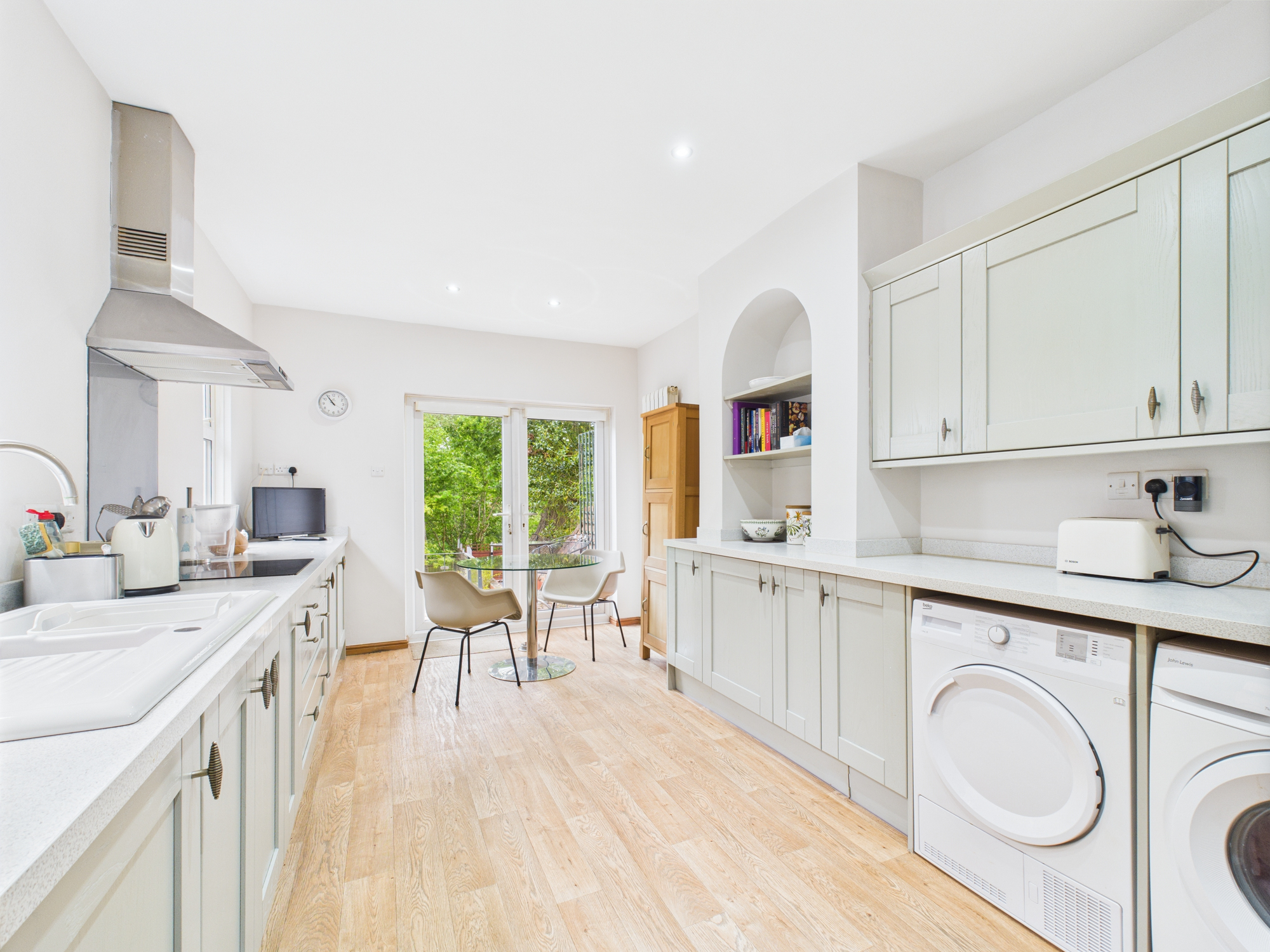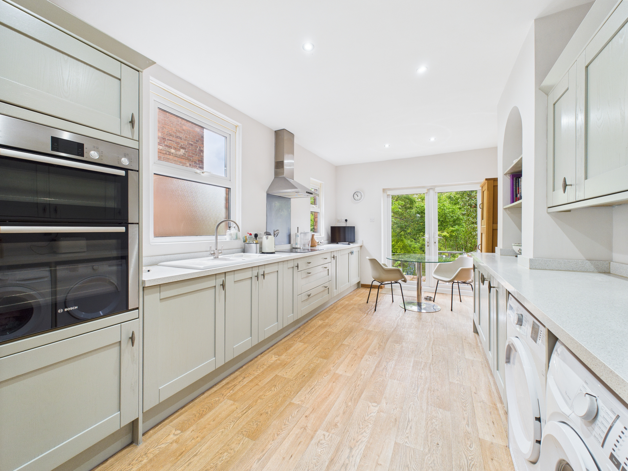 To the rear, the breakfast kitchen is fitted with a range of modern units featuring pull-out storage solutions and includes space for a casual dining table beside French doors. Integrated appliances comprise a Bosch double oven, an induction hob with extractor and a fridge/freezer, while there is space for a freestanding washer and separate dryer (current appliances may be available by negotiation). A useful cellar with lighting is also accessible from the kitchen.