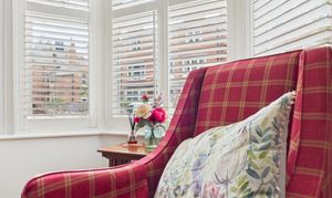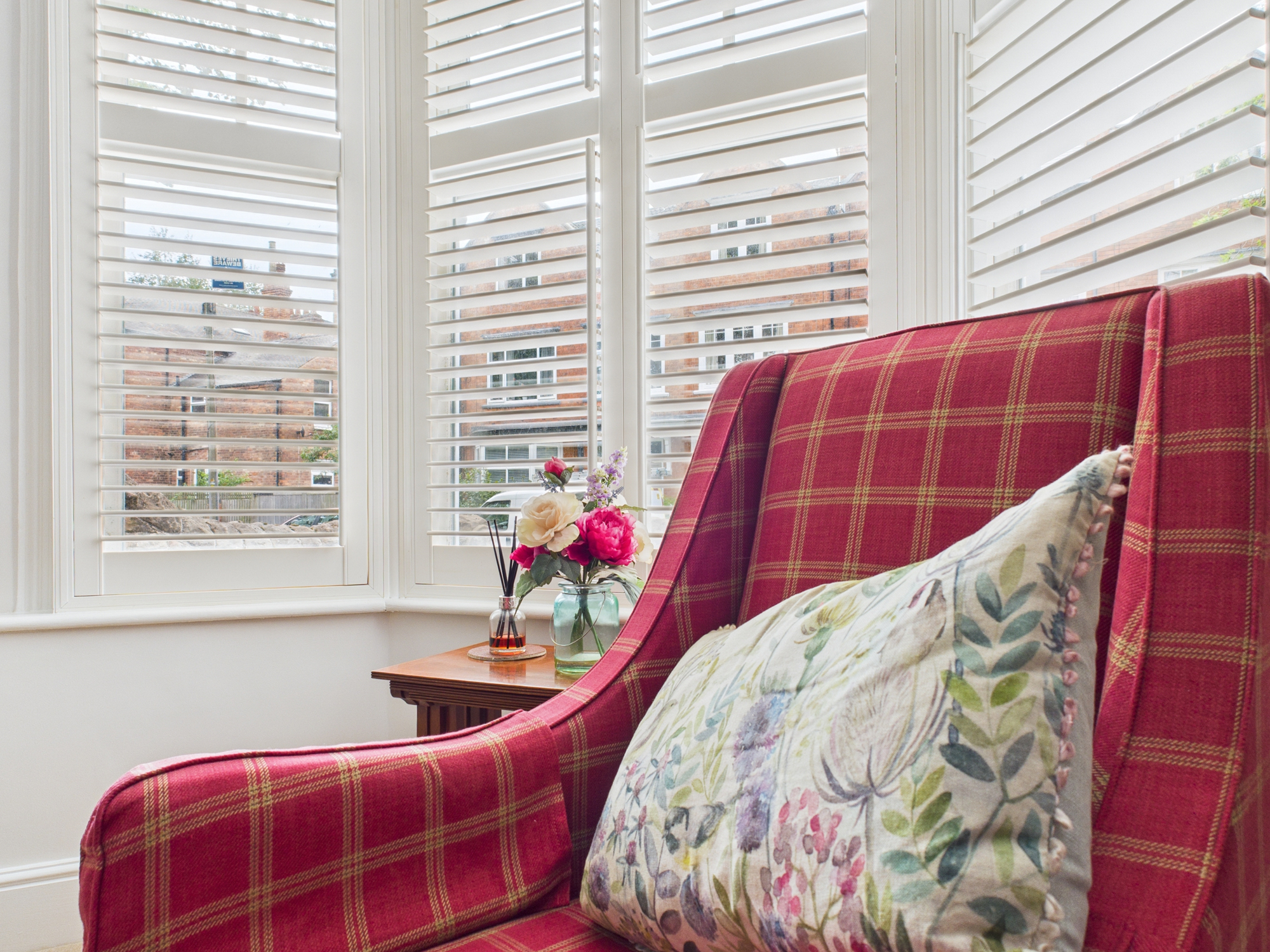 - Bright and spacious lounge with a feature fireplace and fitted shutters