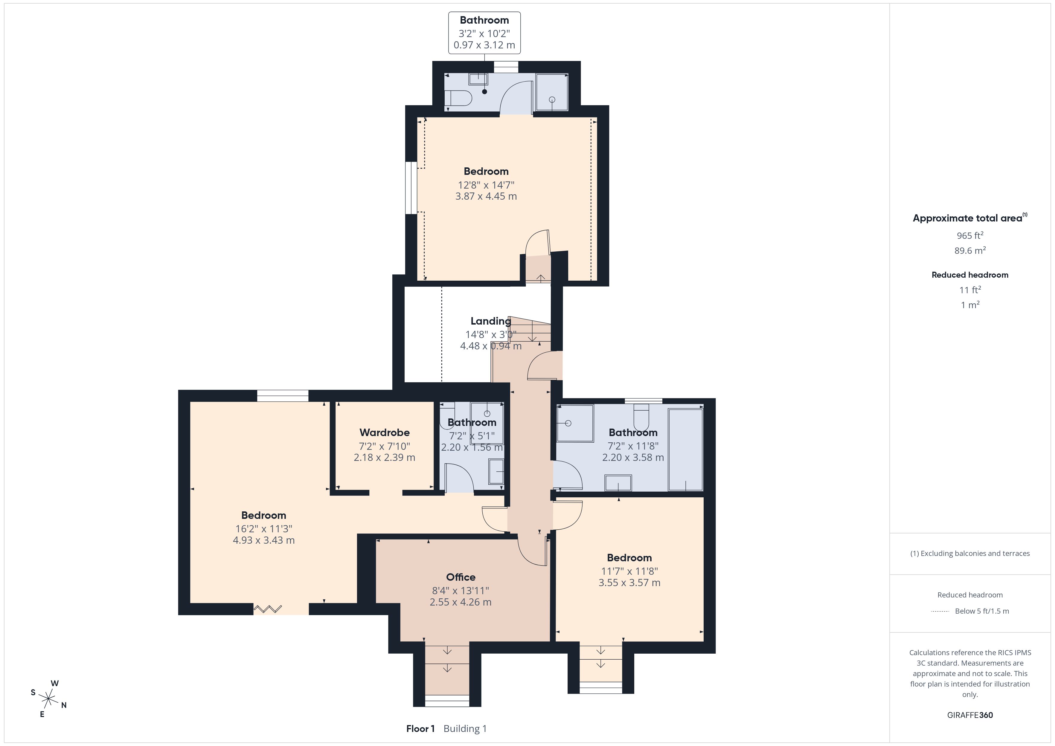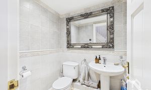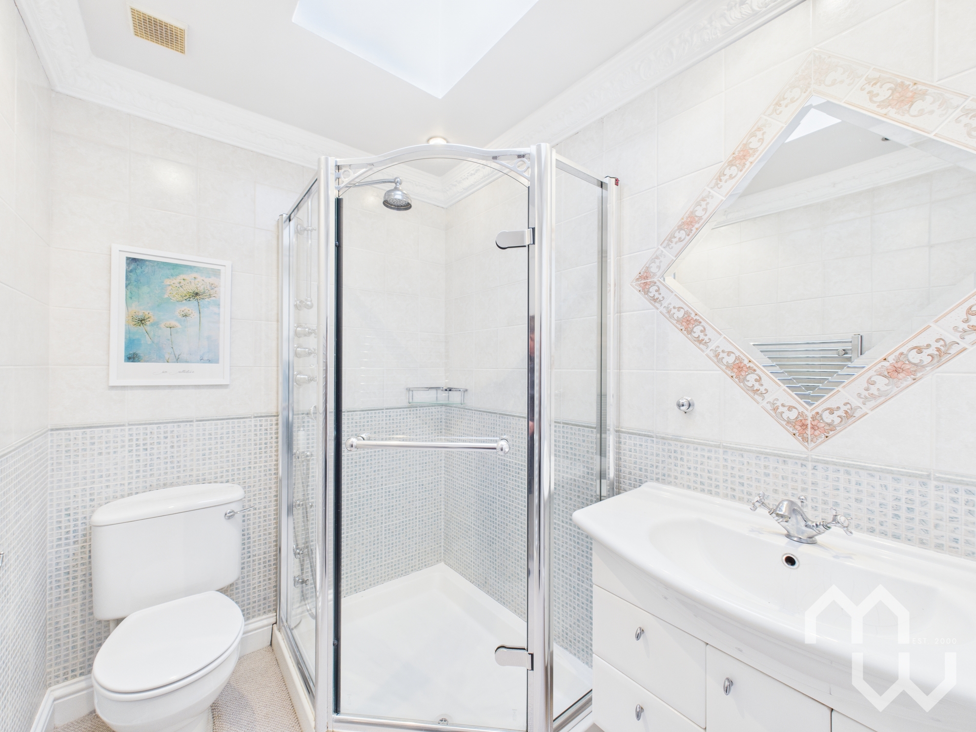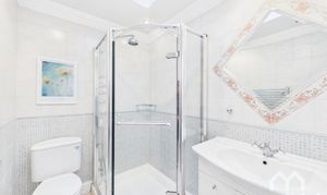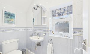 Vanity wash hand basin. Mains shower. Low level WC. Fully tiled walls. Velux window.