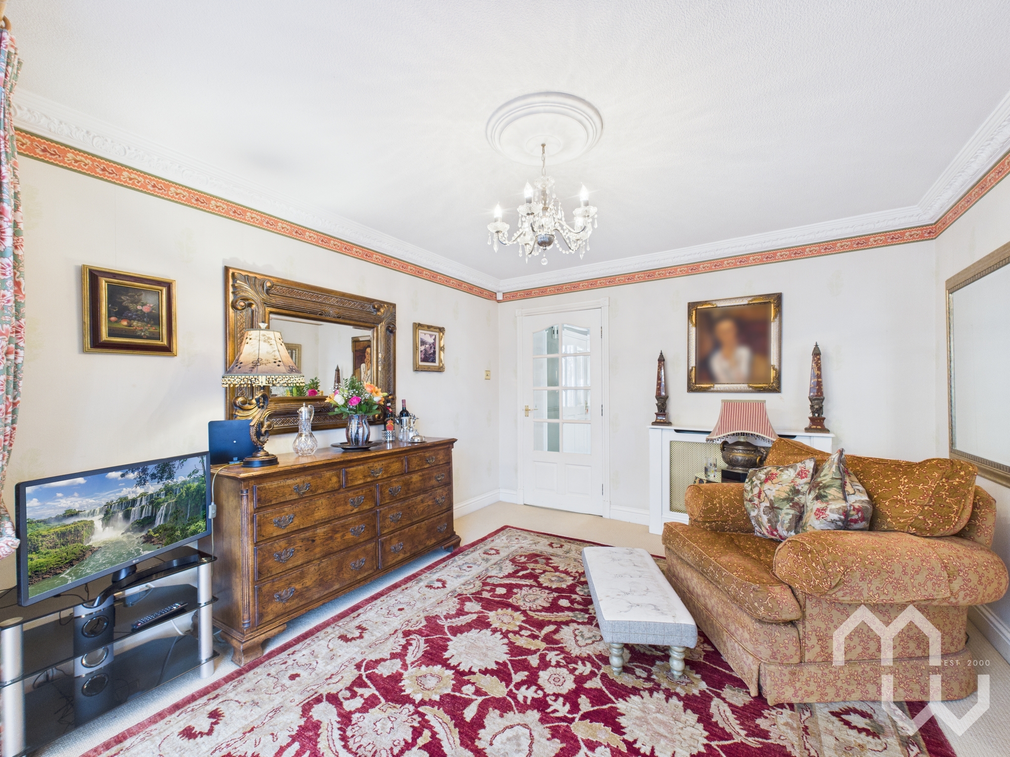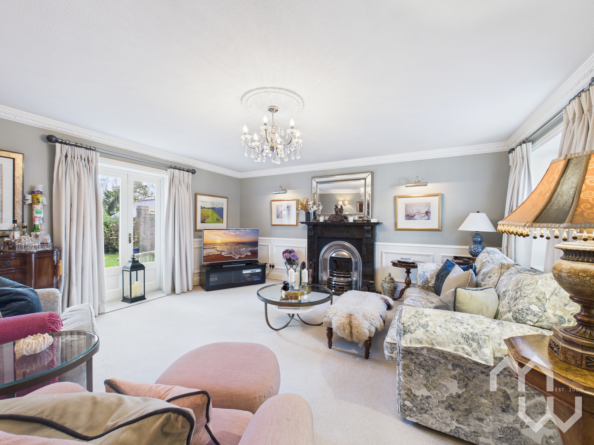 Gas fireplace. Beautiful ceiling rose. French doors to rear. Window to front.