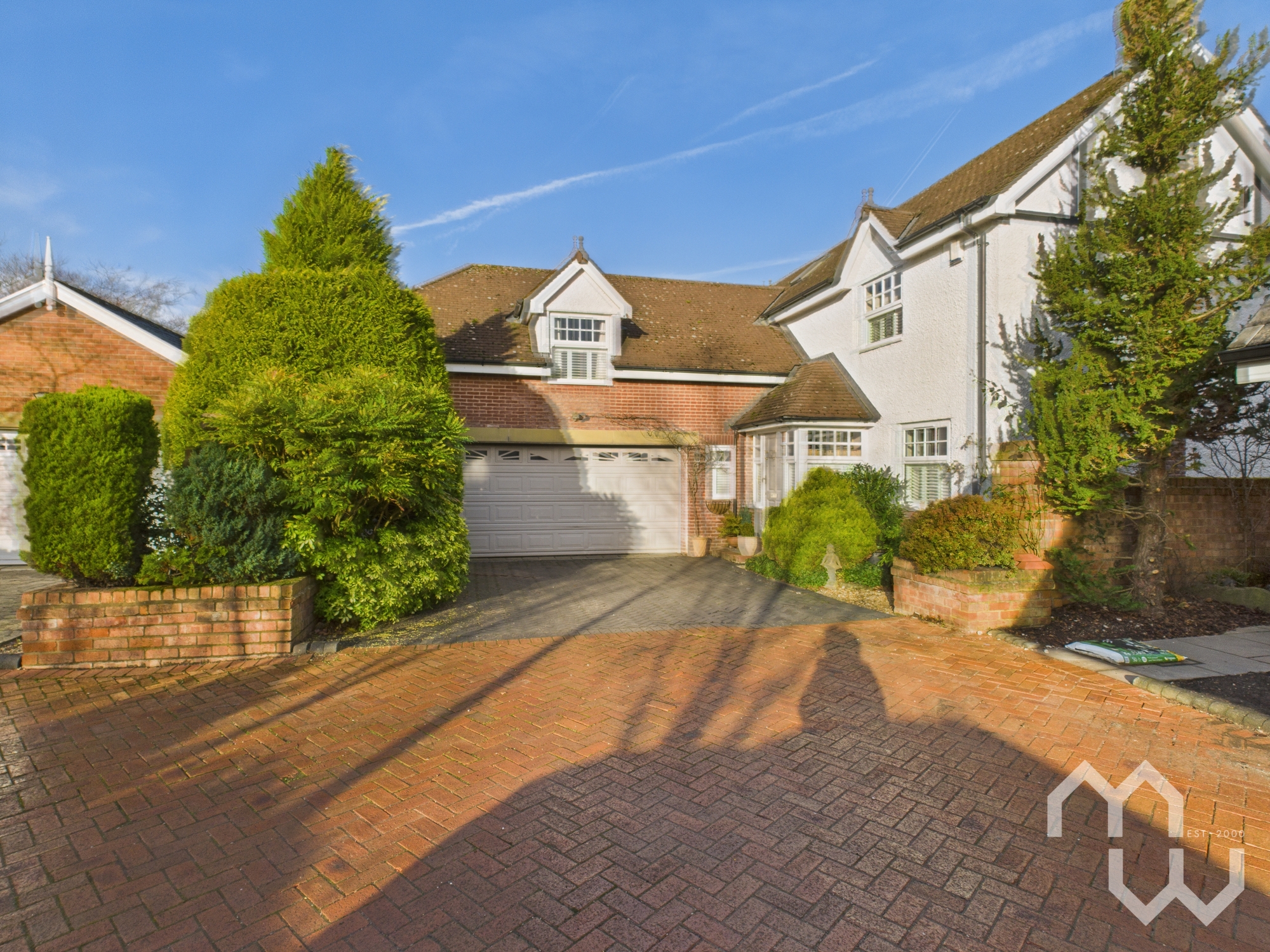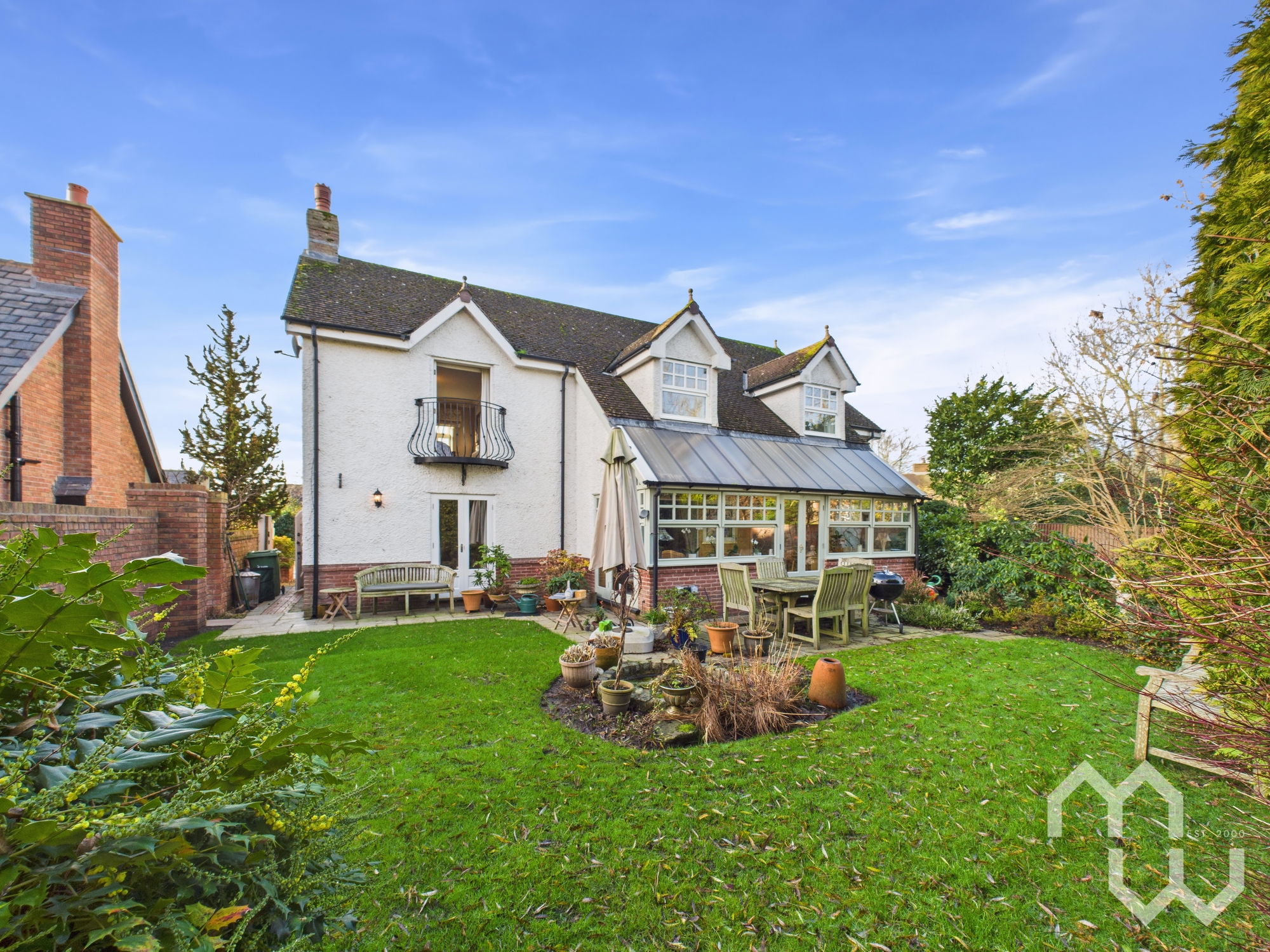 Outside, the rear garden has been thoughtfully landscaped to create a series of inviting seating areas alongside a well-kept lawn and mature planting — ideal for entertaining, relaxing or family life. Multiple access points enhance the connection between house and garden, while the attached double garage and ample driveway parking ensure everyday convenience.