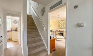 The property is approached via off-road parking and opens into a welcoming hallway with stairs rising to the first floor and access to a guest WC. The lounge, with its dual aspect, is a cosy and inviting space — ideal for relaxing after a long day.
