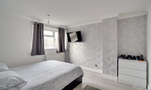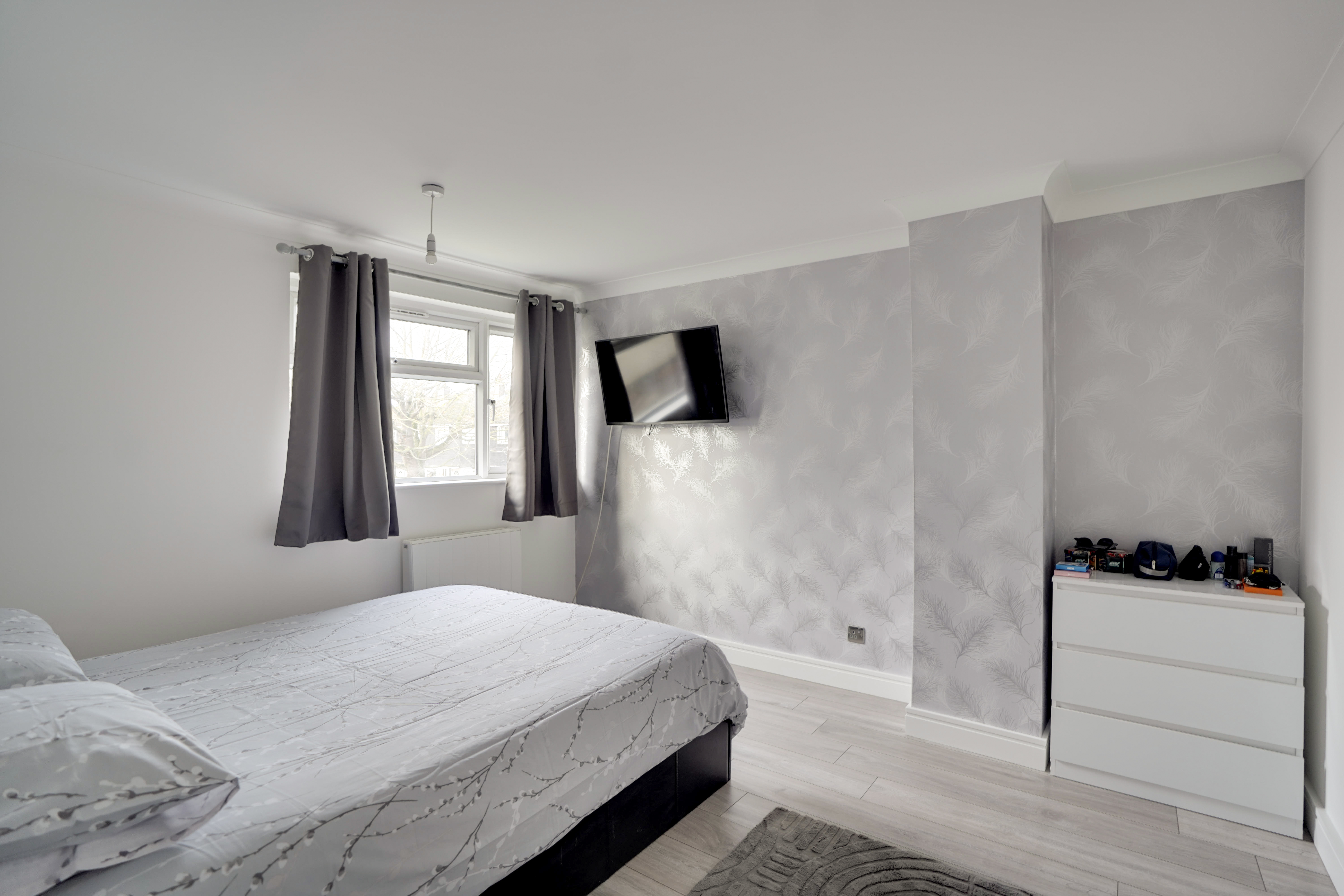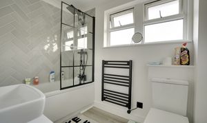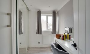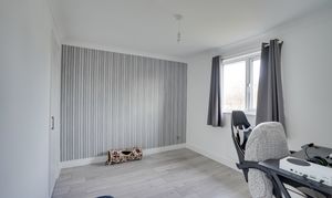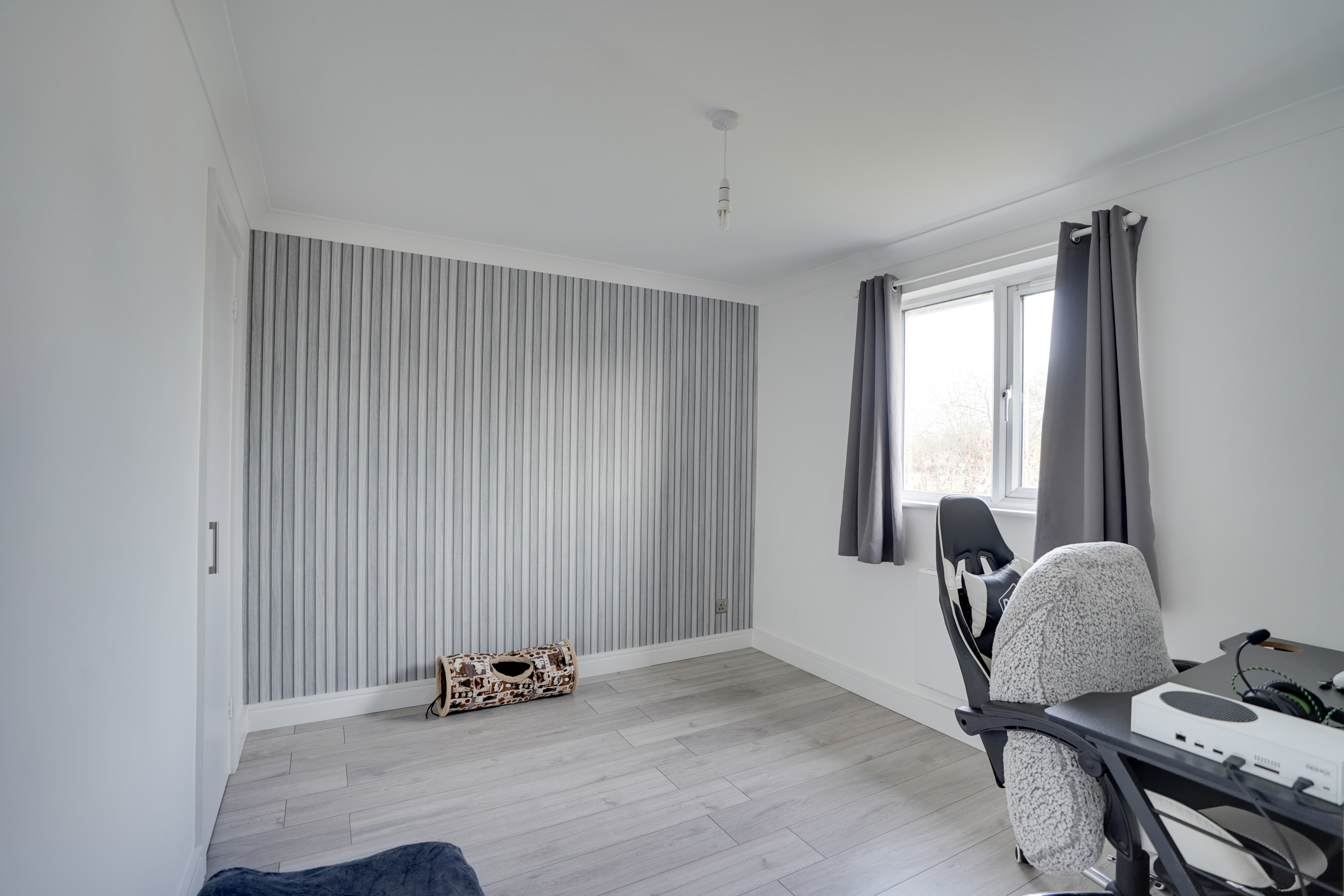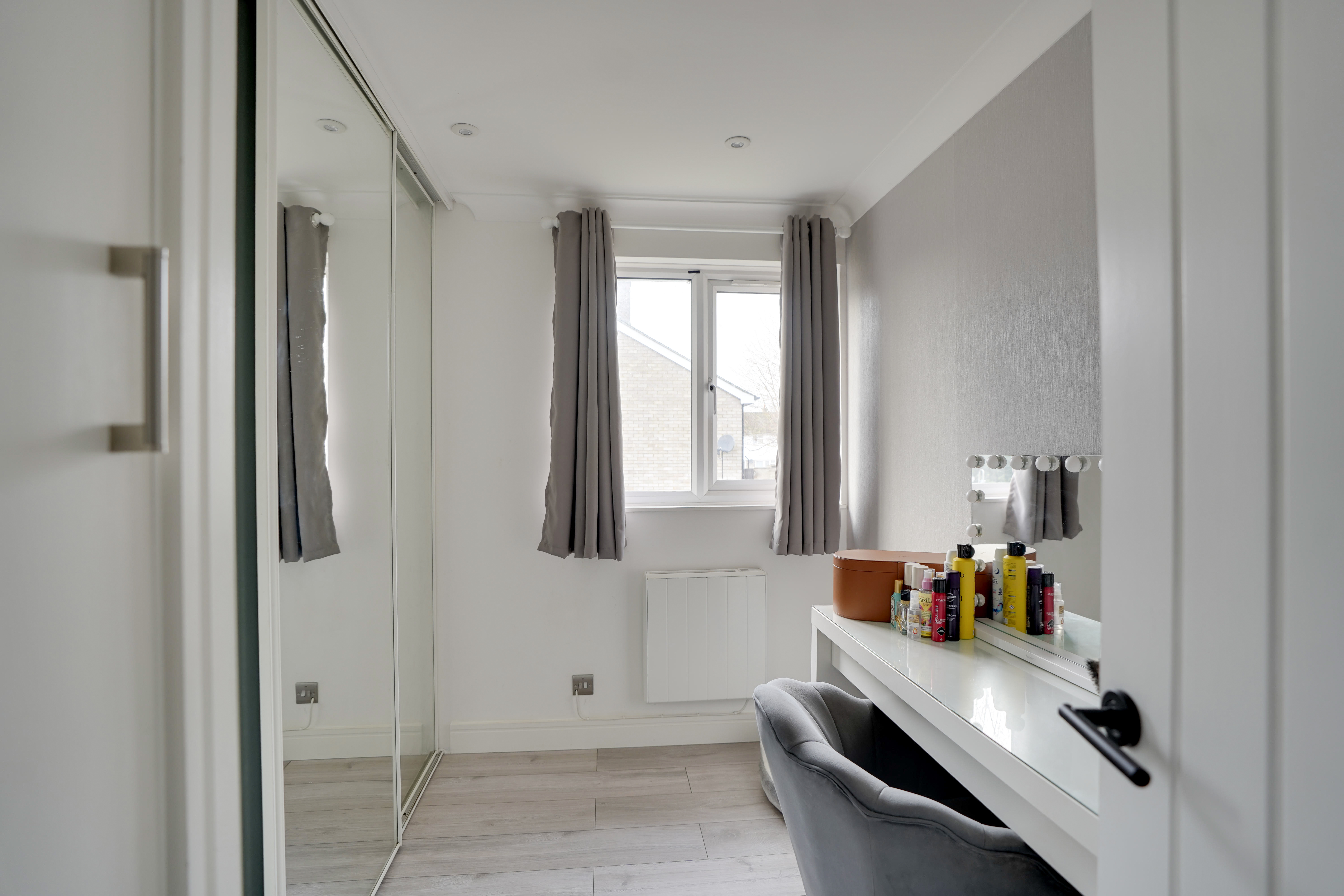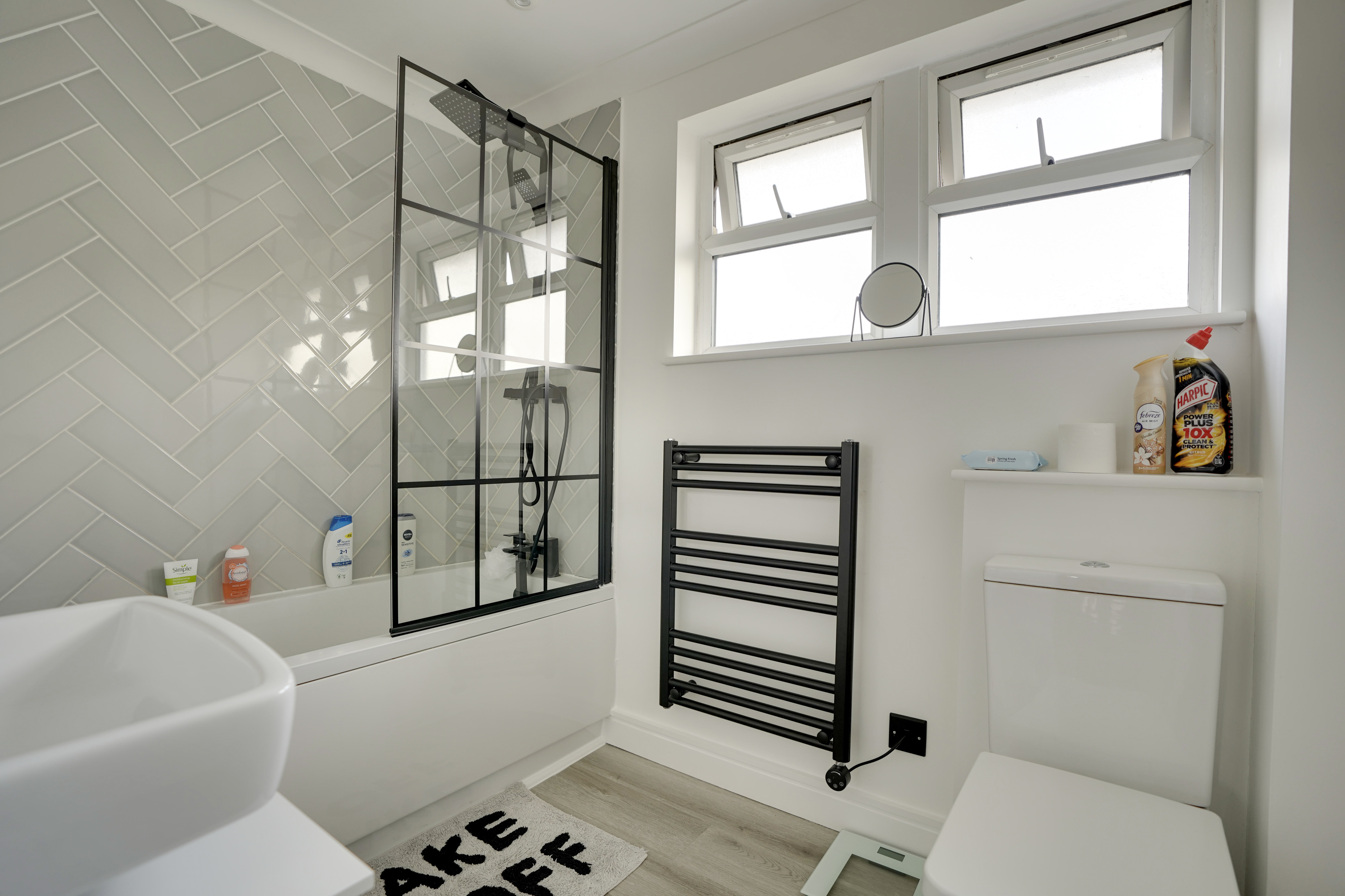 Upstairs, the property offers two generous double bedrooms, both benefiting from built-in storage, along with a third single bedroom that would be ideal as a child’s room, nursery, or home office. The newly installed bathroom features a panelled bath with a rainfall shower head over, along with a WC, wash basin, and heated towel rail, finished to a contemporary standard.