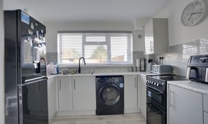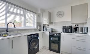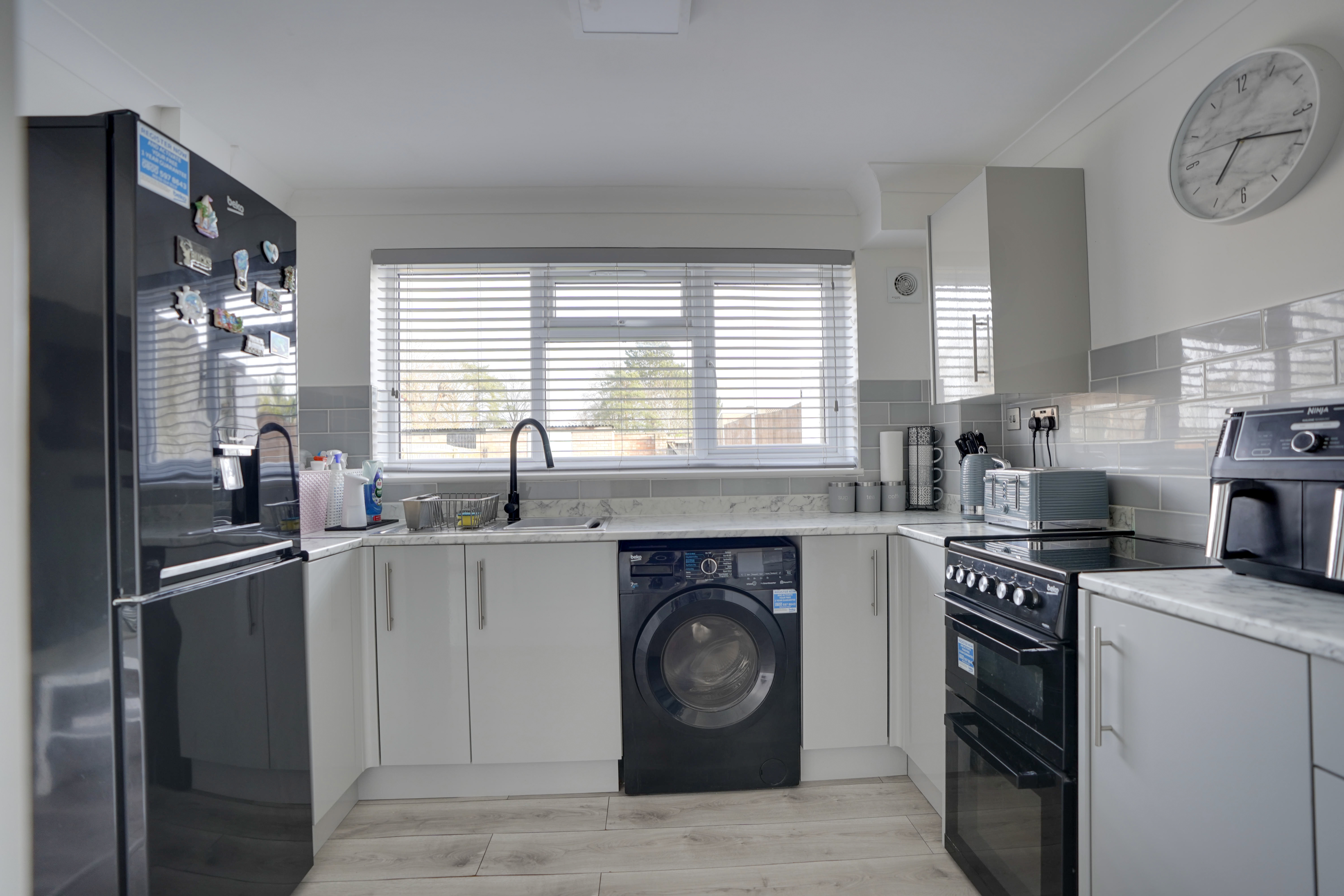 The newly fitted kitchen offers a modern range of wall and base mounted units, complemented by a 1½ stainless steel sink with mixer tap. There is space for a fridge freezer and washing machine, along with space for an oven, making the kitchen both practical and well laid out.