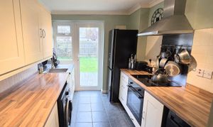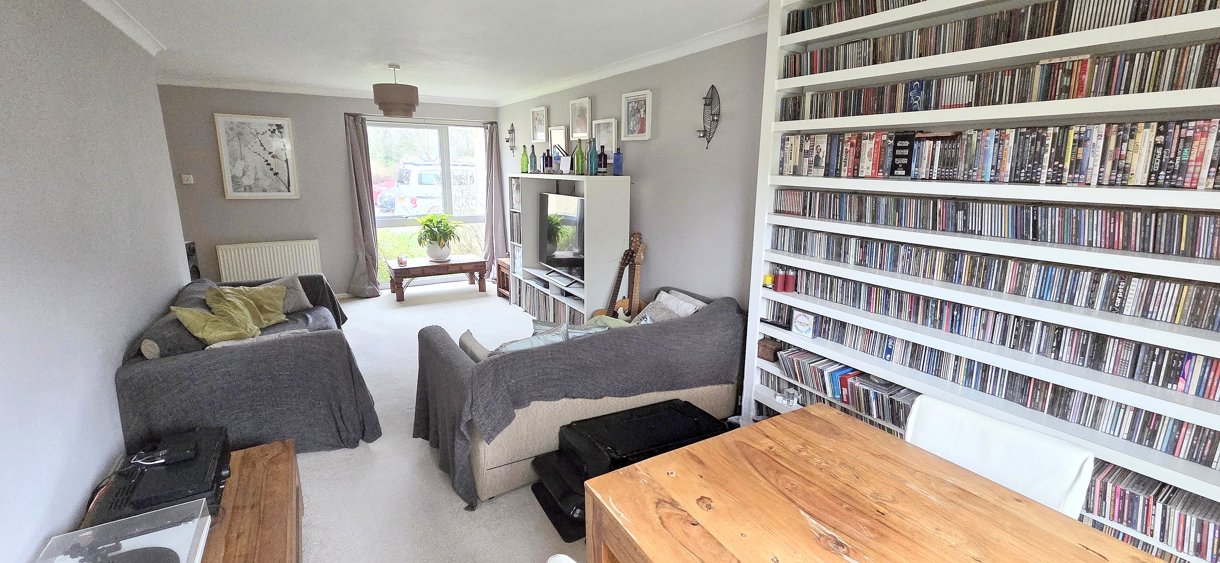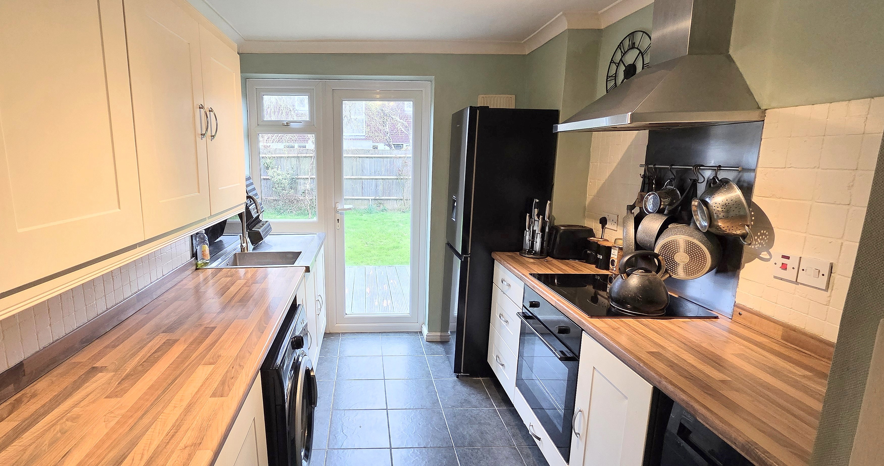 Useful Entrance Porch with deep storage cupboard (potential for conversion in Cloakroom/WC). Inner door into the Reception Hall stairs to first floor and side window. Front to back double aspect Sitting / Dining Room with extensive fitted shelving and sliding patio doors to garden. Re-fitted Kitchen with with space for appliances.