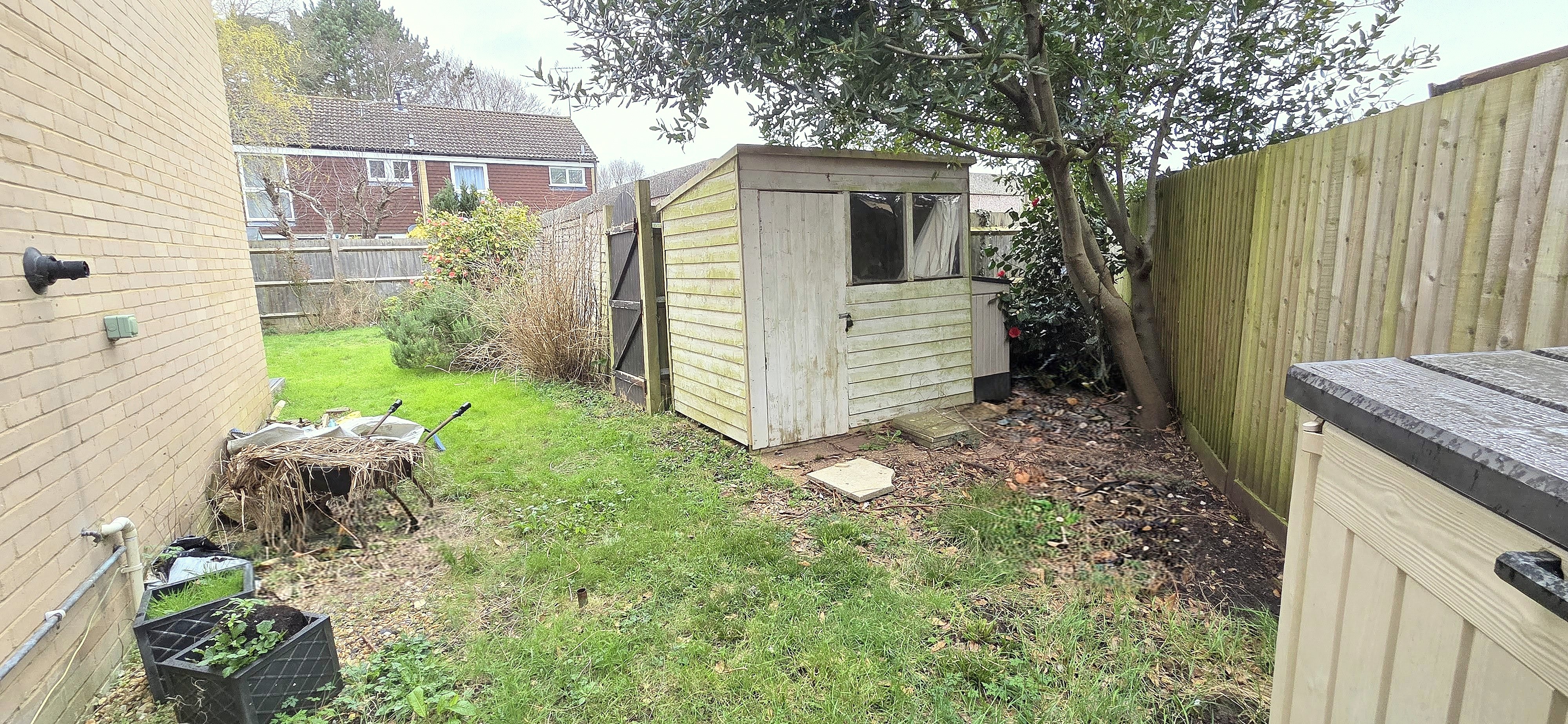 30' x 30' enclosed Rear Garden laid to timber decking and lawn, plus side area of triangular garden, ideal space for shed/storage + side gate to garage block + gate to front.