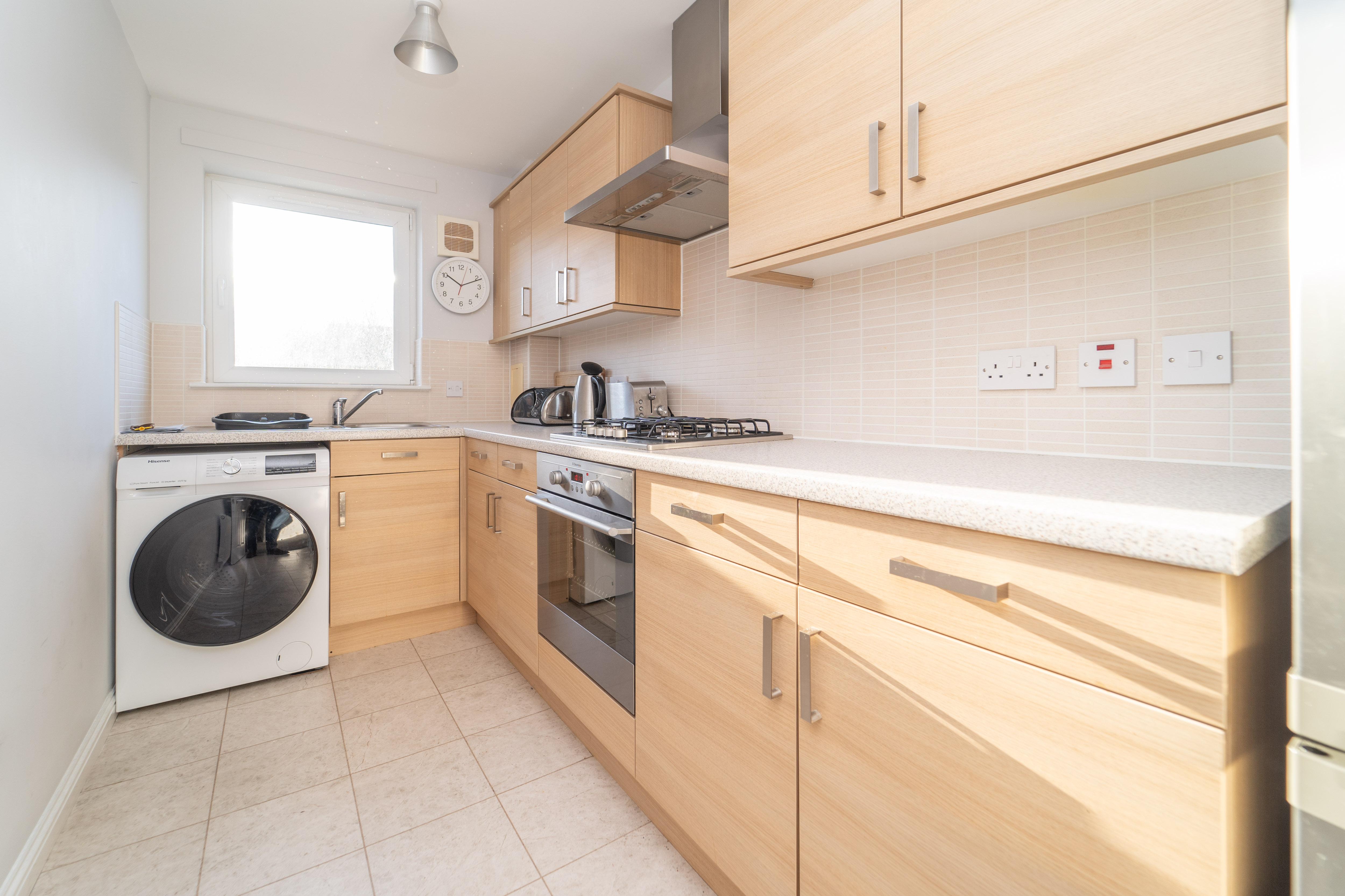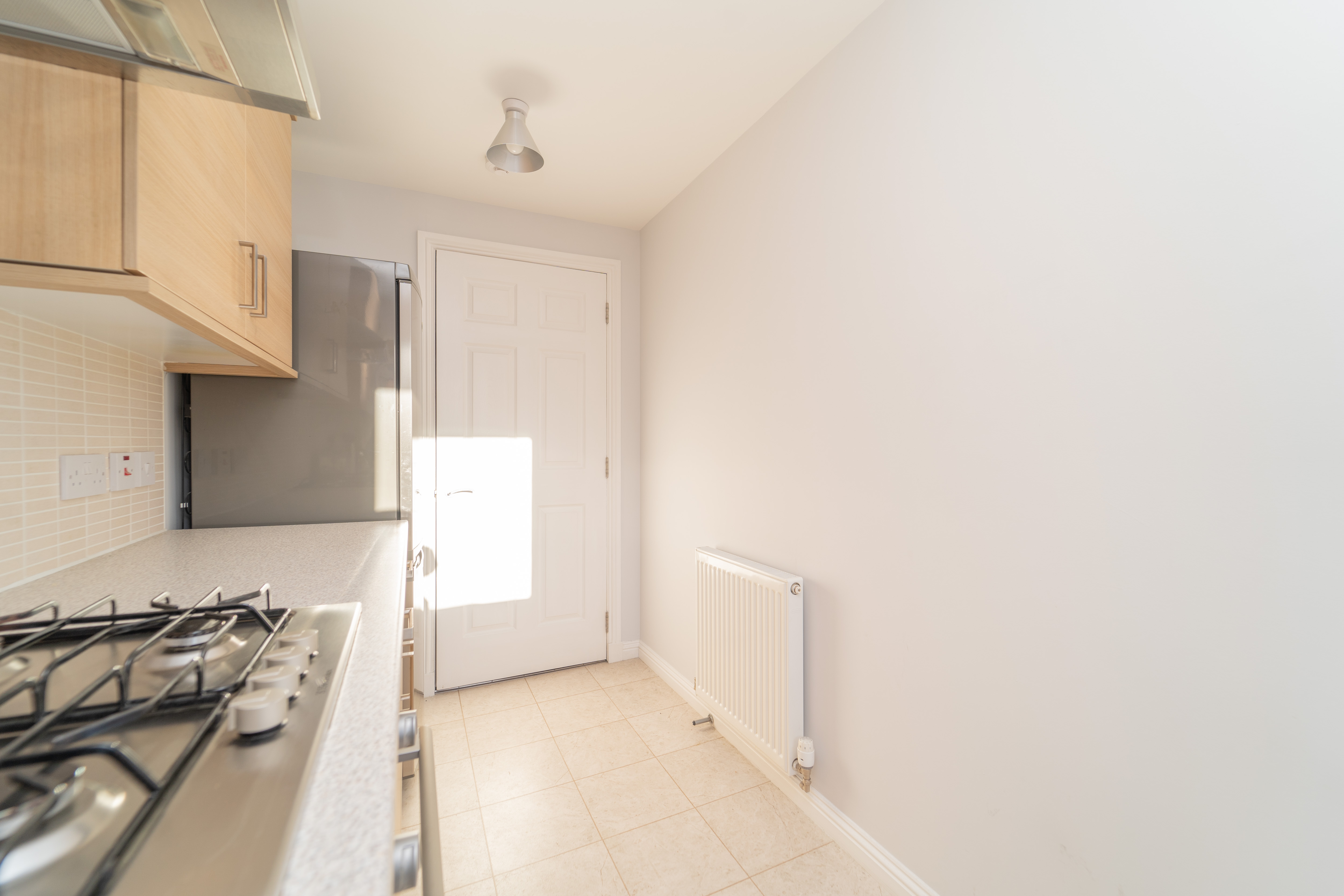 The modern kitchen has several wall and floor mounted units with wood effect frontages which are complimented by light grey laminate work surfaces and up tiled splashback. The décor is finished with light grey painted walls and cream tile effect vinyl to the floor. There is an under counter oven, a built in four ring gas hob, a stainless steel extractor hood, a tall fridge freezer and an under counter washing machine, which will be included in the sale. The sink area comprises of a mixer tap over a stainless-steel sink with drainer. A window to the front allows natural light into the room. Two ceiling lights illuminate the space. A heat detector, a further extractor fan, a radiator and power points complete this room.