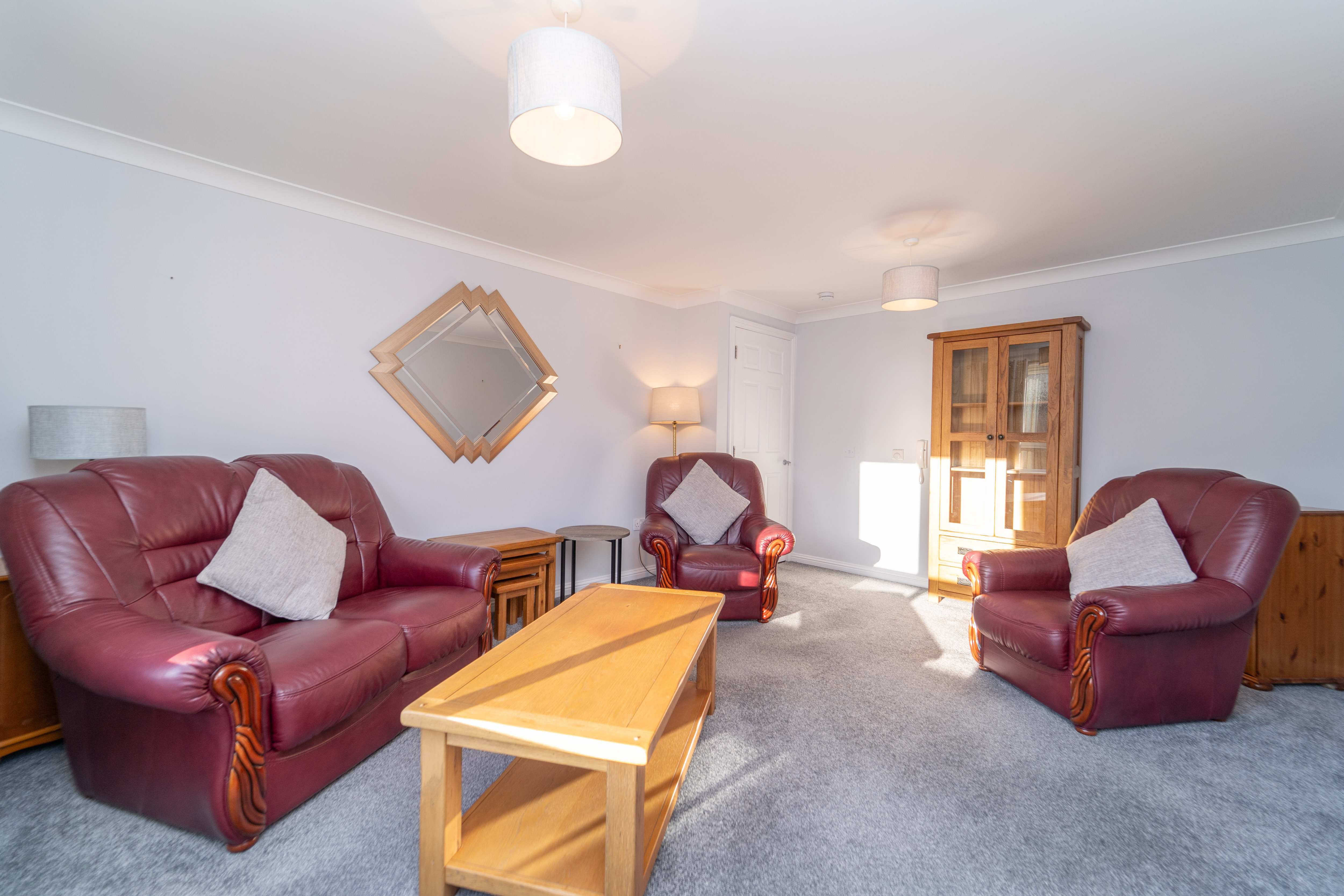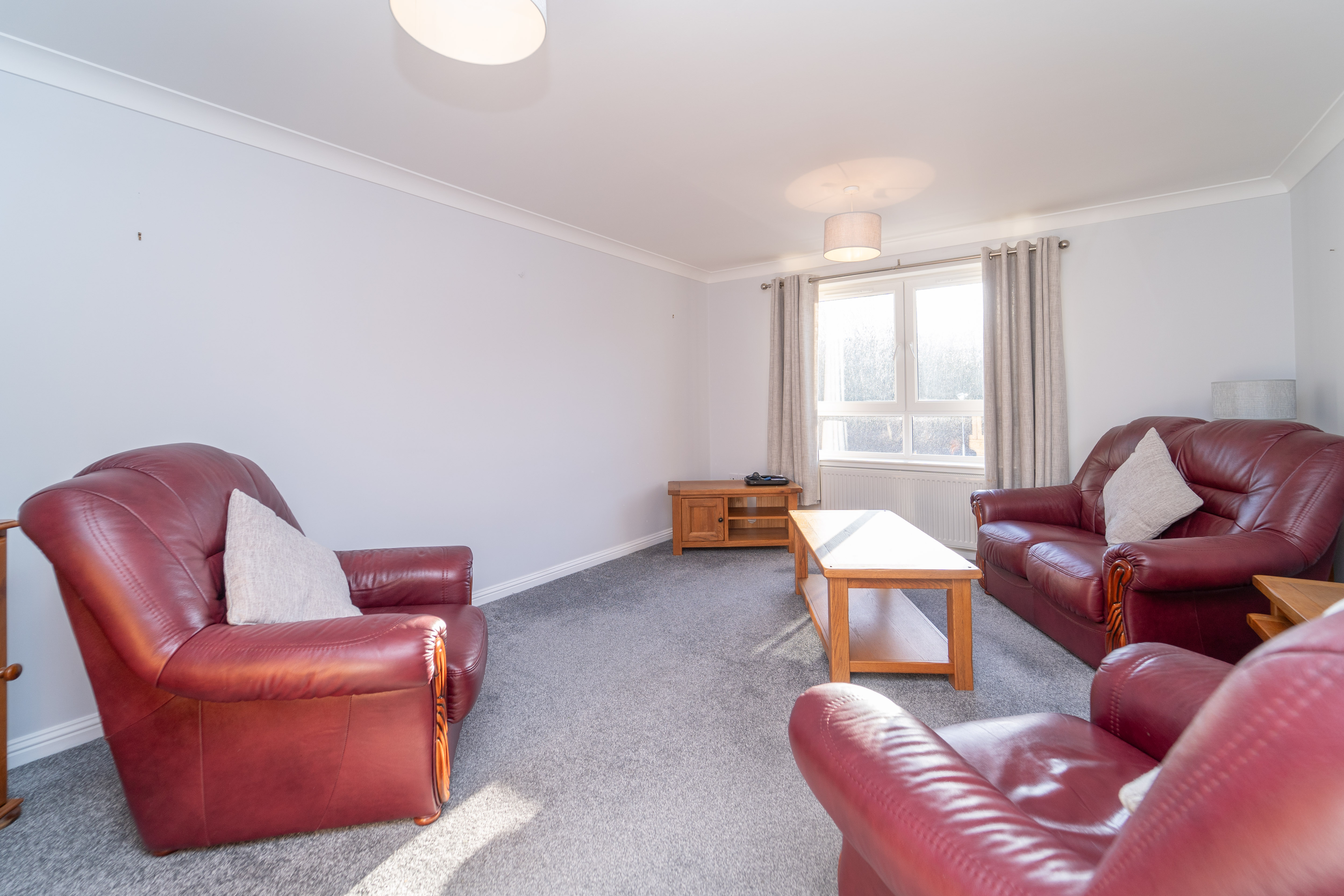 Entrance to the building is through a secure glazed wooden door, leading along the carpeted corridor to the wooden door of the property. The modern décor begins with light grey painted walls and carpet to the floor. There is a large cupboard for storage found in the hall. There are two ceiling lights, a smoke detector, a radiator, and power points to complete this area.