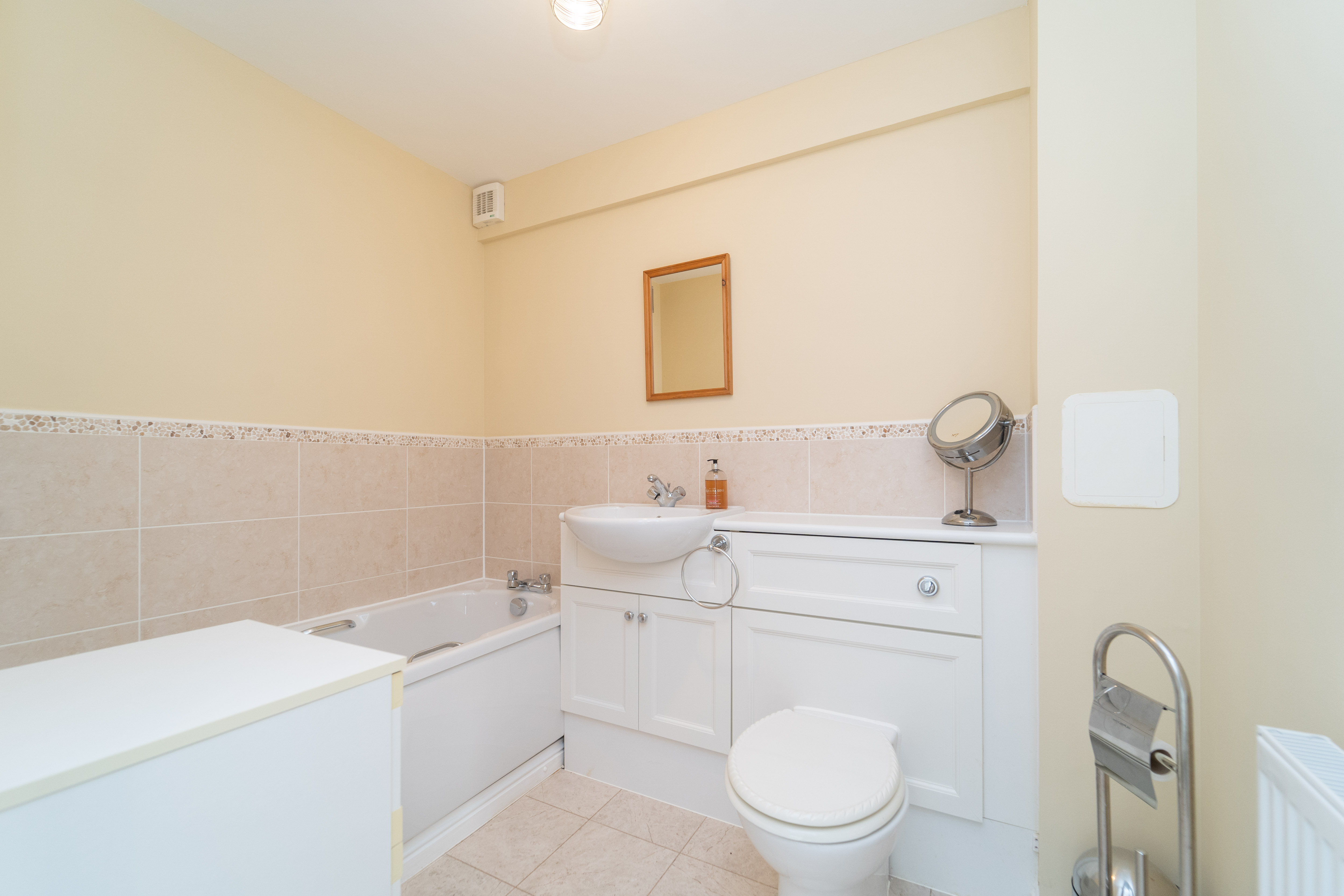 The bathroom boasts a white 3-piece suite comprising of a bath, a built in vanity unit with inbuilt sink and back to wall toilet. Finished with neutral tiles around the bath and vanity splashback, with the remaining walls cream painted. There is cream tile effect vinyl to the floor. A ceiling light, an extractor fan and a radiator are also provided.