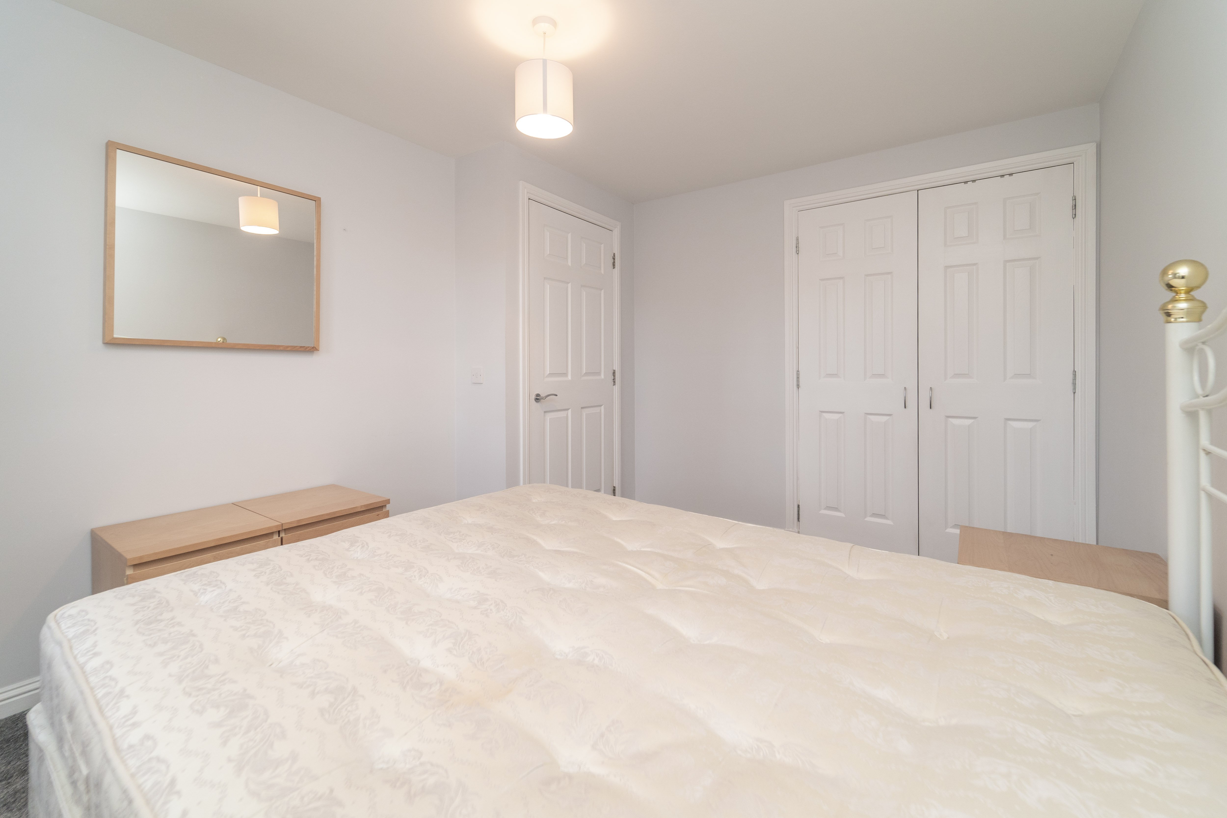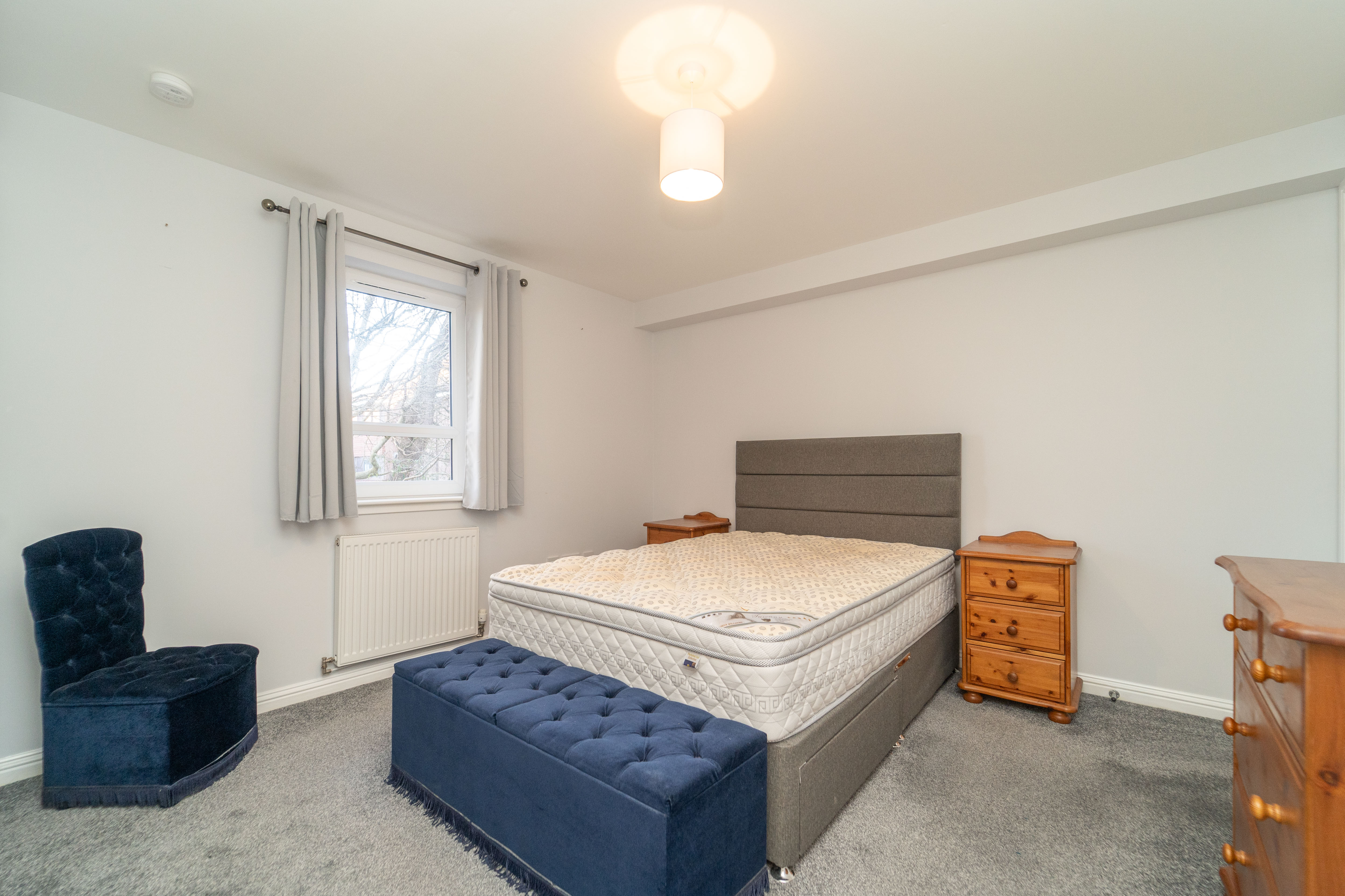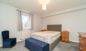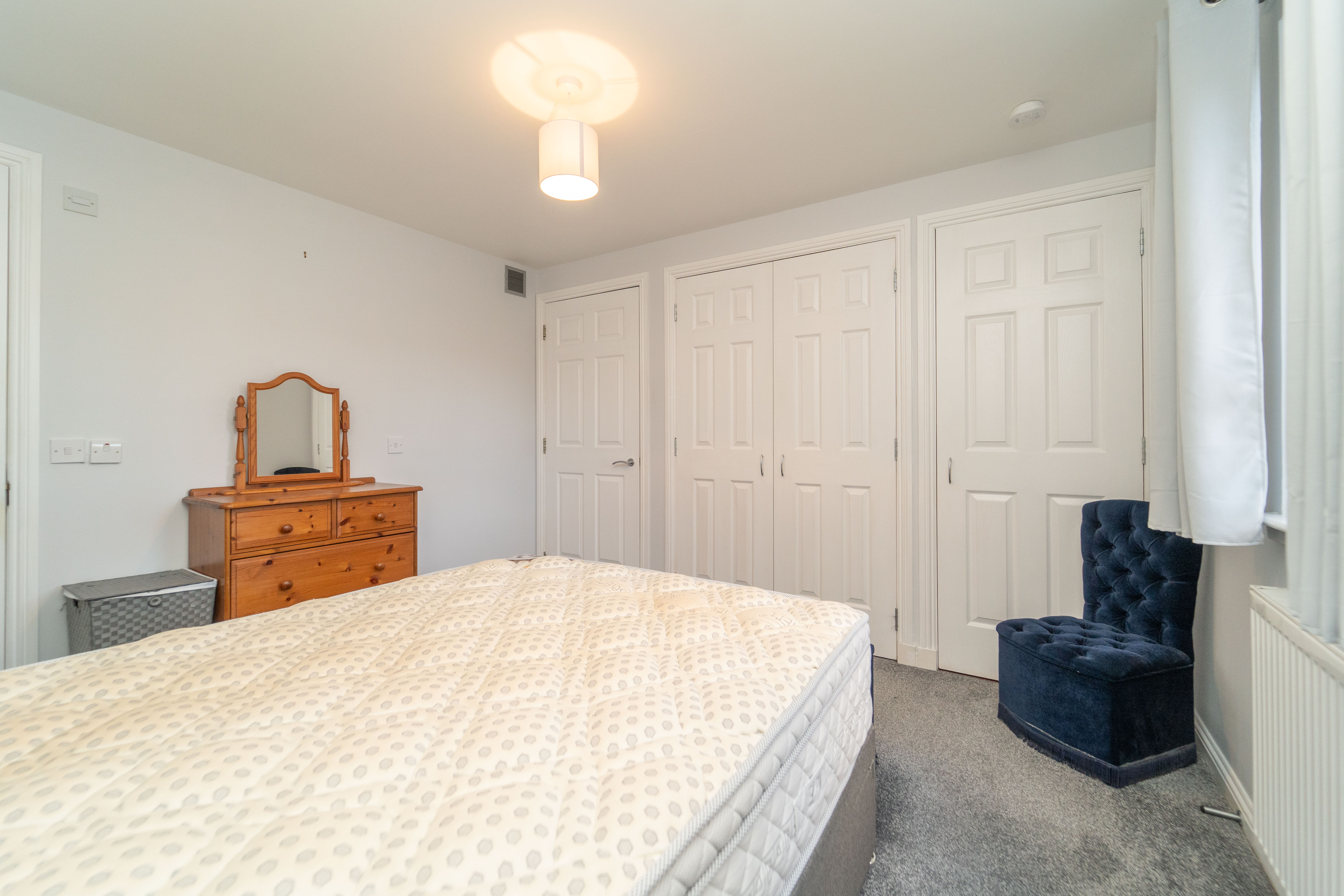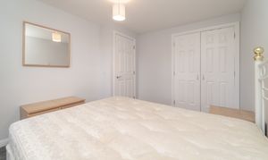 A wonderful room which is finished with light grey painted walls and carpet to the floor. The window to the rear allows in natural light and is complemented by a ceiling light. A built-in wardrobe provides an abundance of hanging and shelving space, alongside an additional storage cupboard. A radiator, a smoke detector, and power points complete the room.