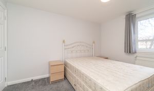The delightful second double bedroom is finished with light grey painted walls and carpet to the floor. The rear facing window allows in natural light and is enhanced by a ceiling light. A built in wardrobe provides hanging and shelving storage space. A radiator and power points finish off this space.